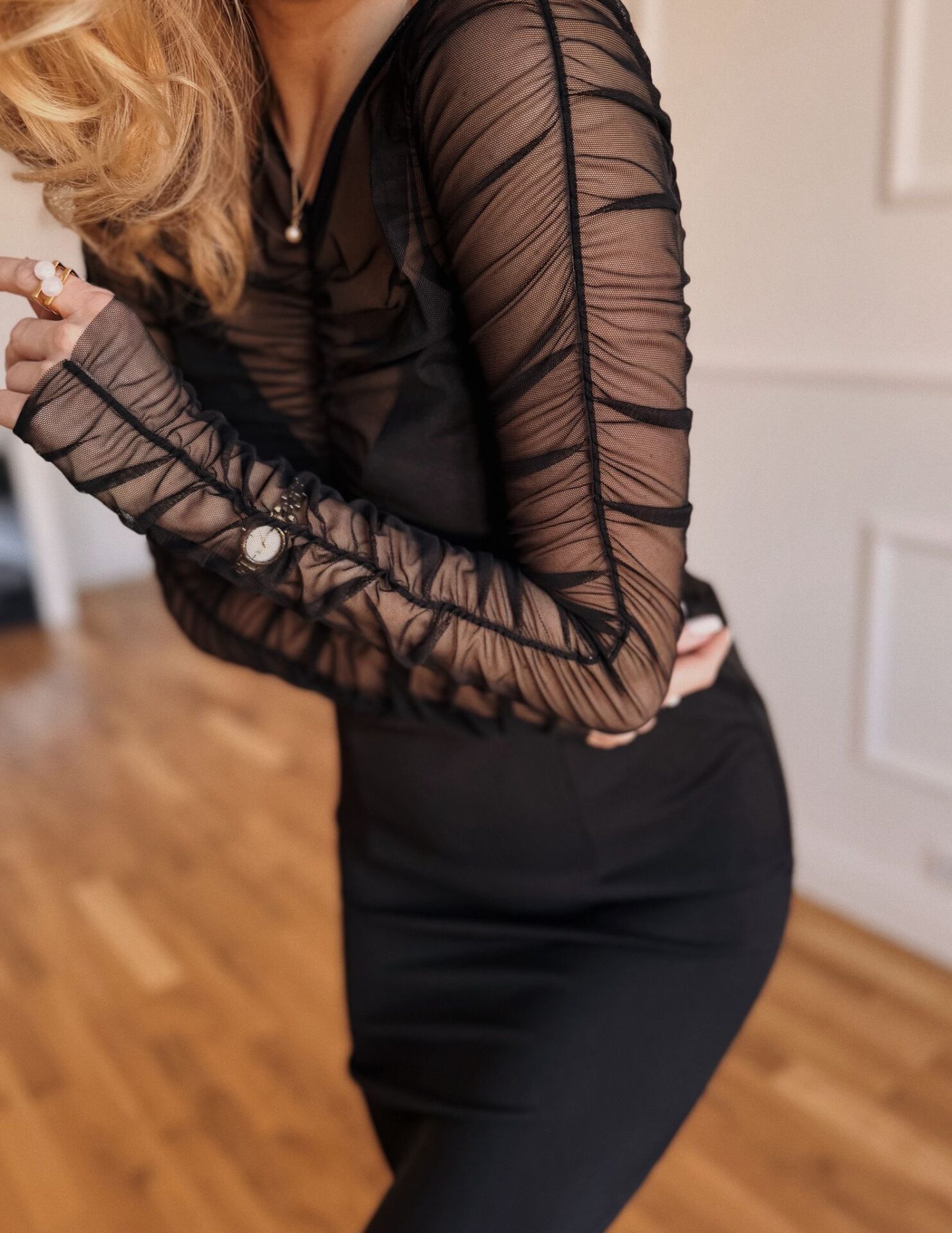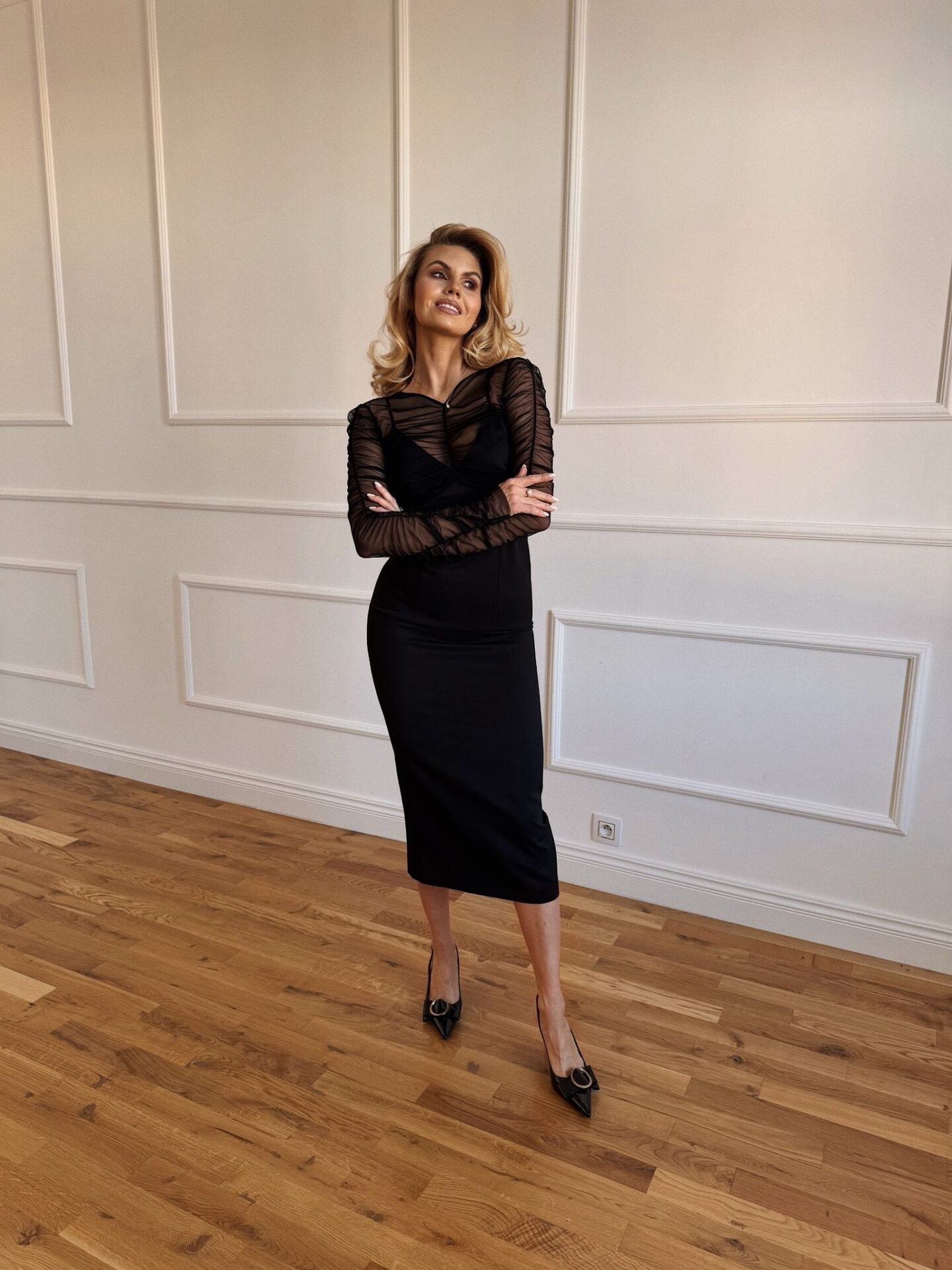 Ta czarna sukienka Patrizia Pepe to idealna propozycja dla kobiet, które cenią wyrafinowany styl z nutą zmysłowości. Dopasowany fason pięknie modeluje sylwetkę, podkreślając kobiece kształty. Marszczona koronka na rękawach i dekolcie dodaje jej lekkości oraz subtelnej zmysłowości. Delikatnie transparentna tkanina na górze nadaje całości wyjątkowego charakteru.