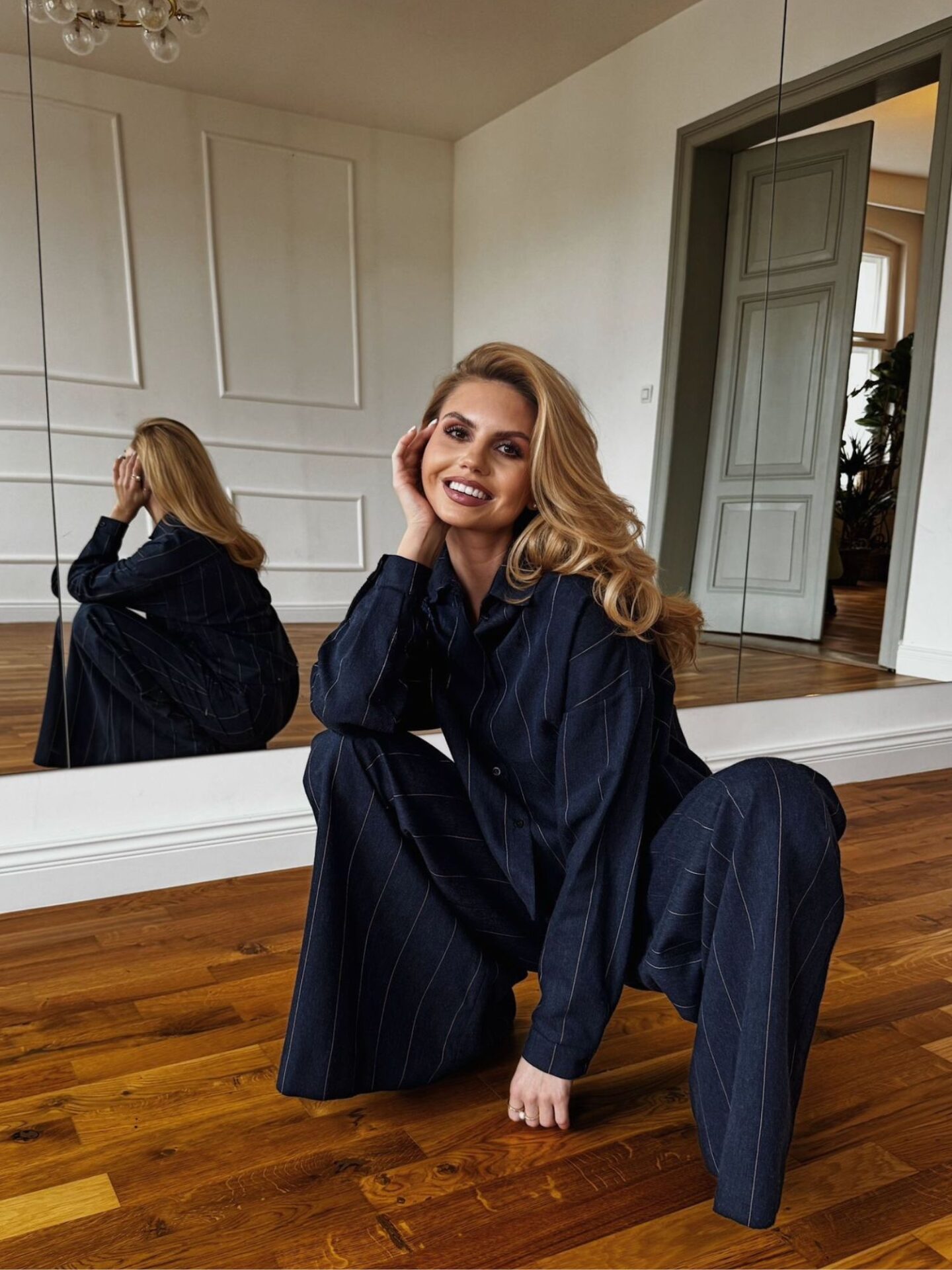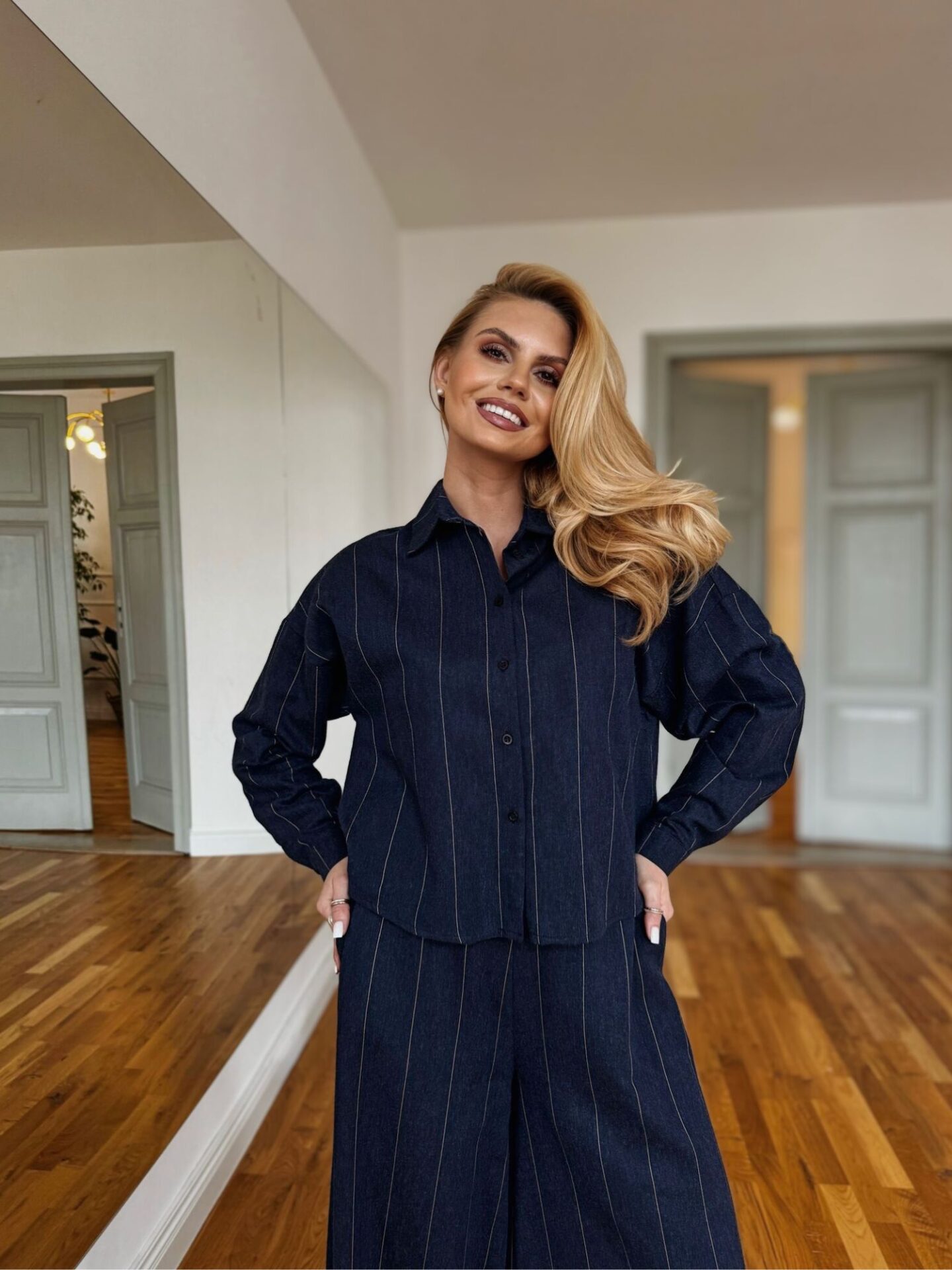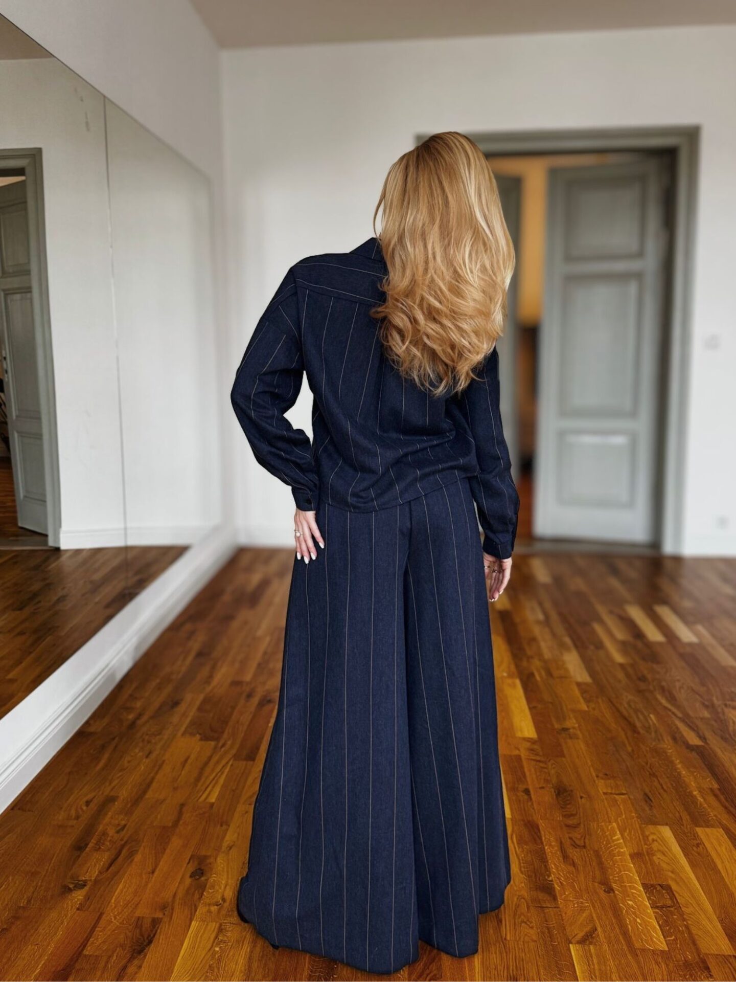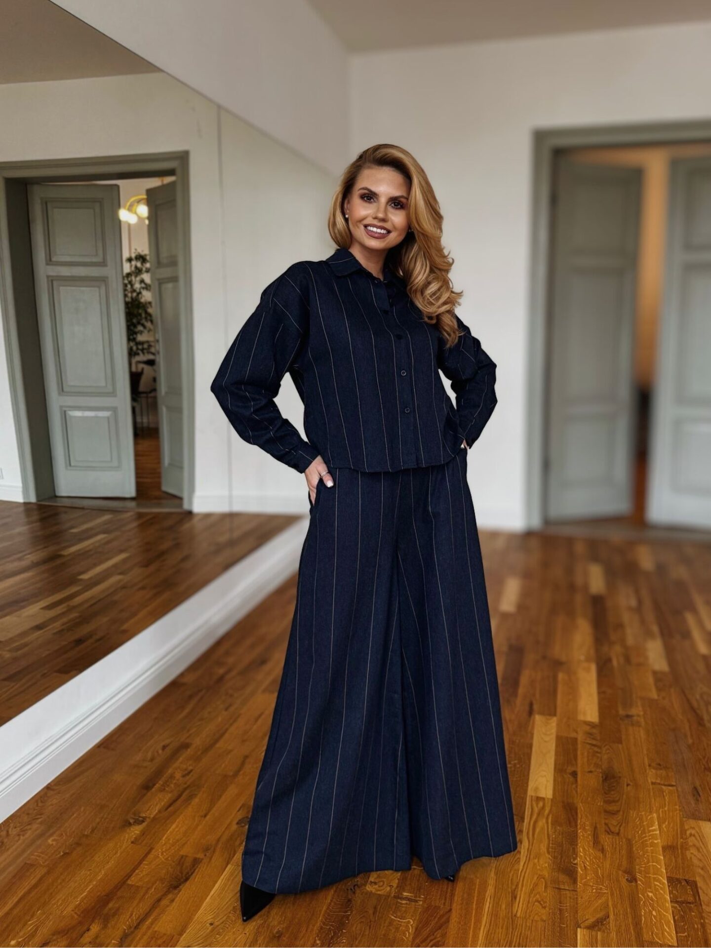 Komplet wykonano z wysokiej jakości materiału, który miękko układa się na sylwetce, podkreślając jej atuty, a jednocześnie nie krępuje ruchów. Kolor granatowy przełamano delikatnymi, subtelnymi paskami, które dodają całości lekkości oraz nowoczesnego charakteru. Koszula ma klasyczny kołnierzyk, długie rękawy oraz zapięcie na guziki, co pozwala nosić ją zarówno w bardziej eleganckiej, jak i casualowej wersji. Spodnie posiadają wysoki stan, a elastyczna gumka w pasie zapewnia świetne dopasowanie, podkreślając talię. Szerokie nogawki sprawiają, że spodnie przypominają spódnicę, zwłaszcza podczas chodzenia, ponieważ materiał pracuje z każdym ruchem.