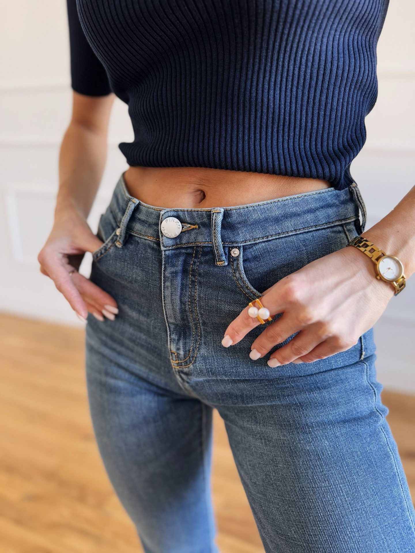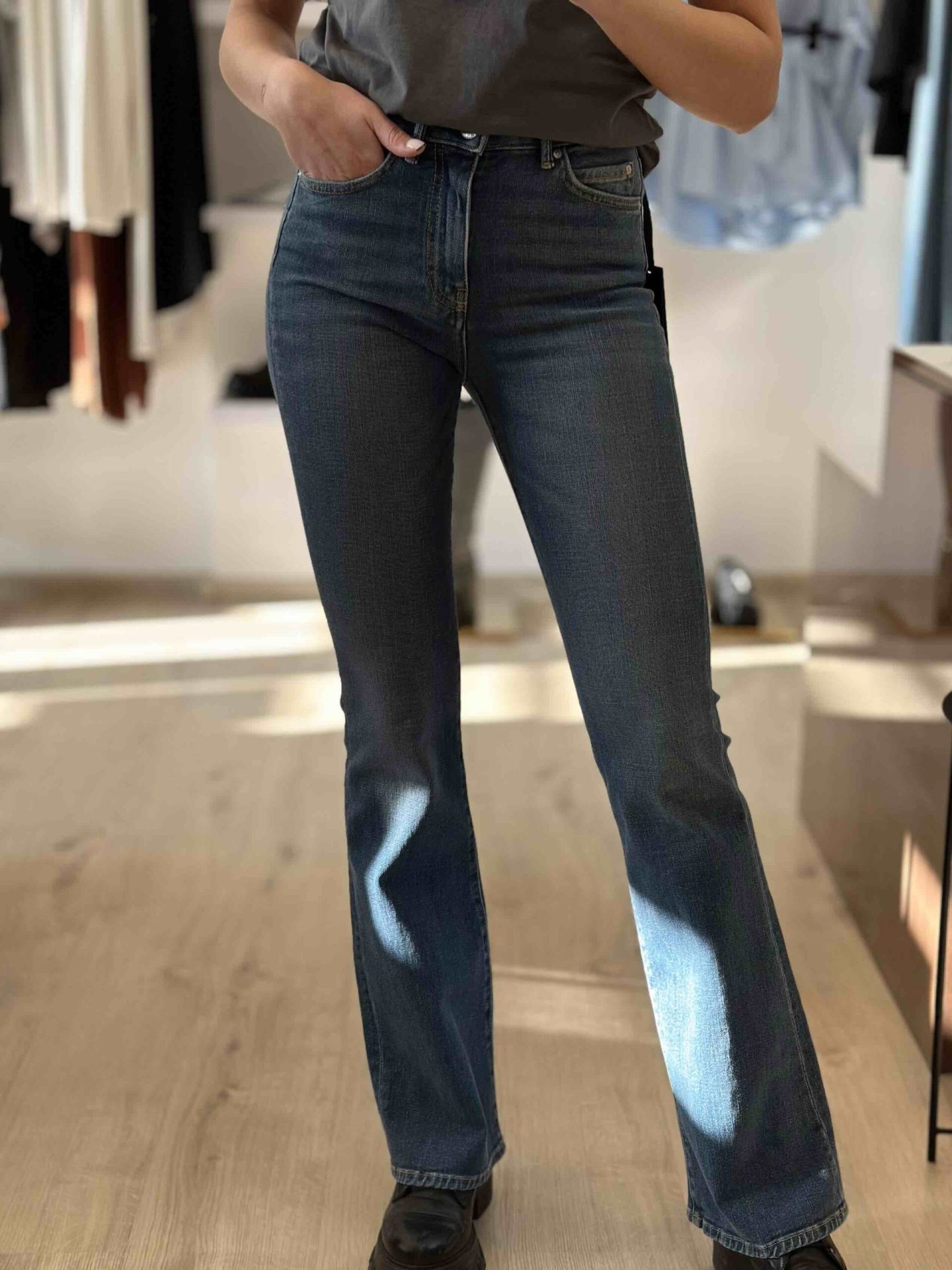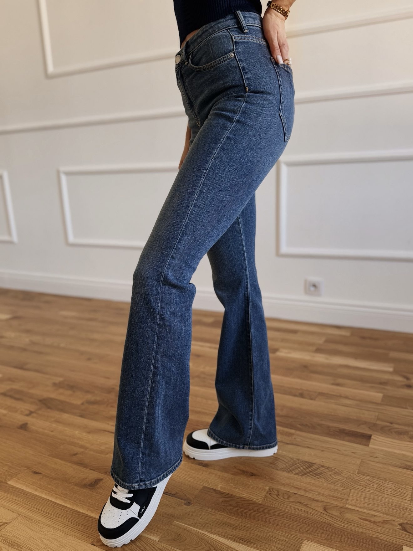 Dzięki dopasowanemu fasonowi spodnie świetnie modelują sylwetkę, a wysokiej jakości denim zapewnia komfort noszenia. Te spodnie typu dzwony sprawdzą się zarówno w casualowych, jak i bardziej eleganckich stylizacjach. Połącz je z botkami lub sneakersami, by uzyskać modny efekt.