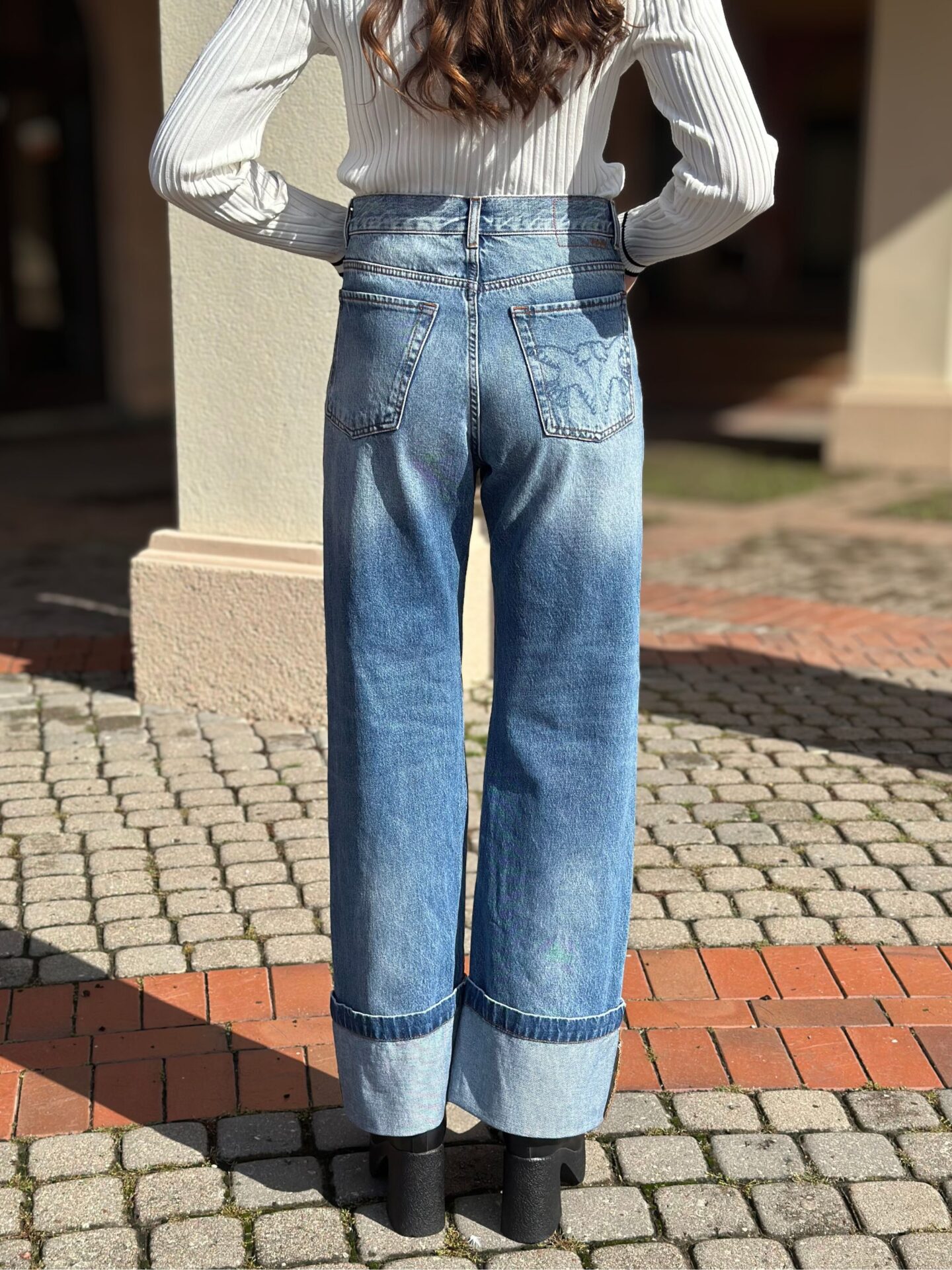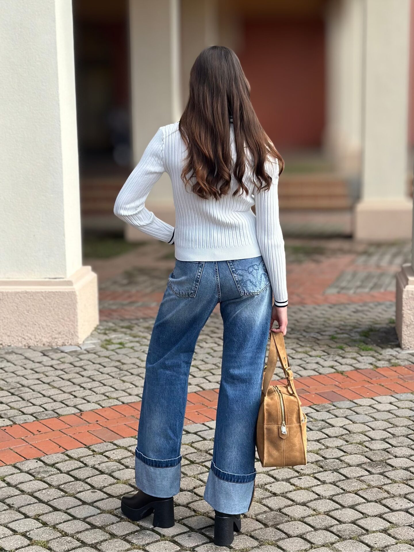 - Krój: Szerokie nogawki, wysoki stan, odwinięty materiał na końcach nogawek
