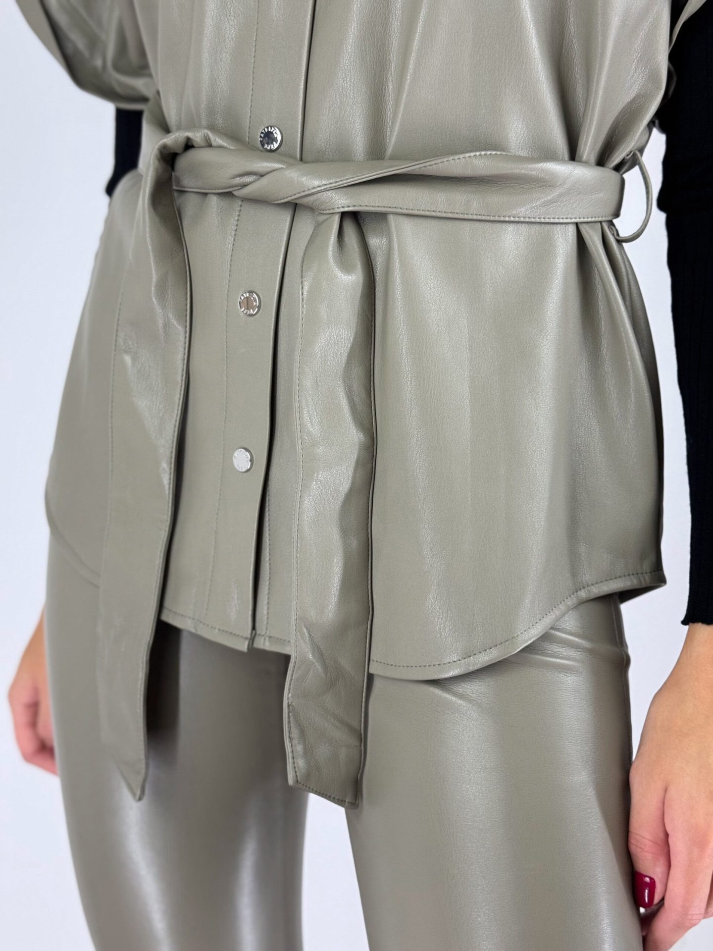 Postaw na oryginalność z oliwkową kamizelką wykonaną z eko skóry. Zapinana na zatrzaski, z dodatkowym paskiem podkreślającym talię, sprawi, że każda stylizacja nabierze wyjątkowego charakteru. Jej luźny krój pozwala na swobodę ruchów, a jednocześnie dodaje odrobiny nonszalancji. Idealna w połączeniu z obcisłymi spodniami lub jeansami, jak również jako warstwa na cieplejszy sweter.