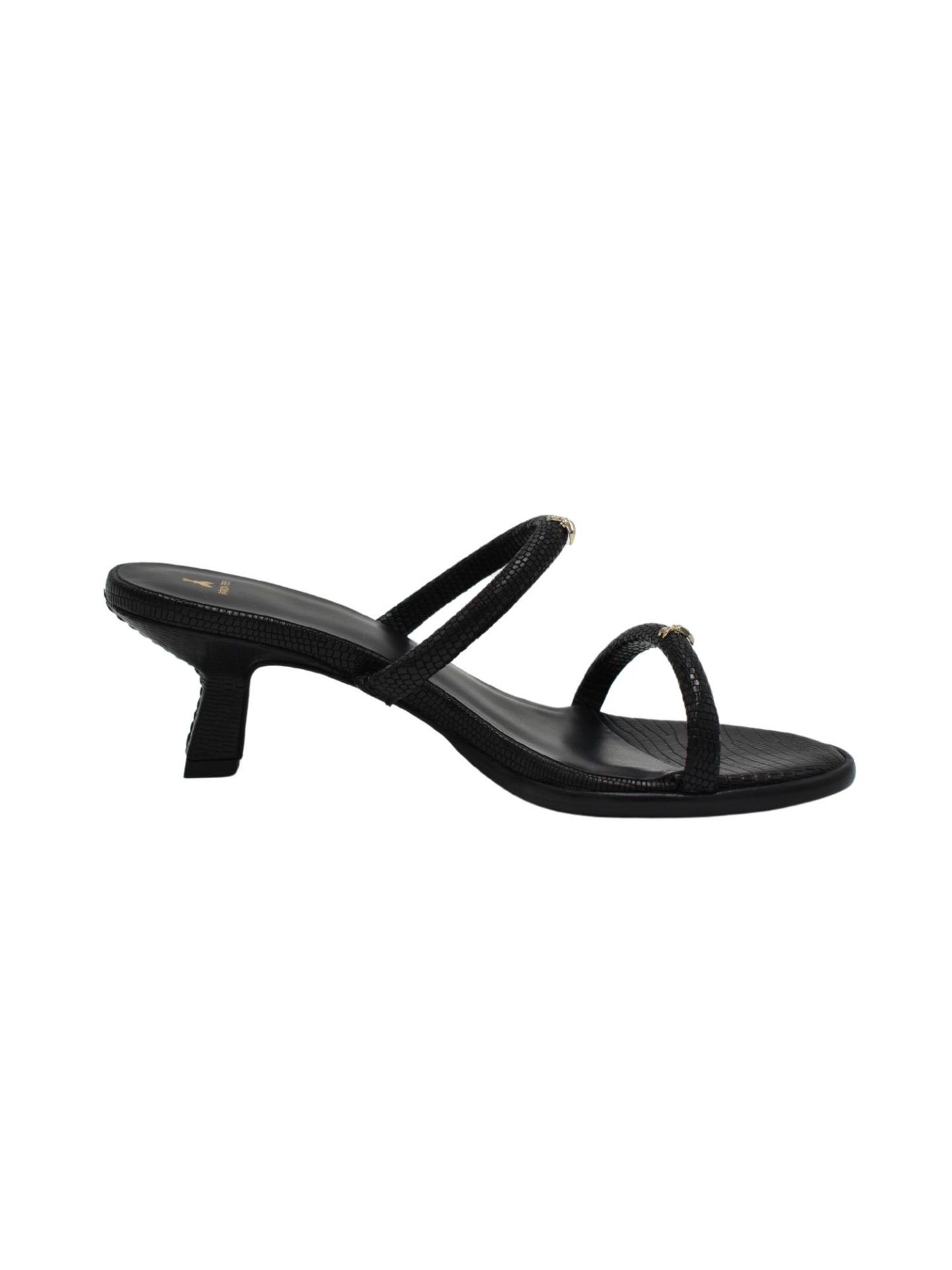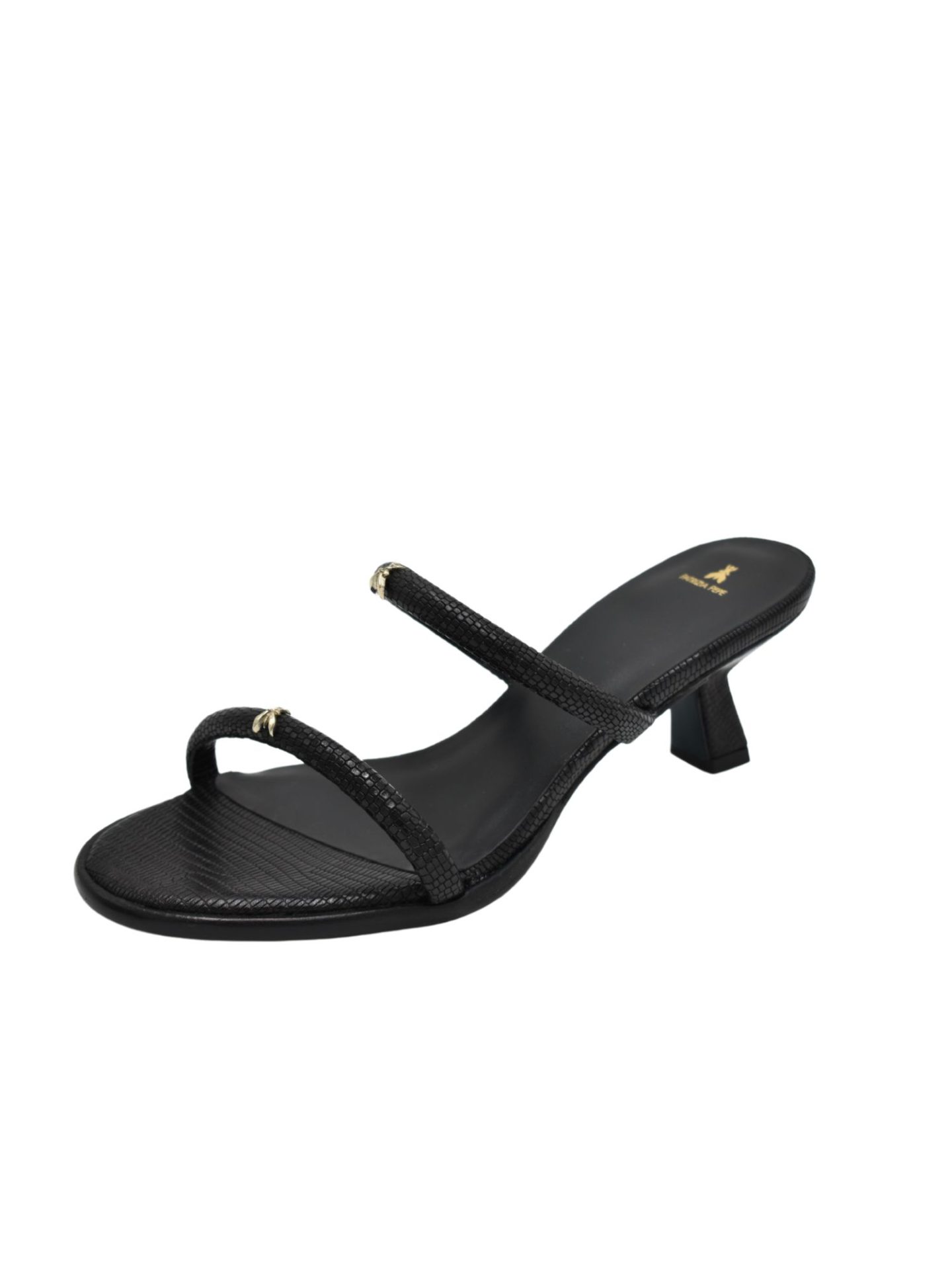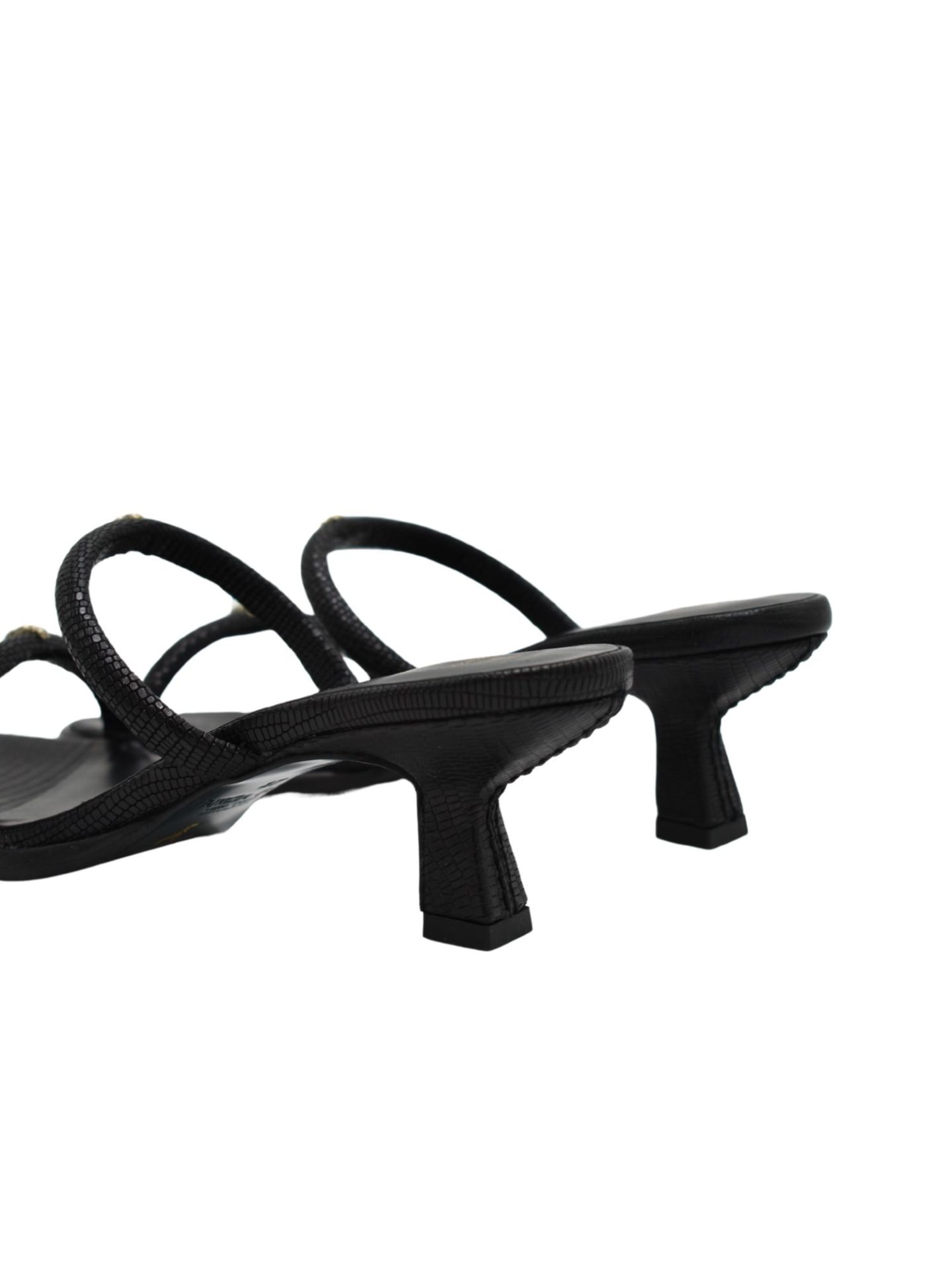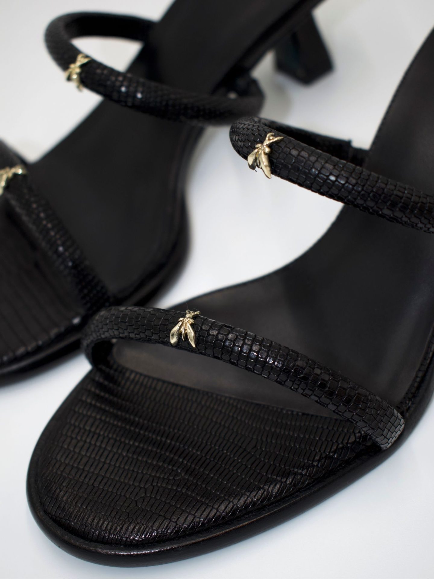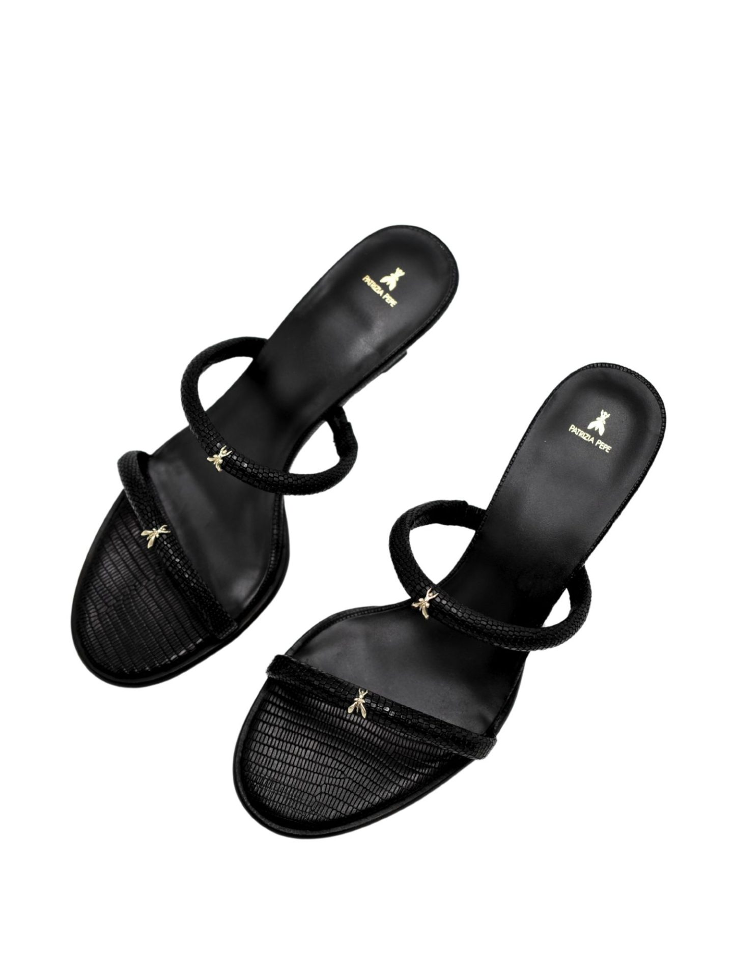 Sandały na obcasie Patrizia Pepe to model, który łączy elegancję z wygodą noszenia nawet przez wiele godzin. Te skórzane sandały wykonano z wysokiej jakości materiałów, co od razu widać w ich dopracowanym wykończeniu. Skóra ma subtelną fakturę przypominającą wzór skóry węża, dzięki czemu buty prezentują się modnie i z charakterem. Dwa cienkie paski z delikatnym połyskiem trzymają stopę, zapewniając jej stabilność i lekkość podczas chodzenia. Paski nie uciskają, a jednocześnie dobrze dopasowują się do kształtu stopy, co zwiększa komfort nawet przy dłuższym użytkowaniu.