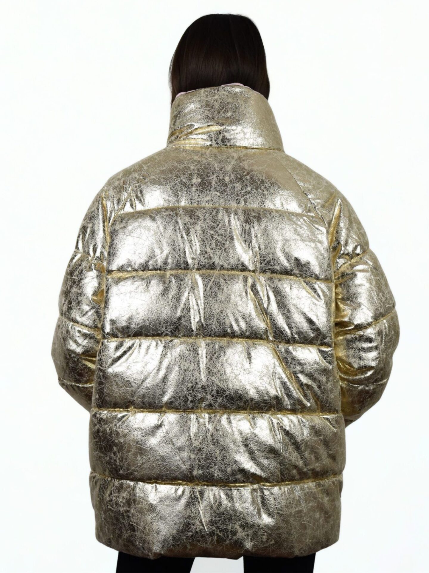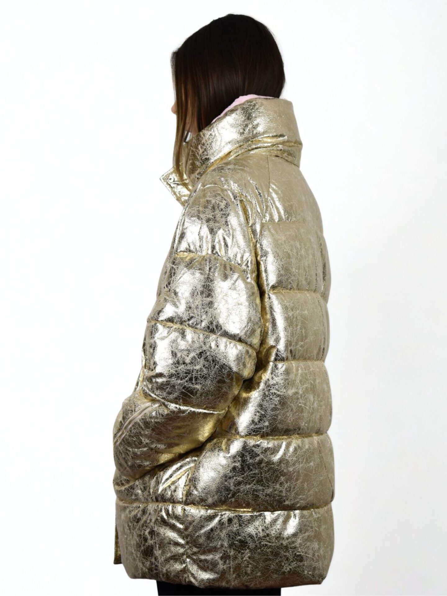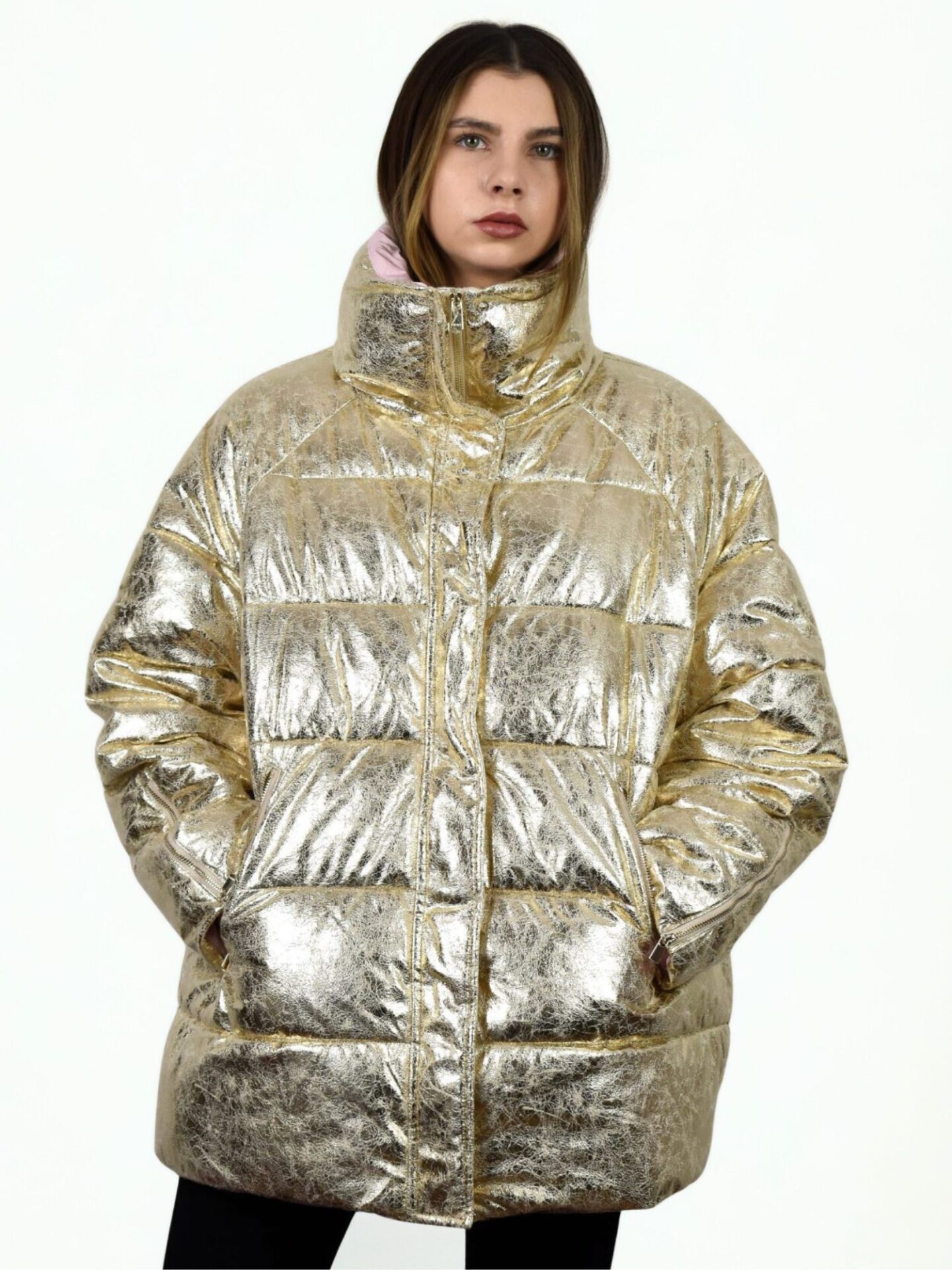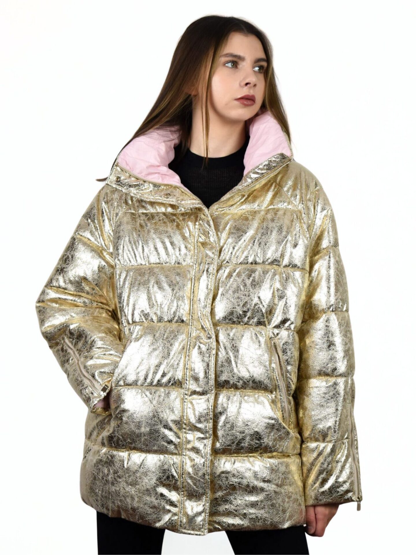 Wewnętrzne wykończenie w pudrowo-różowym odcieniu tworzy elegancki kontrast z błyszczącym złotem. Dzięki temu model zyskuje lekkość i kobiecy akcent, nie tracąc przy tym swojej wyrazistej formy. Przedłużony fason osłania przed chłodem i wiatrem, a pikowane przeszycia równomiernie rozprowadzają ciepło po całej powierzchni. W efekcie kurtka nie tylko świetnie wygląda, ale również zapewnia realną ochronę przed zimową aurą.