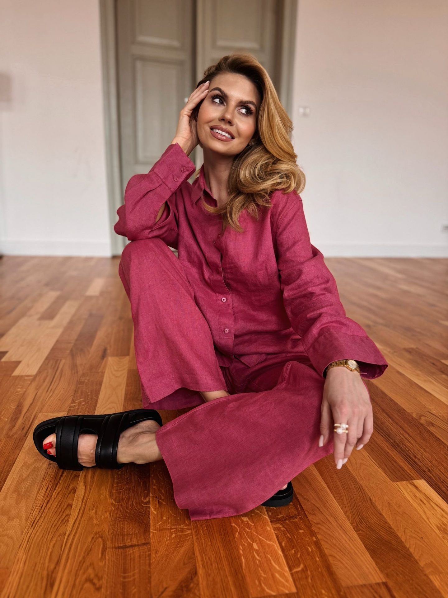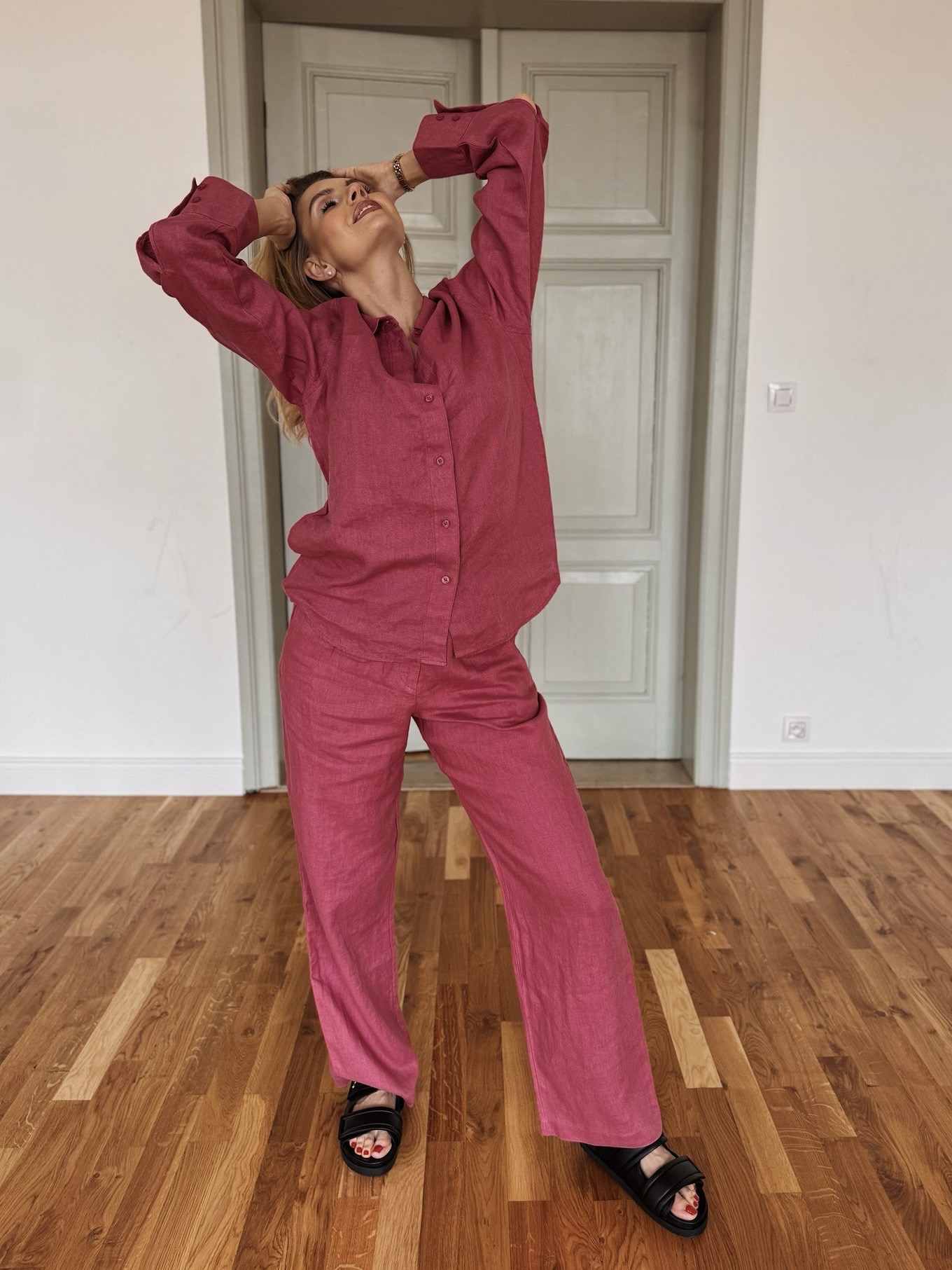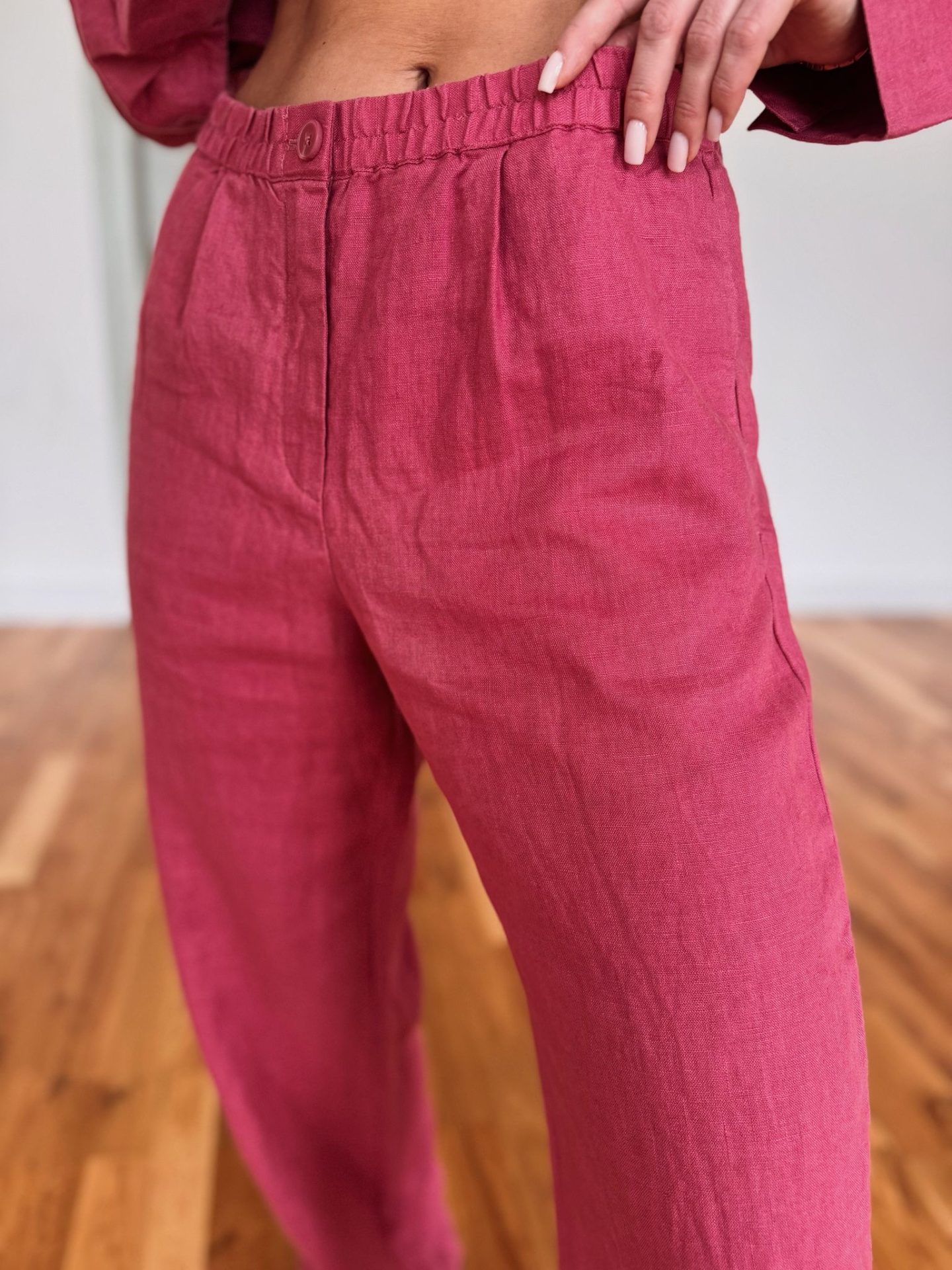 Malinowy odcień tkaniny wyróżnia się na tle klasycznych propozycji i pozwala na tworzenie stylowych, modnych zestawów. Spodnie świetnie komponują się zarówno z koszulą z tej samej kolekcji, jak i bardziej casualowymi elementami garderoby. Można je nosić z eleganckimi butami lub sportowym obuwiem, tworząc różnorodne stylizacje.