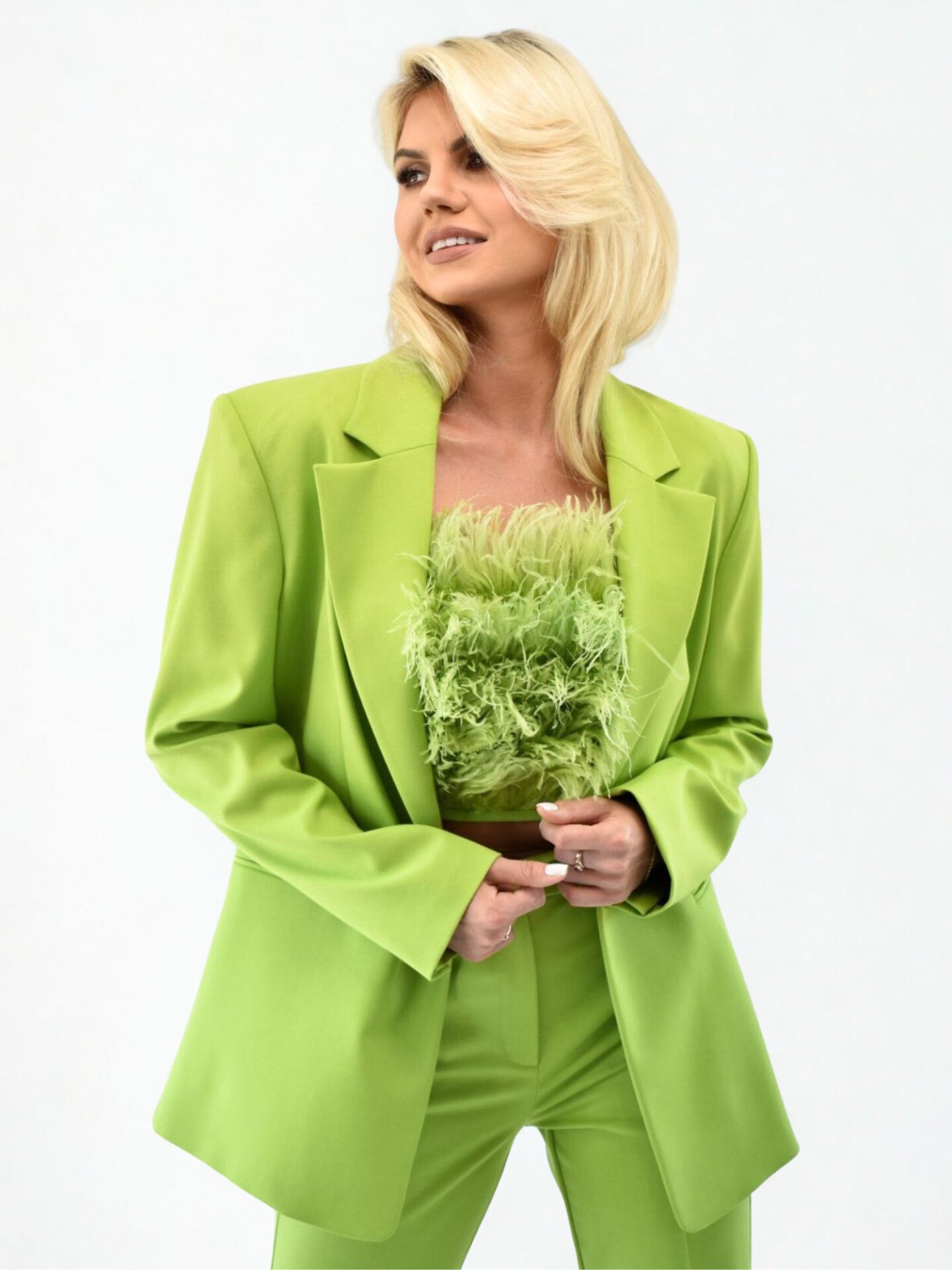 Marynarka włoskiej marki Patrizia Pepe, w kolorze limonkowym. Model o prostym kroju, wyposażony w poduszki na ramionach. Idealna zarówno na co dzień jak i na eleganckie wyjścia. Intensywny kolor marynarki ożywi Twoją stylizację.