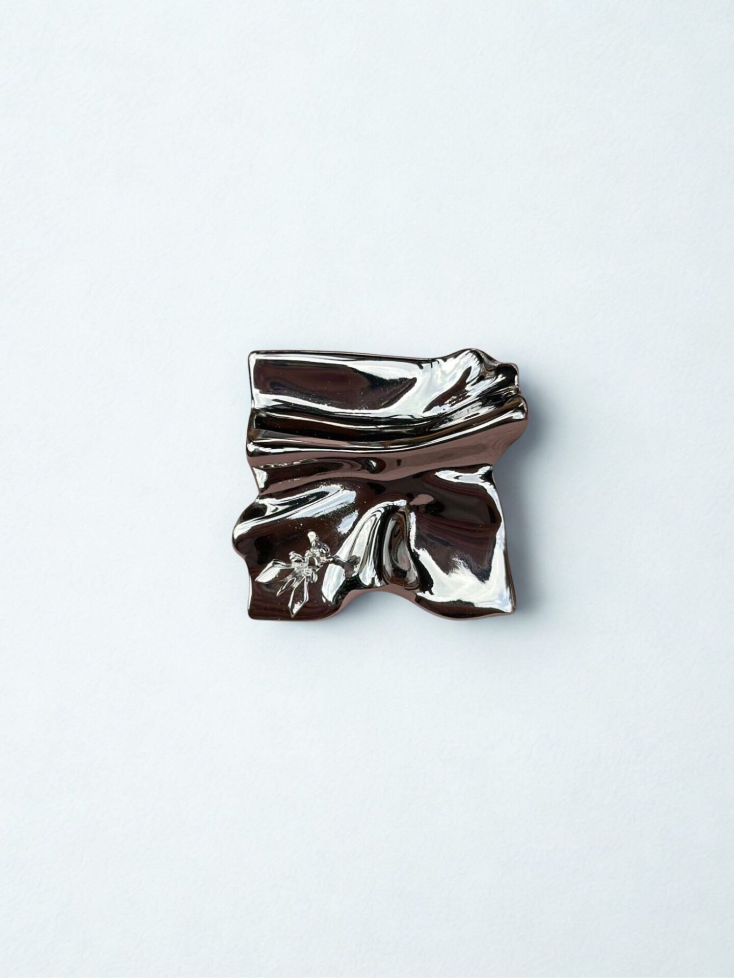 Pierścionek Patrizia Pepe w kolorze srebrnym to model, który zaskakuje oryginalną formą. Inspirowany zmiętą tkaniną, prezentuje się jak małe dzieło sztuki, które przyciąga uwagę i gra światłem. Lustrzana powierzchnia odbija otoczenie, dzięki czemu pierścionek zmienia się w zależności od światła i kąta spojrzenia. Takie wykończenie dodaje mu wyjątkowej głębi. Z przodu znajduje się charakterystyczne logo muchy – znak rozpoznawczy marki Patrizia Pepe. Ten delikatny detal podkreśla designerski charakter pierścionka, a jednocześnie pozostaje elegancki i subtelny.