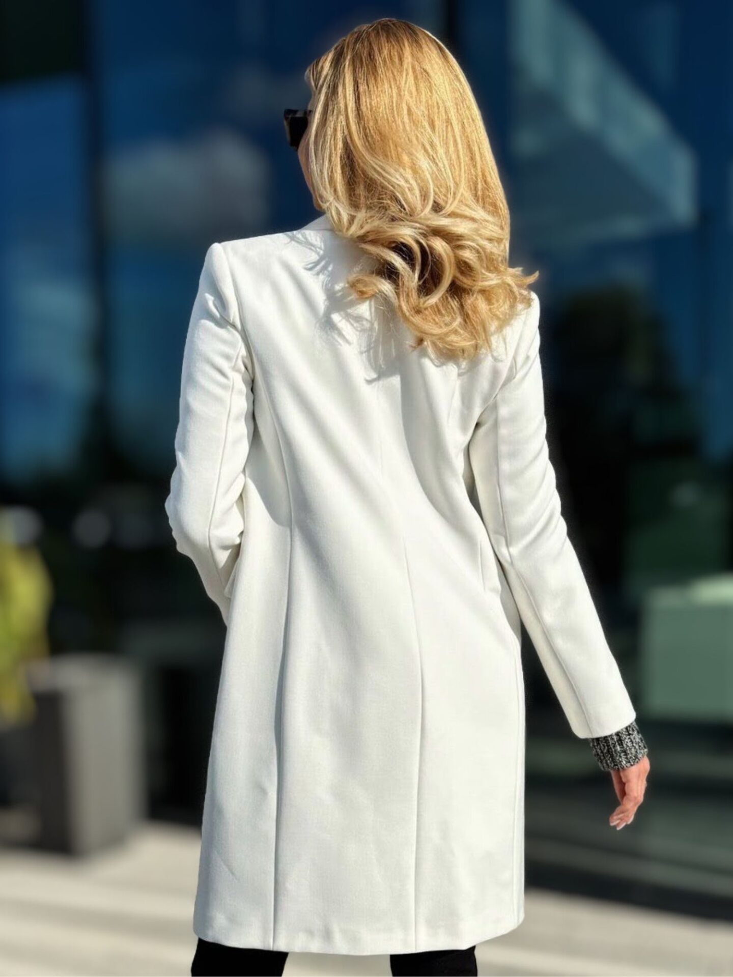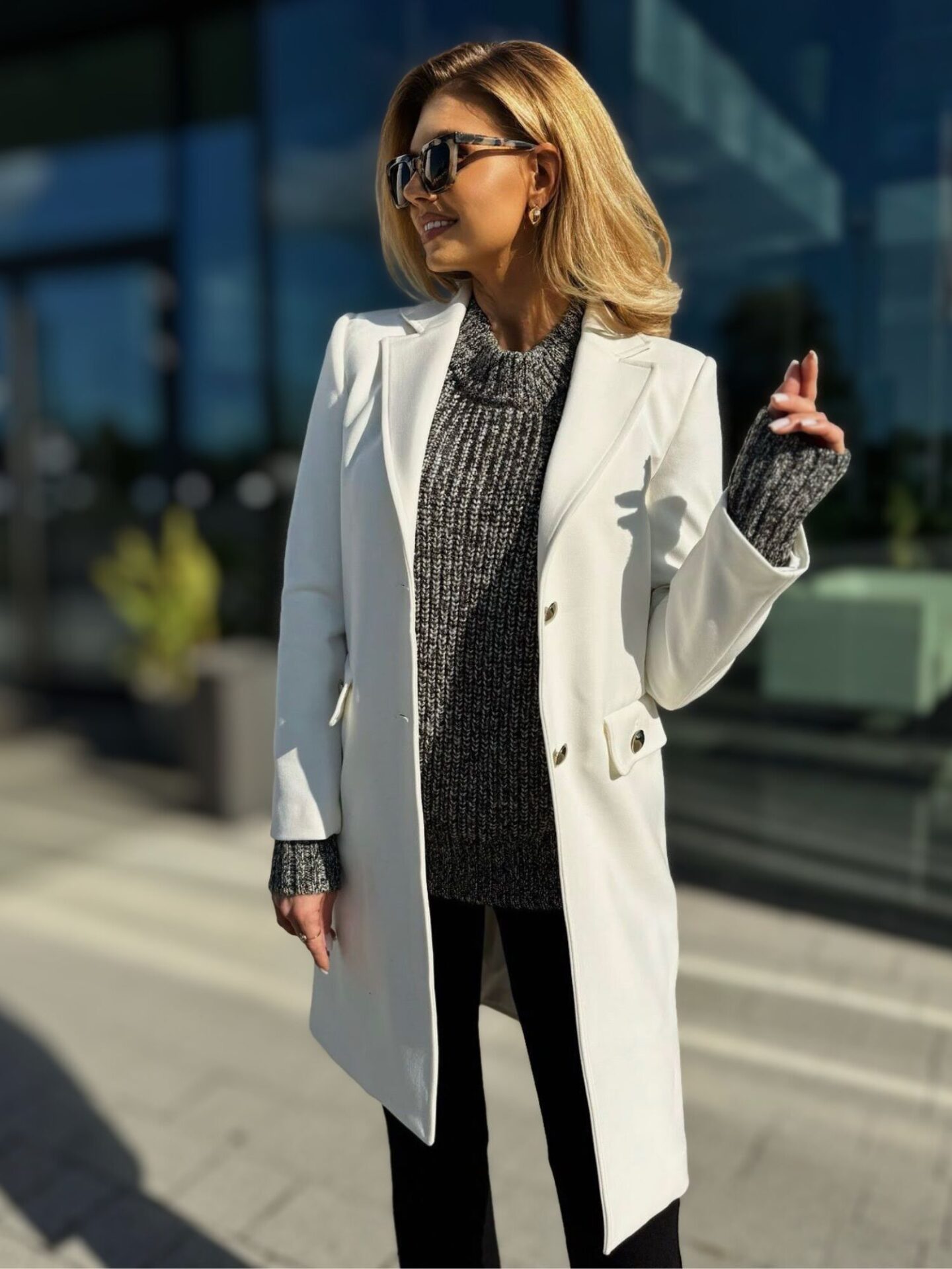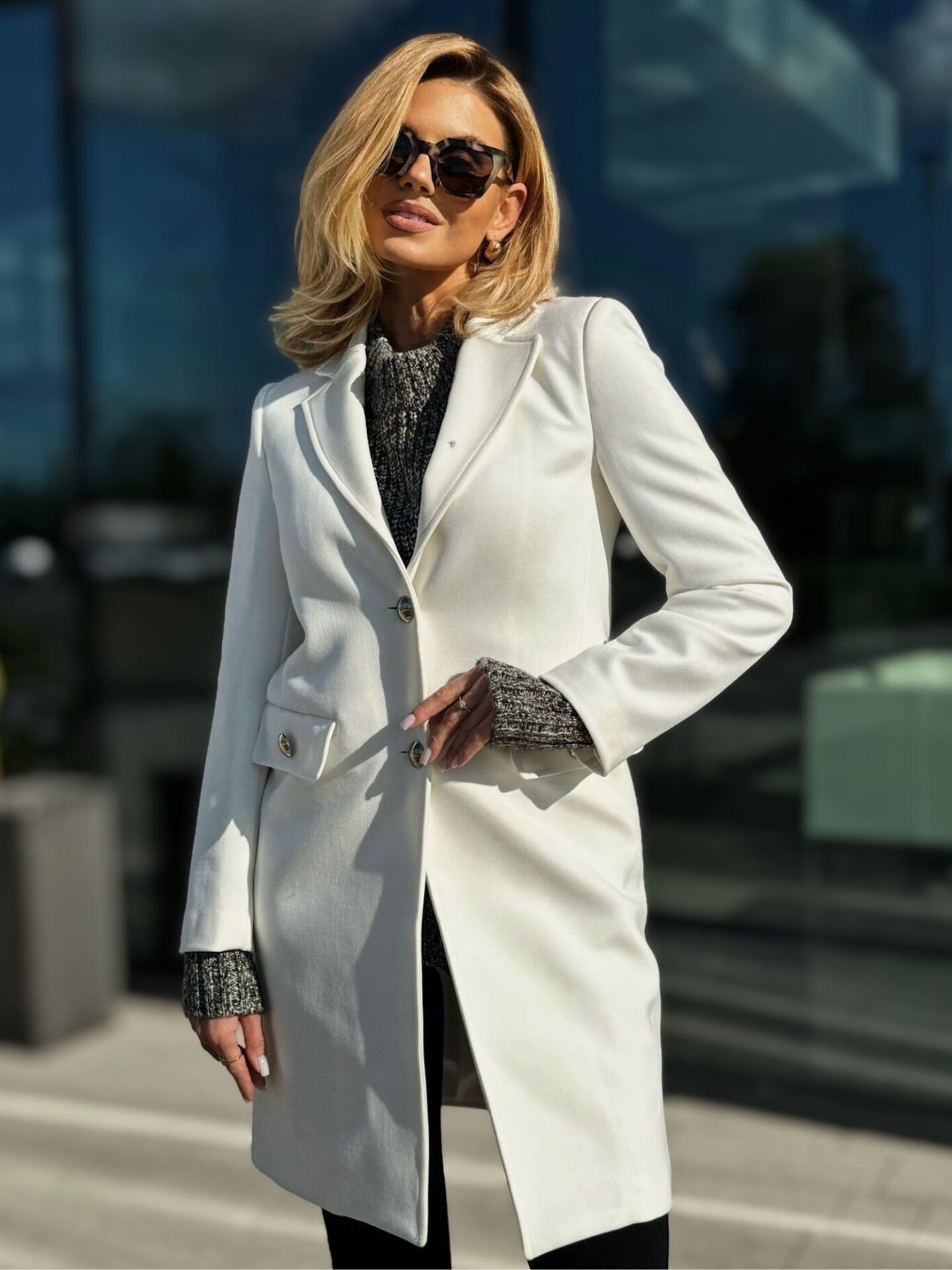 W eleganckim białym płaszczu Liu Jo nic nie jest przypadkowe – to model przemyślany w najmniejszym szczególe. Dwa ozdobne złote guziki stanowią nie tylko zapięcie, ale też elegancki element biżuteryjny. Delikatne patki przy kieszeniach, klasyczne klapy oraz subtelnie taliowany krój tworzą razem spójną, harmonijną całość. Tkanina, z której został uszyty płaszcz, prezentuje się wyjątkowo estetycznie, a jednocześnie zapewnia komfort noszenia. Dobrze dopasowana długość chroni przed chłodem i wiatrem, a jednocześnie nie przytłacza sylwetki. To model, który nie tylko dobrze wygląda – on także świetnie się nosi.