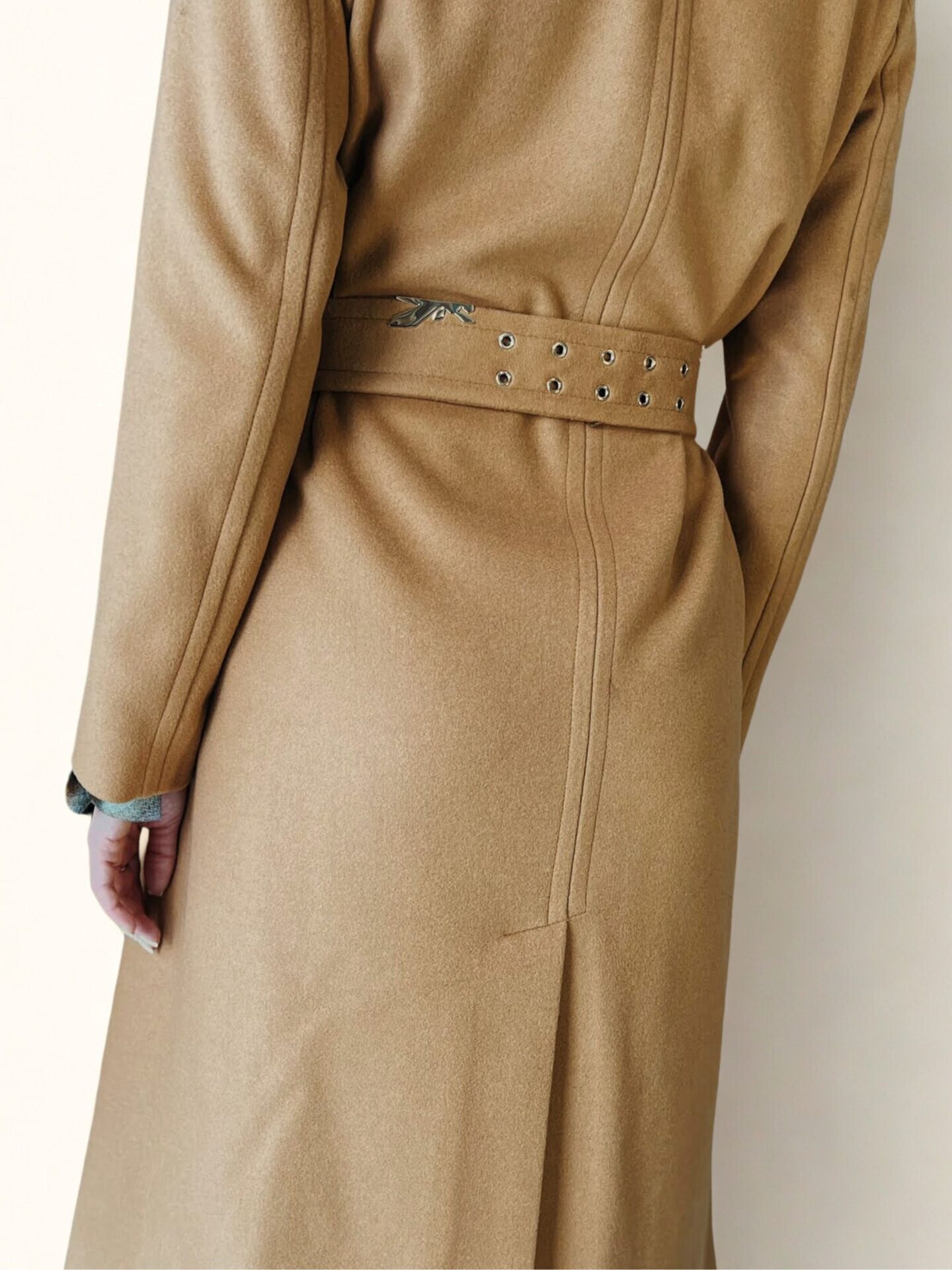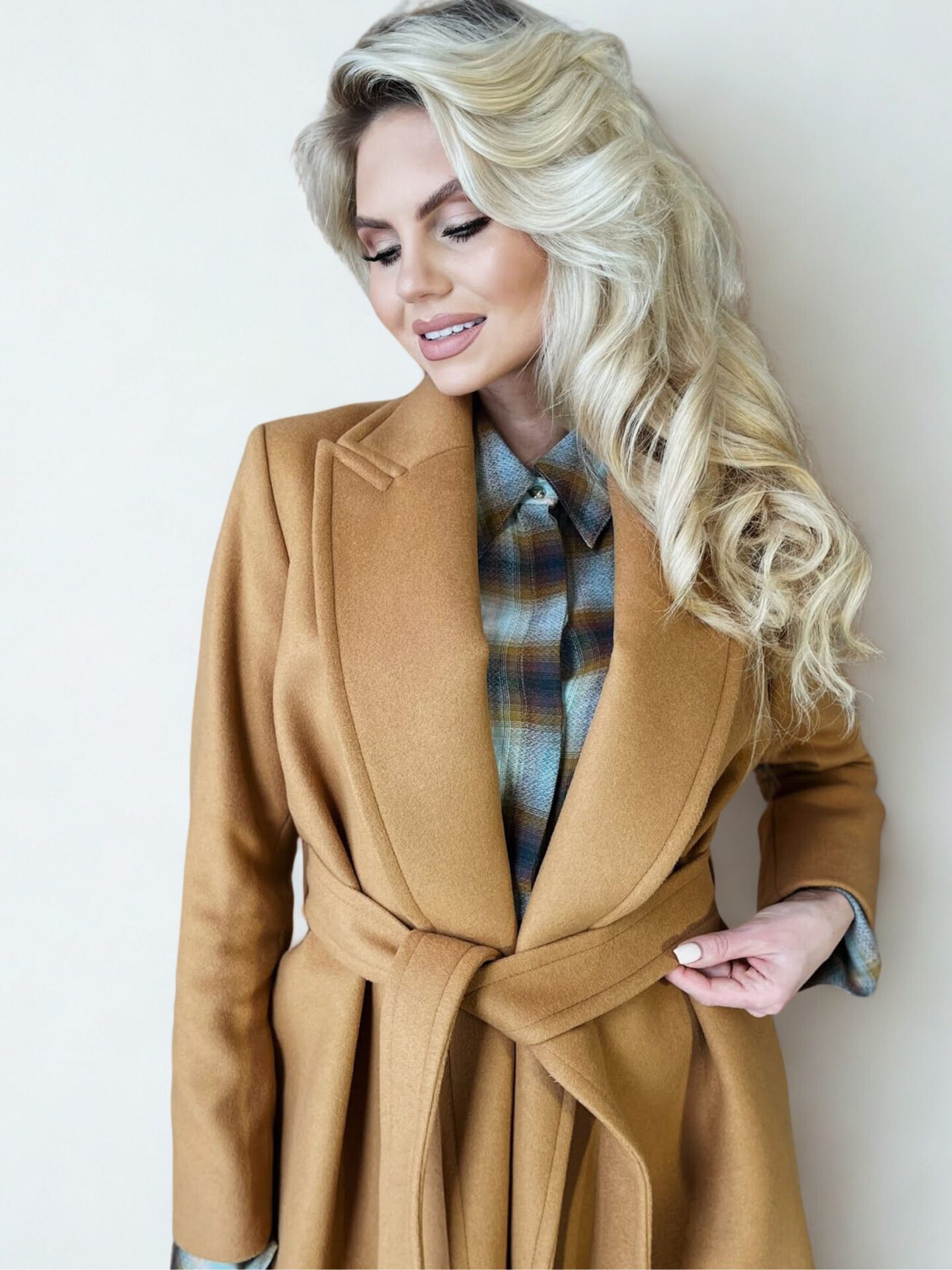 Projekt wyróżnia się nie tylko jakością tkaniny, ale też przemyślanymi rozwiązaniami. Zapięcie jest subtelnie ukryte, co pozwala na gładką linię przodu, a jednocześnie chroni przed wiatrem. Karmelowy kolor, choć spokojny, działa jak neutralna baza, która podbija głębię innych barw i materiałów. Dzięki minimalistycznemu podejściu do formy, płaszcz nie dominuje stylizacji, lecz ją dopełnia. Takie podejście czyni go niezwykle wszechstronnym – można go założyć zarówno na dzienne spotkanie w pracy, jak i na kolację w eleganckiej restauracji.