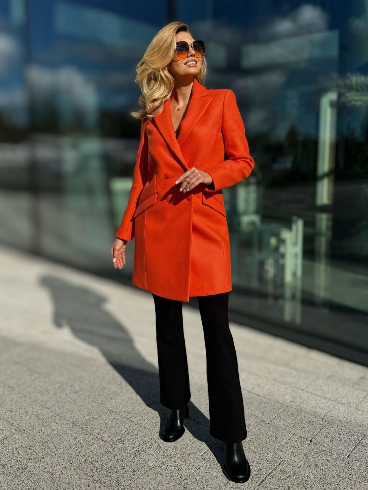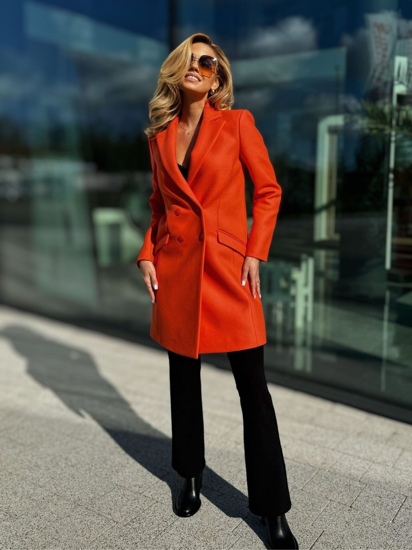 Fason płaszcza został zaprojektowany w taki sposób, aby podkreślić atuty kobiecej sylwetki i zapewnić swobodę ruchów. Krój pięknie modeluje talię, dzięki czemu sylwetka prezentuje się smukło i proporcjonalnie. Pomarańczowy odcień nie tylko ożywia garderobę, ale też skutecznie przełamuje monotonię jesiennych i zimowych stylizacji. Wełniany pomarańczowy płaszcz Patrizia Pepe świetnie wygląda zarówno z eleganckimi spodniami, jak i z casualowymi jeansami. Możesz nosić go do pracy, na spacer czy spotkanie – zawsze będzie prezentował się stylowo i nowocześnie. Jego uniwersalność sprawia, że z łatwością dopasujesz go do swojej codziennej garderoby.