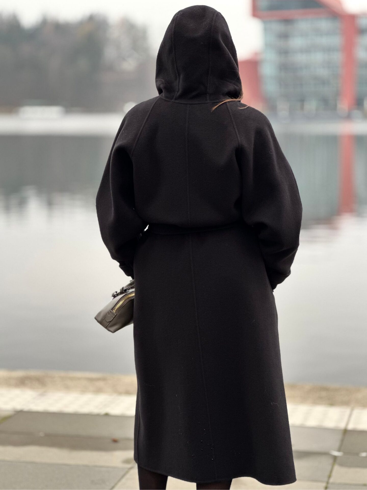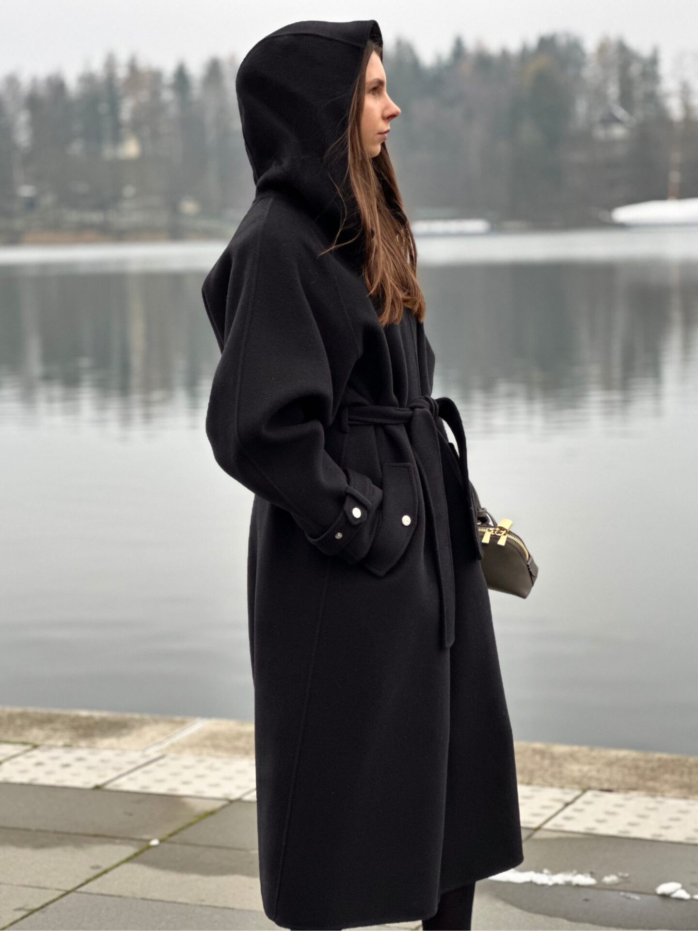 Model wykonano z wysokiej jakości wełny, co zapewnia ciepło i komfort noszenia. Materiał jest przyjemny w dotyku, a jednocześnie odporny na odkształcenia, dlatego płaszcz zachowuje swoją formę przez wiele sezonów. Dodatek paska w talii pozwala zaznaczyć proporcje sylwetki i dopasować fason do indywidualnych preferencji. Ponadto kaptur nadaje mu bardziej nowoczesnego i nieco miejskiego charakteru, dzięki czemu z łatwością dopasujesz go zarówno do eleganckich, jak i bardziej casualowych stylizacji. Dodatkowe napy umożliwiają szybkie zapięcie płaszcza, co przydaje się szczególnie w chłodniejsze dni.