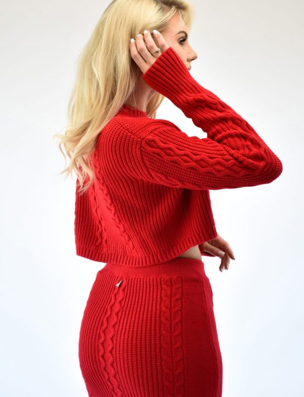 Spódnica włoskiej marki Patrizia Pepe. Model w kolorze czerwonym. Długość za kolano. Spódnica posiada głębokie wycięcie na nogę. Spódnica w warkoczowy splot. Model z wysokim stanem.