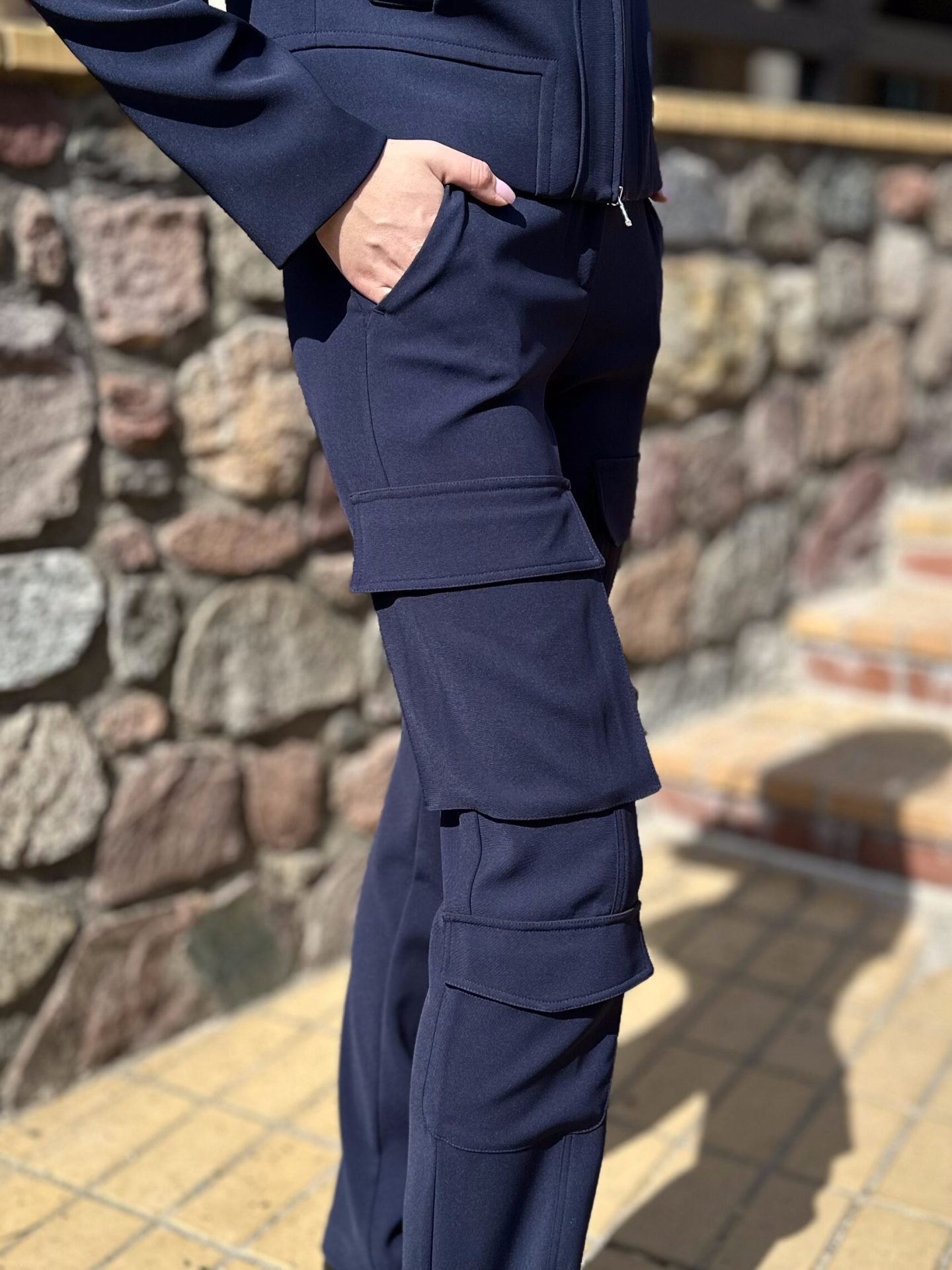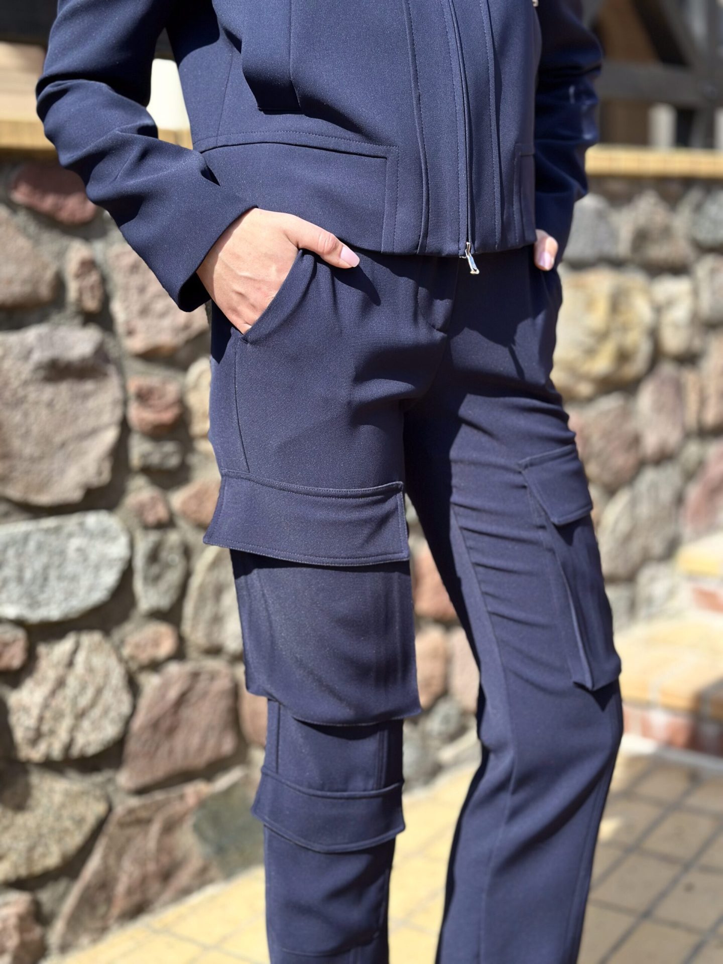 Spodnie posiadają boczne kieszenie oraz dodatkowe kieszenie z patkami na nogawkach, co nadaje całości modny, lekko militarny charakter. Taki detal wyróżnia je na tle klasycznych fasonów. Granatowe spodnie Patrizia Pepe doskonale komponuje się z granatową kurtką Patrizia Pepe, tworząc modny i spójny zestaw. Granatowe spodnie to uniwersalna baza wielu stylizacji, ponieważ świetnie łączą się zarówno z dopasowanymi bluzkami, jak i luźniejszymi koszulami. Postaw na styl i komfort, który zapewnia włoska moda.
