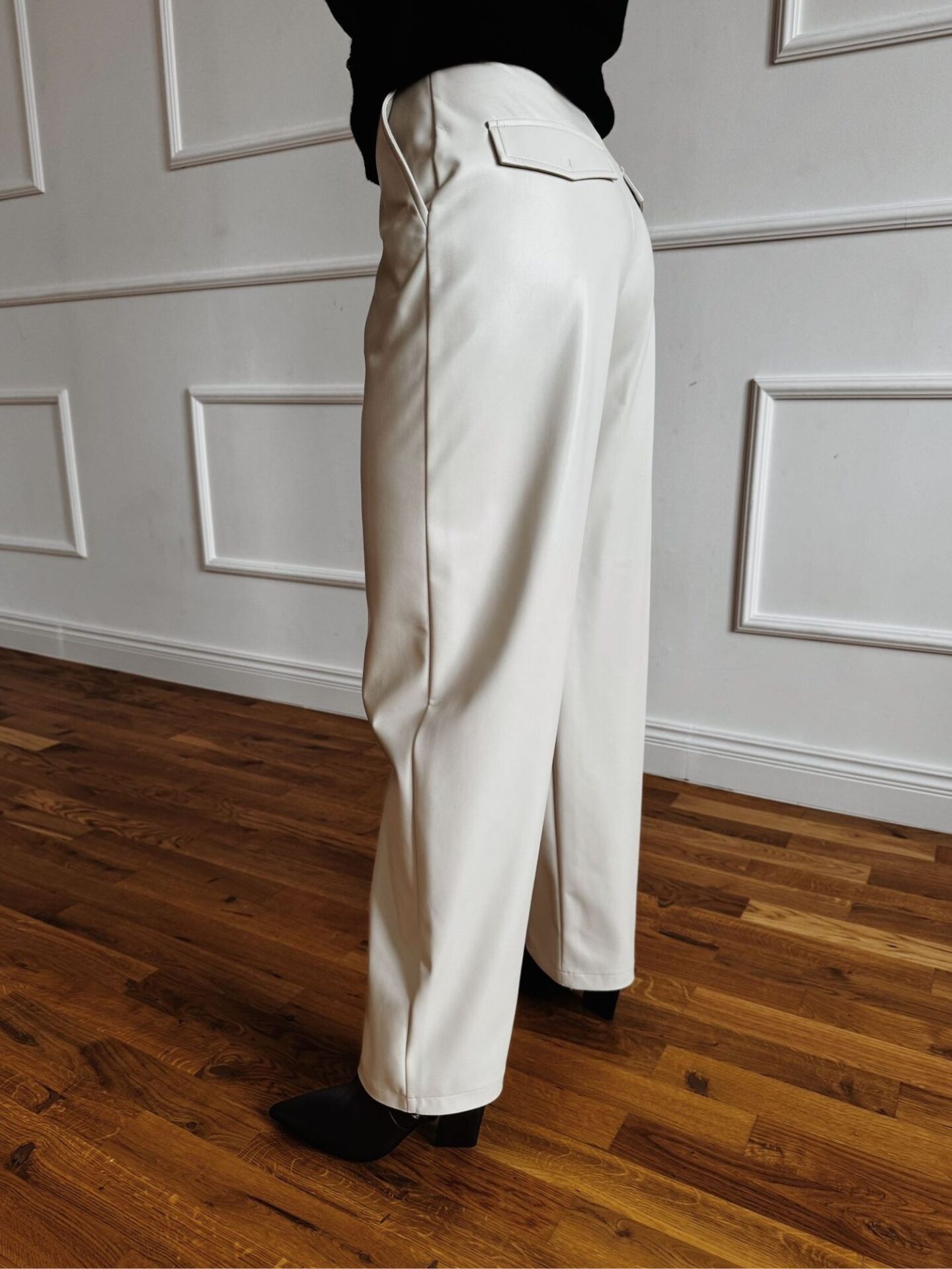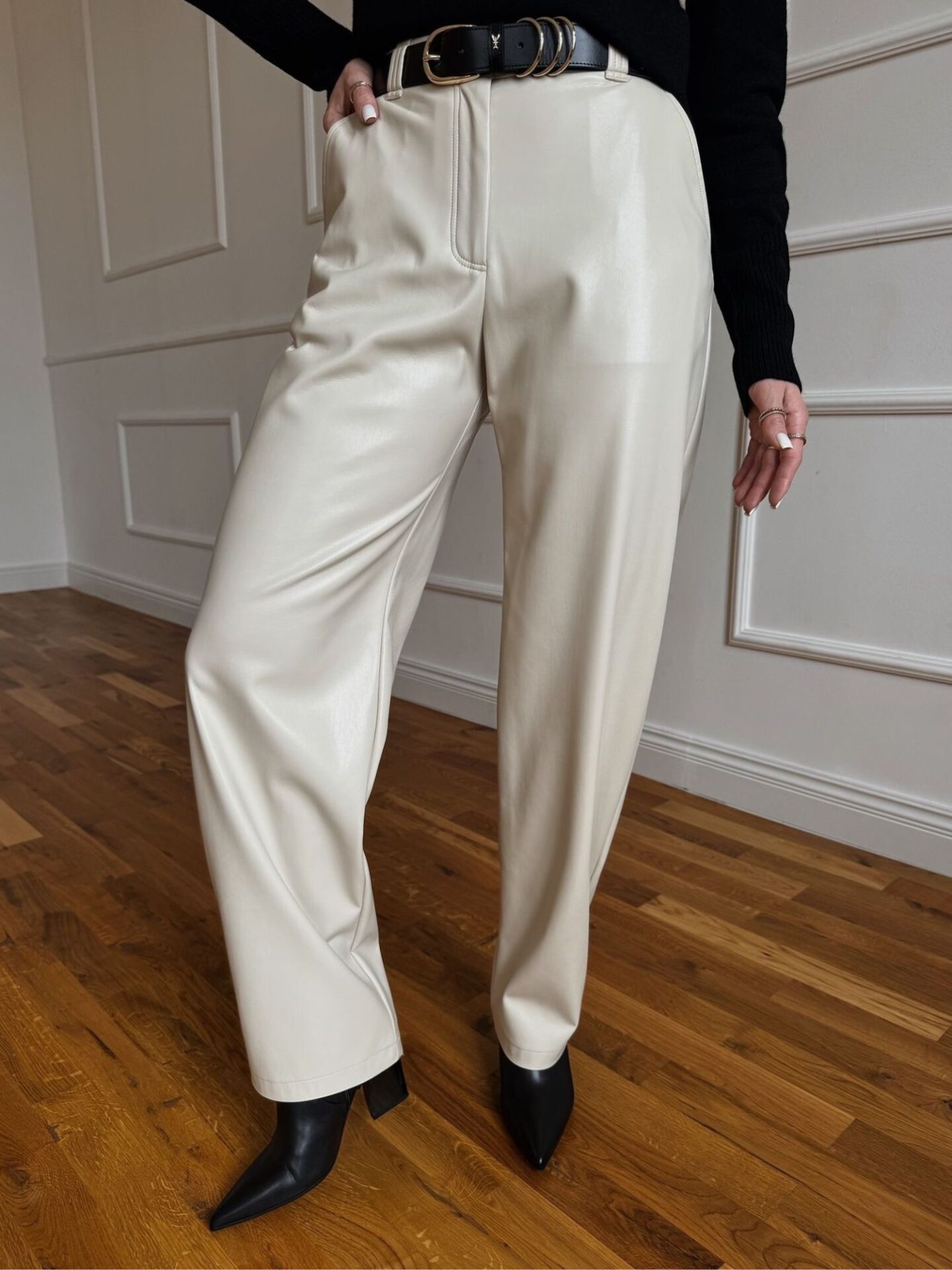 Te jasne spodnie od Pinko zostały wykonane z wysokiej jakości skóry ekologicznej, dzięki czemu są przyjazne dla środowiska, a jednocześnie zachwycają swoim wyglądem i strukturą. Od wewnątrz znajduje się miękka podszewka bawełniana, która zwiększa komfort noszenia i pozwala skórze oddychać. Model posiada praktyczne kieszenie oraz szlufki pozwalające na dodanie paska, co umożliwia lepsze dopasowanie do figury. Luźniejszy krój nogawek nadaje stylizacji lekkości i nowoczesnego charakteru. Warto podkreślić, że materiał jest przyjemny w dotyku, co dodatkowo podnosi komfort użytkowania.