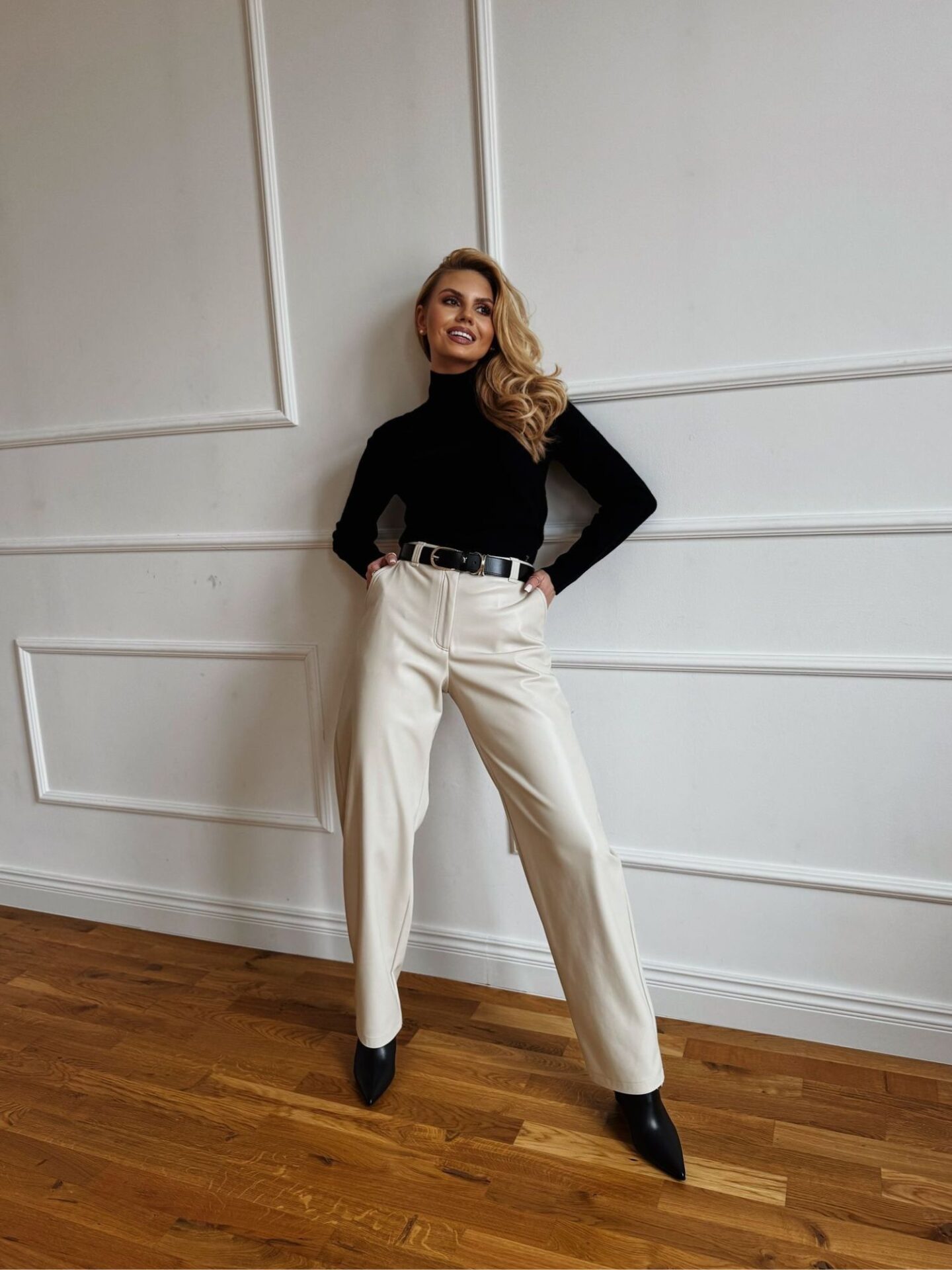 Spodni Pinko Panino można używać w wielu różnorodnych stylizacjach, ponieważ świetnie komponują się zarówno z eleganckimi, jak i bardziej swobodnymi elementami garderoby. W połączeniu z dopasowanym golfem lub czarnym topem tworzą szykowny zestaw idealny na spotkanie biznesowe lub kolację. Jeśli zależy Ci na bardziej casualowym efekcie, warto zestawić je z miękkim swetrem w neutralnym kolorze, co zapewni stylowy, a zarazem wygodny look na co dzień. Dzięki subtelnemu odcieniowi spodnie dobrze wyglądają także z pastelami, beżami oraz klasyczną czernią, co ułatwia budowanie kapsułowej garderoby. Dodatkowo obcasy pięknie wysmuklą sylwetkę, natomiast w połączeniu z botkami powstanie modna, nowoczesna stylizacja.