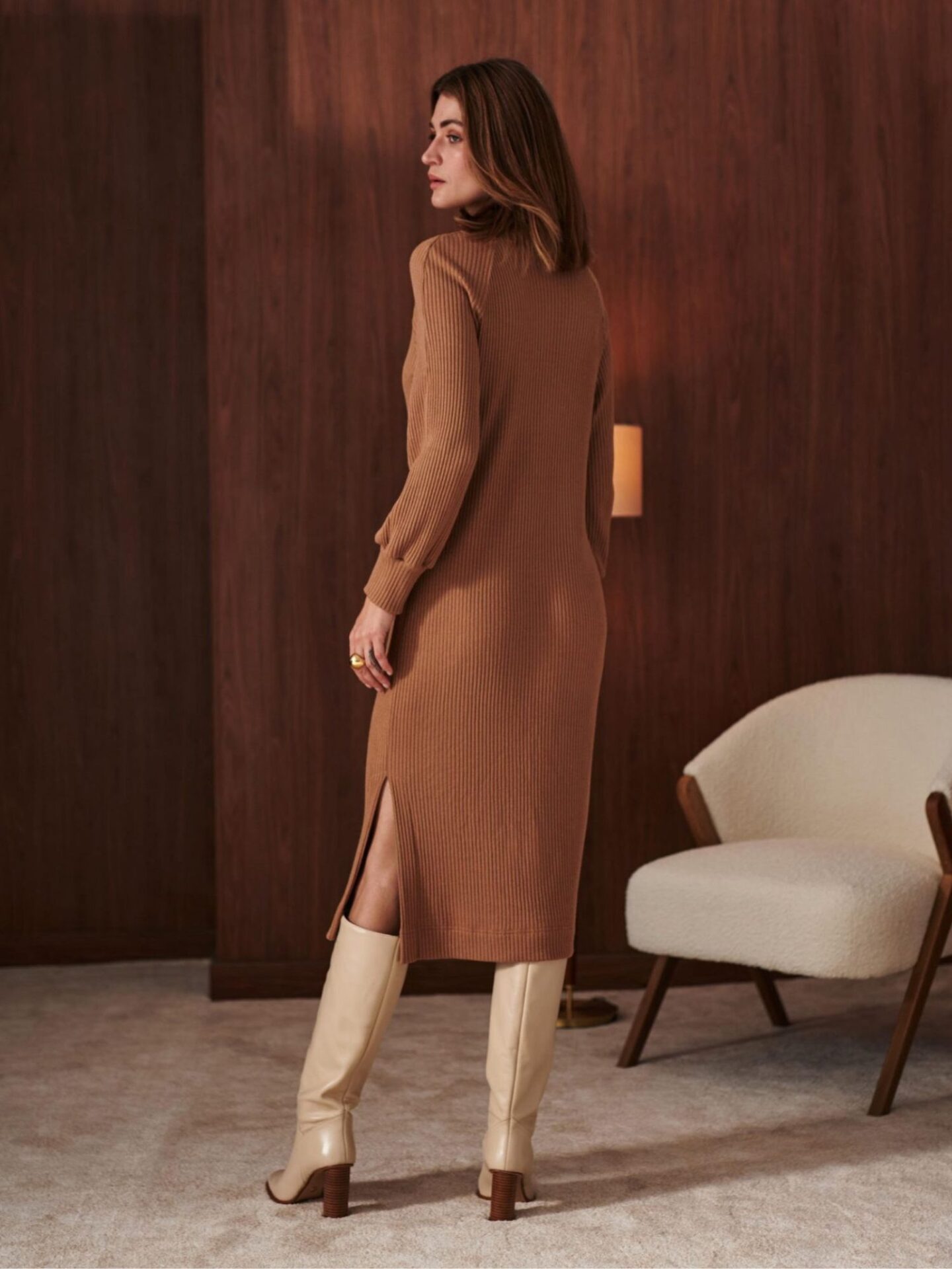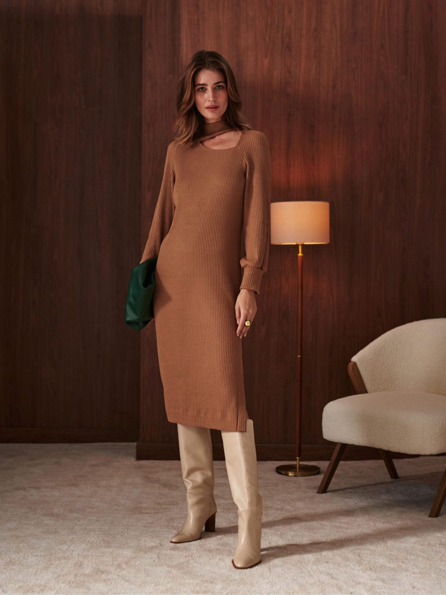 Dzianinowa sukienka Anataka to propozycja dla kobiet, które cenią wygodę, elegancję i ponadczasowy styl. Model doskonale sprawdza się w codziennych stylizacjach, a jednocześnie pozwala stworzyć bardziej dopracowany look na specjalne okazje. Camelowy kolor nadaje sukience klasyczny i ciepły charakter, dlatego łatwo dopasujesz ją do wielu dodatków. Dzięki długości za kolano sylwetka wygląda proporcjonalnie, a całość prezentuje się bardzo estetycznie. Prążkowany materiał subtelnie podkreśla figurę, jednocześnie nie krępując ruchów. Sukienka dobrze układa się na ciele, ponieważ dzianina naturalnie dopasowuje się do sylwetki. Model sprawdzi się zarówno w pracy, jak i podczas spotkań towarzyskich. Możesz zestawić go z kozakami, botkami lub eleganckimi butami na obcasie. Dzianinowa sukienka Anataka pasuje również do minimalistycznych dodatków, jednak dobrze wygląda także z wyrazistą biżuterią. Dzięki temu zyskujesz uniwersalny element garderoby, który łatwo dopasujesz do własnego stylu.
