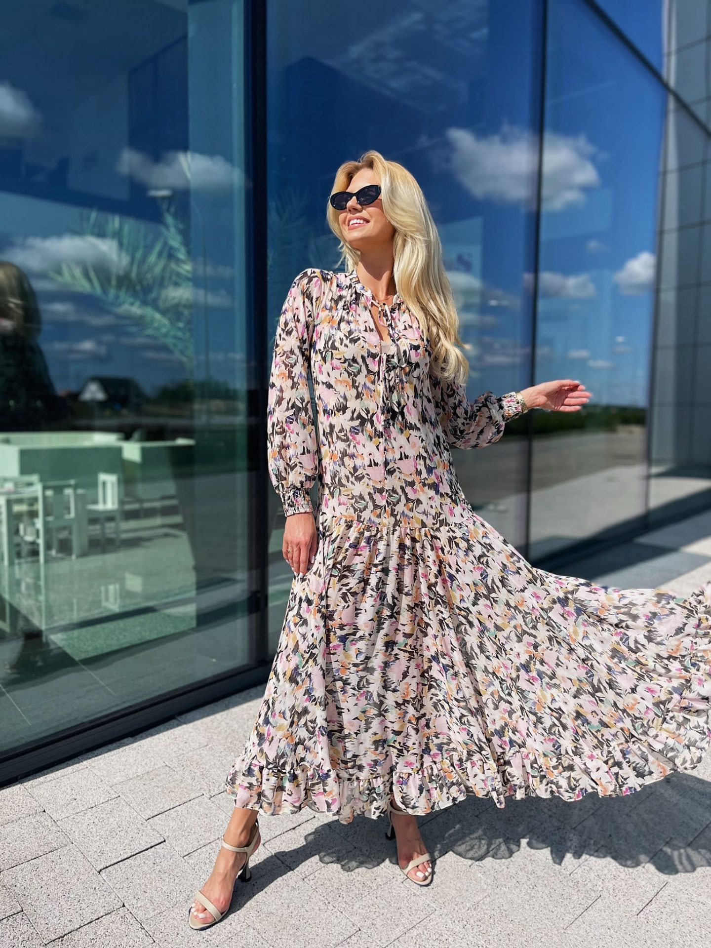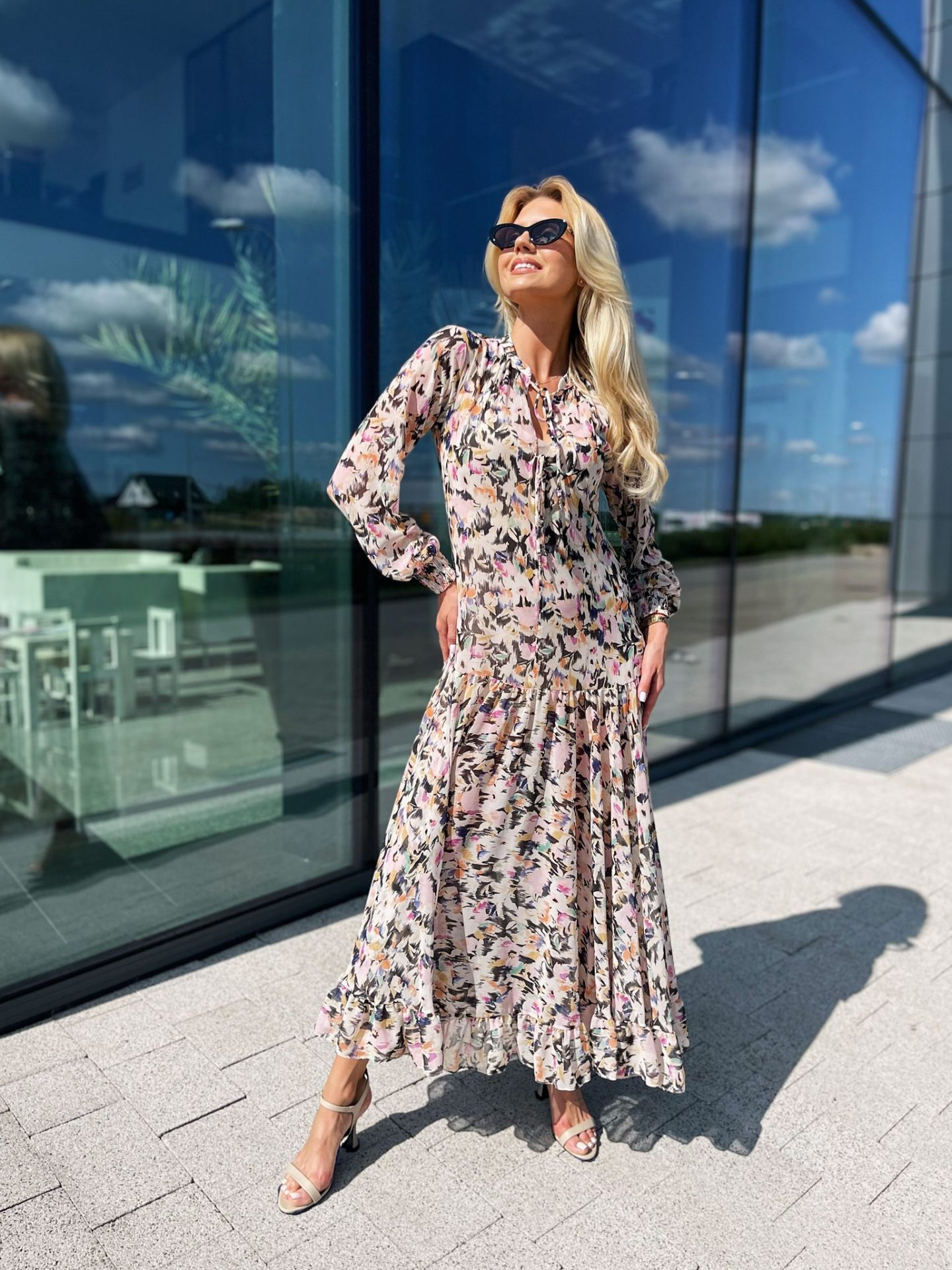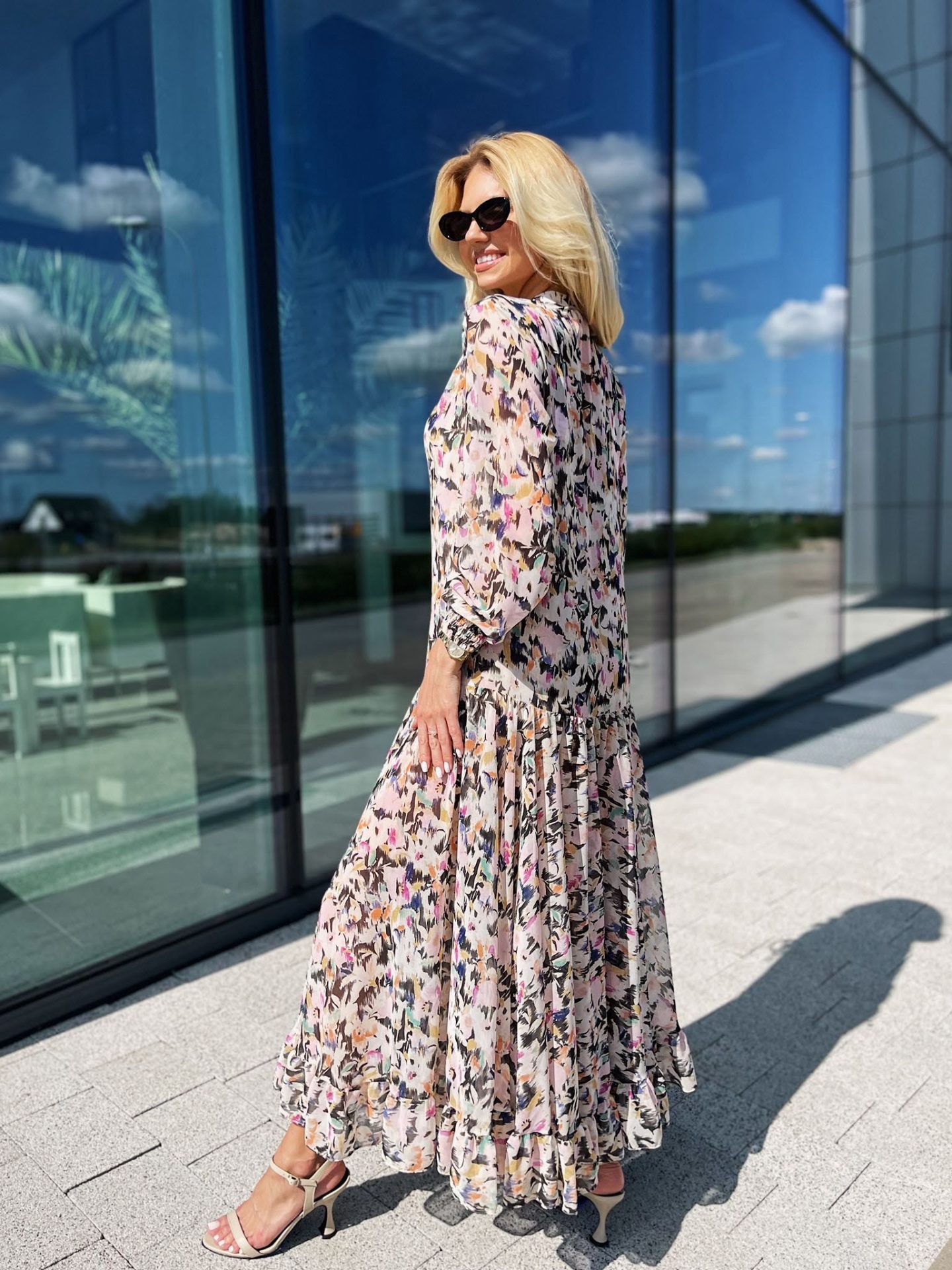 Sukienka jest wykonana z wysokiej jakości materiału, który zapewnia przewiewność i wygodę przez cały dzień. Sukienka maxi z pięknym, kwiatowym wzorem dodaje lekkości i romantycznego charakteru. Pastelowe odcienie z wielokolorowymi kwiatami idealnie komponują się z letnimi stylizacjami. Sukienka ma długość maxi, co sprawia, że jest doskonała na eleganckie wyjścia, uroczystości czy letnie przyjęcia. Długie rękawy zakończone delikatnymi marszczeniami dodają sukience subtelnego wdzięku. Okrągły dekolt z wiązaniem podkreśla kobiecość i dodaje zmysłowości. W zestawie znajduje się halka, która zapewnia dodatkowy komfort i lepsze dopasowanie.