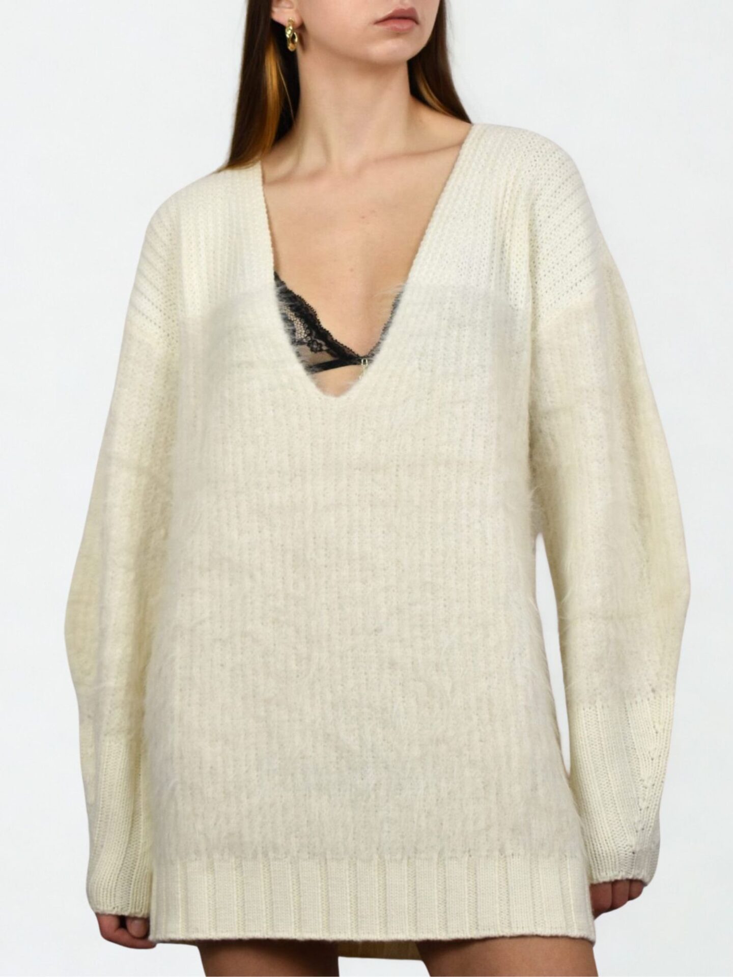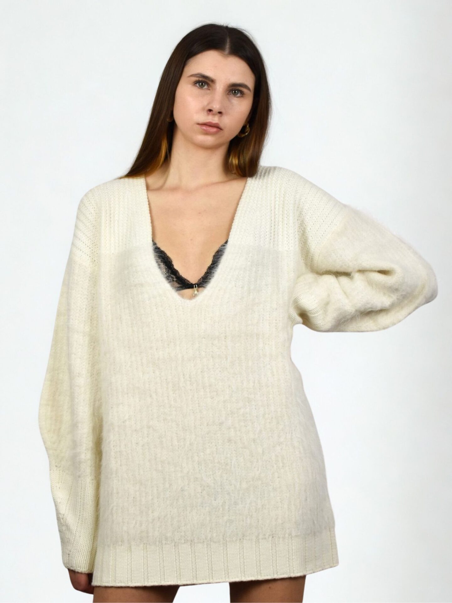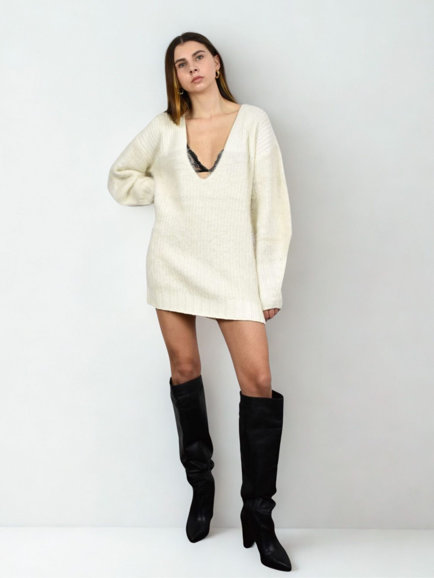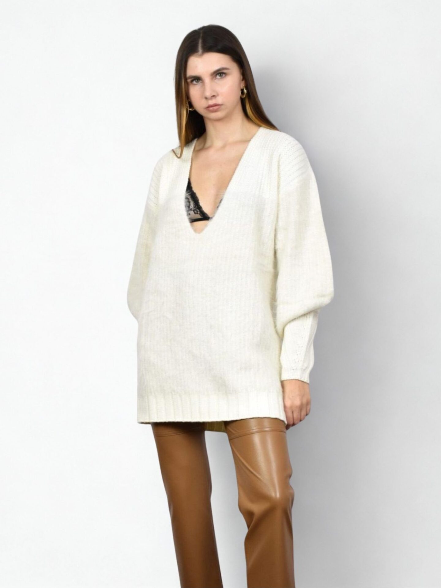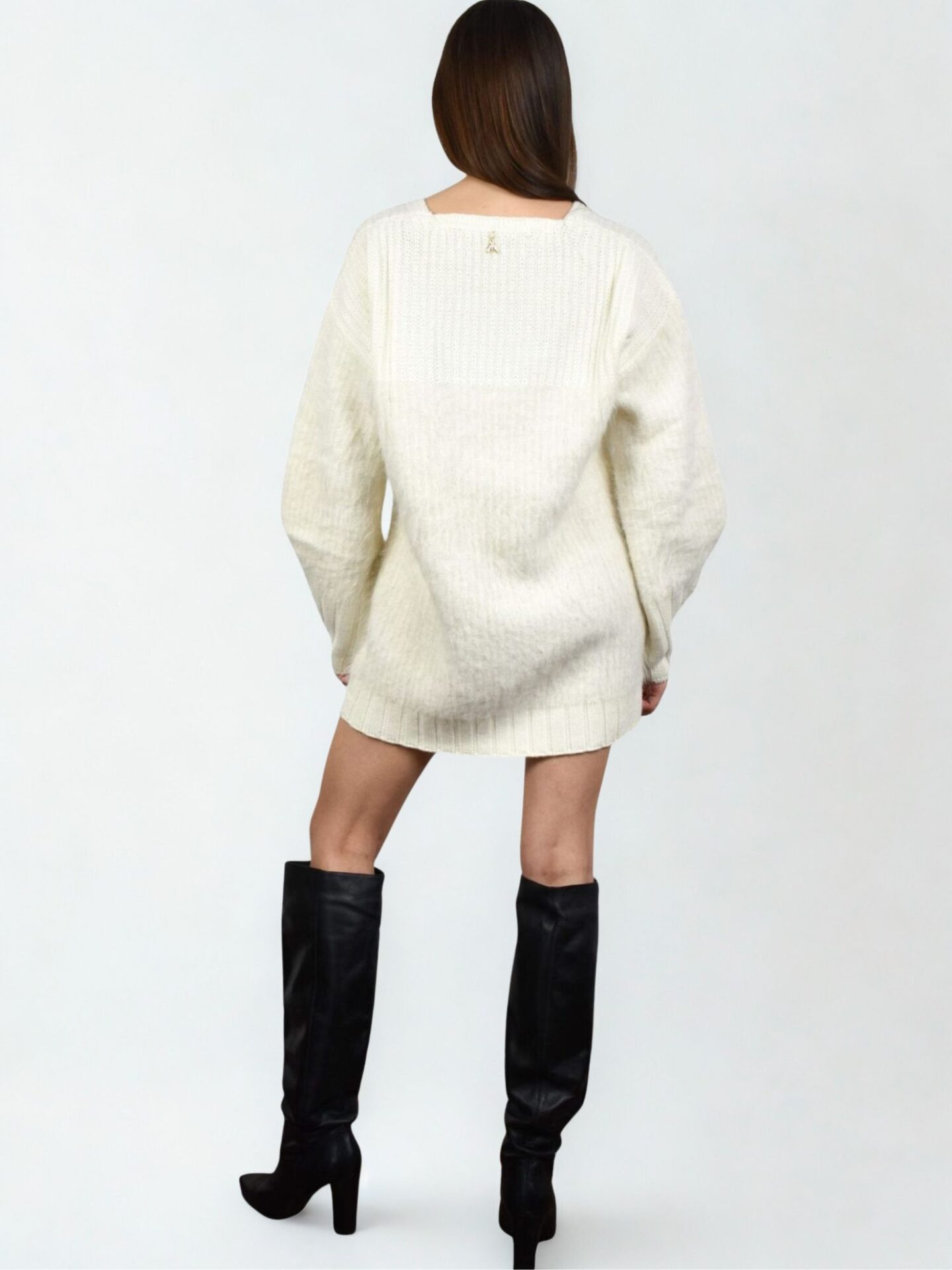 Ten model zachwyca prostotą i nowoczesną formą. Długi sweter Patrizia Pepe z głębokim dekoltem w serek pięknie eksponuje szyję i dekolt, podkreślając kobiecą sylwetkę. Kolor ecru dodaje mu lekkości i elegancji, jednocześnie pasując do różnych typów urody. Sweter można nosić zarówno w wersji solo – jako sukienkę, jak i w duecie z legginsami czy skórzanymi spodniami. To świetna baza do stylizacji na wiele okazji – od miejskich spacerów po wieczorne spotkania. Model doskonale łączy zmysłowość z codziennym komfortem.