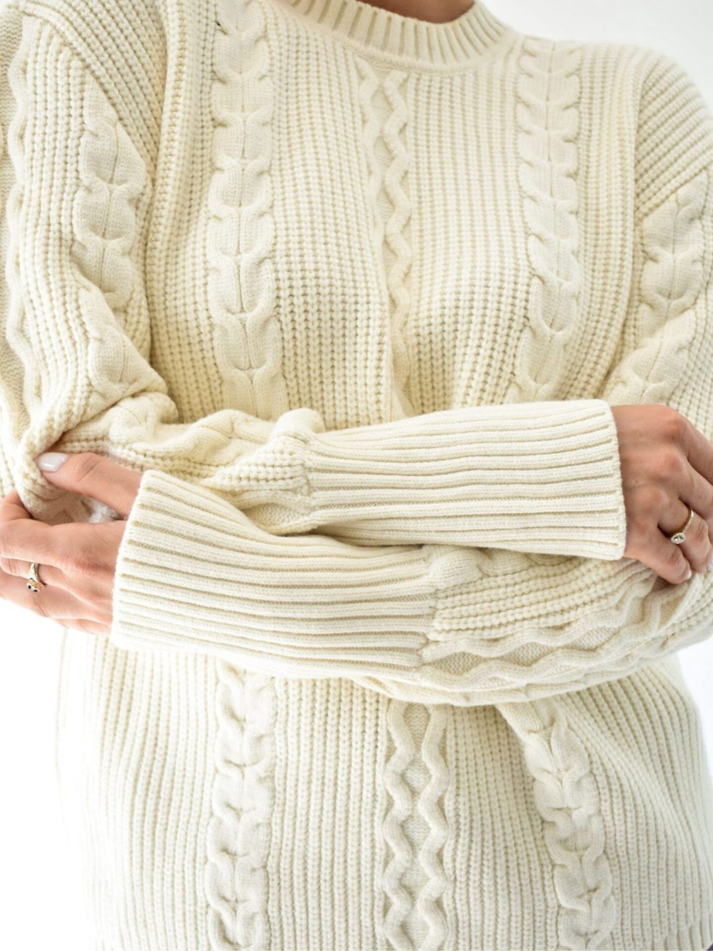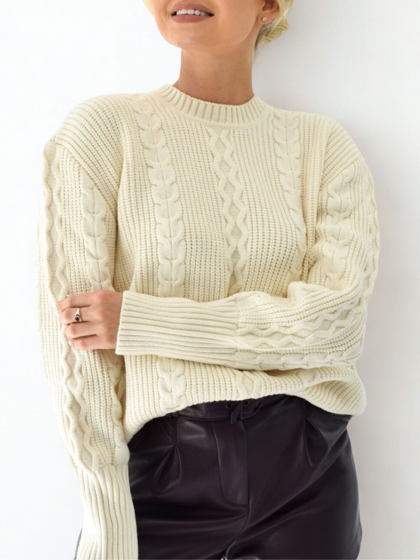 Wprowadź do swojej garderoby swobodną elegancję, którą oferuje sweter z wiskozy Patrizia Pepe. Ten model zachwyca klasyczną linią i ponadczasowym odcieniem ecru, który subtelnie rozświetla stylizację. Z pozoru minimalistyczny, skrywa w sobie oryginalne detale, które natychmiast przyciągają wzrok. Wyrazisty splot oraz symetryczne rozmieszczenie warkoczowych motywów sprawiają, że całość prezentuje się niezwykle efektownie. Sweter idealnie sprawdzi się zarówno w zestawieniu z klasycznymi jeansami, jak i bardziej wyrafinowanymi fasonami.