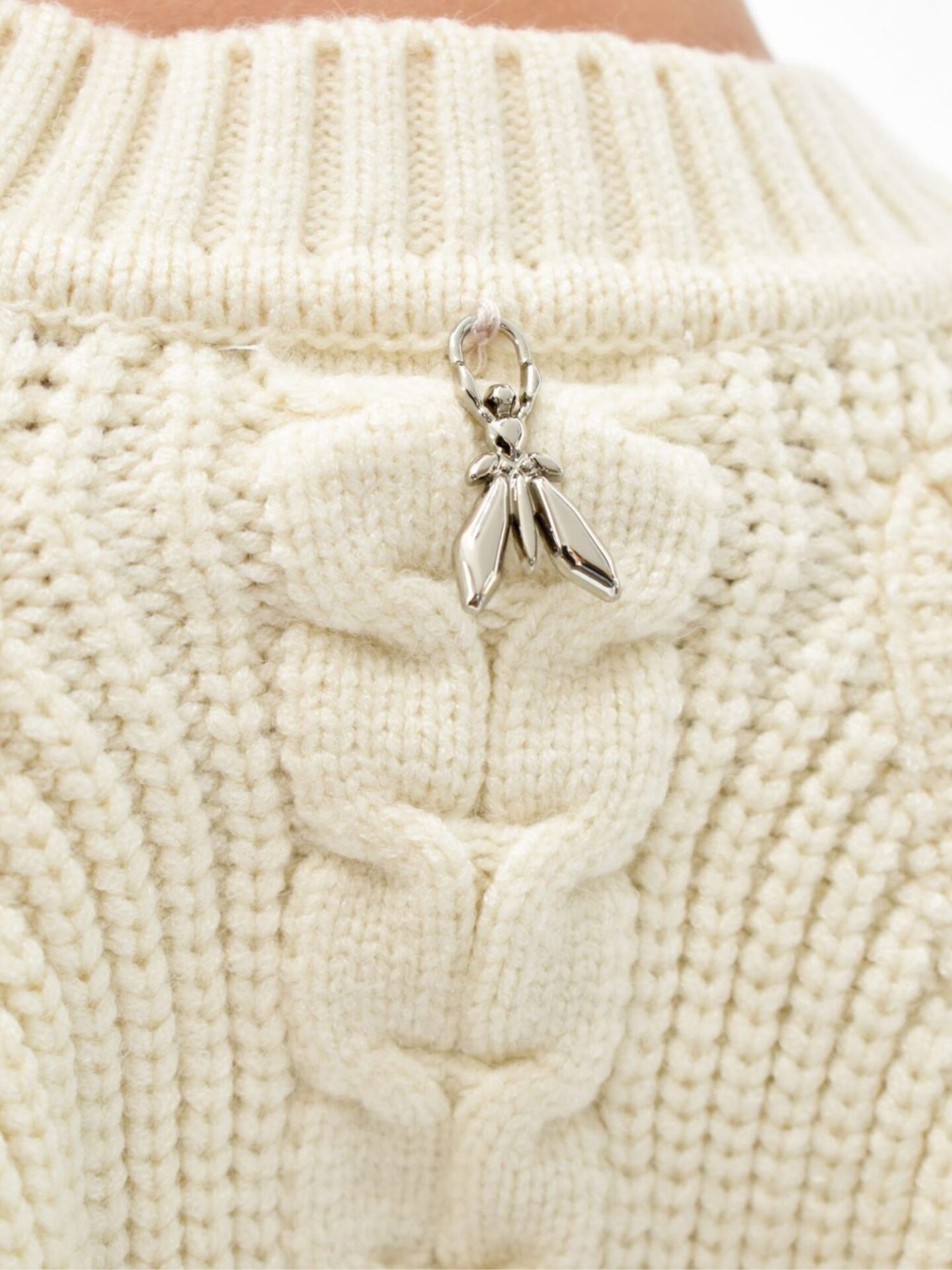 Niebanalnym akcentem są ozdobne wycięcia na łopatkach, które przyjmują delikatny kształt łezki. Dzięki nim całość zyskuje lekko awangardowy charakter, ale pozostaje w granicach eleganckiej estetyki. Taki element projektowy od razu wyróżnia ten model na tle innych klasycznych dzianin. Dodatkowo wykończenie w formie ściągaczy przy mankietach i dole swetra nadaje mu uporządkowaną formę. Z tyłu znajdziesz drobne, srebrne logo w kształcie ważki – to charakterystyczny symbol marki, który podkreśla jej włoskie korzenie i wysoką jakość.