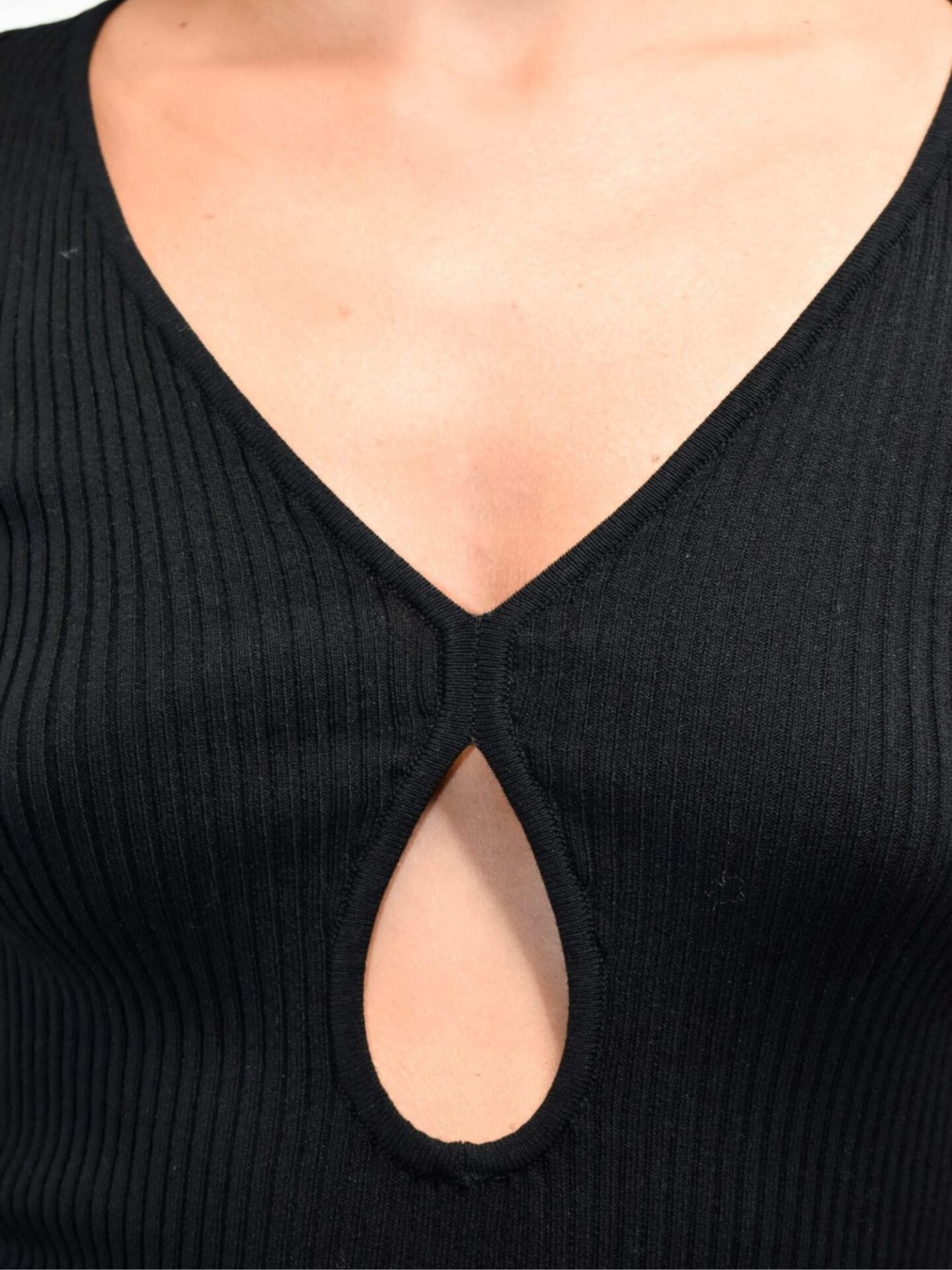 Najbardziej charakterystycznym elementem tej bluzki jest dekoracyjne wycięcie z przodu. Ma ono kształt łezki i znajduje się tuż pod dekoltem, który przybrał formę litery V. Taki detal optycznie wysmukla sylwetkę i dodaje całej stylizacji lekkości. Co więcej, to rozwiązanie prezentuje się bardzo kobieco, a jednocześnie nie przekracza granicy dobrego smaku.