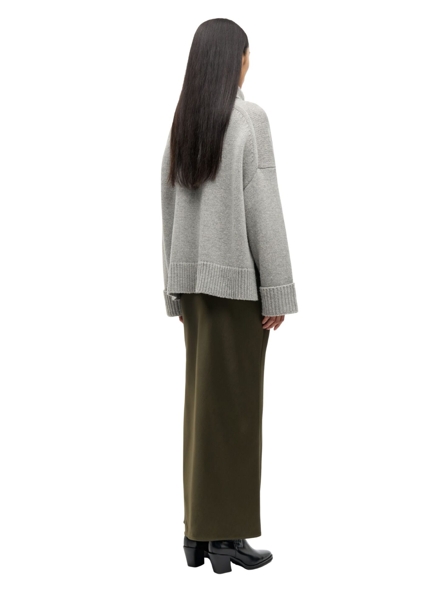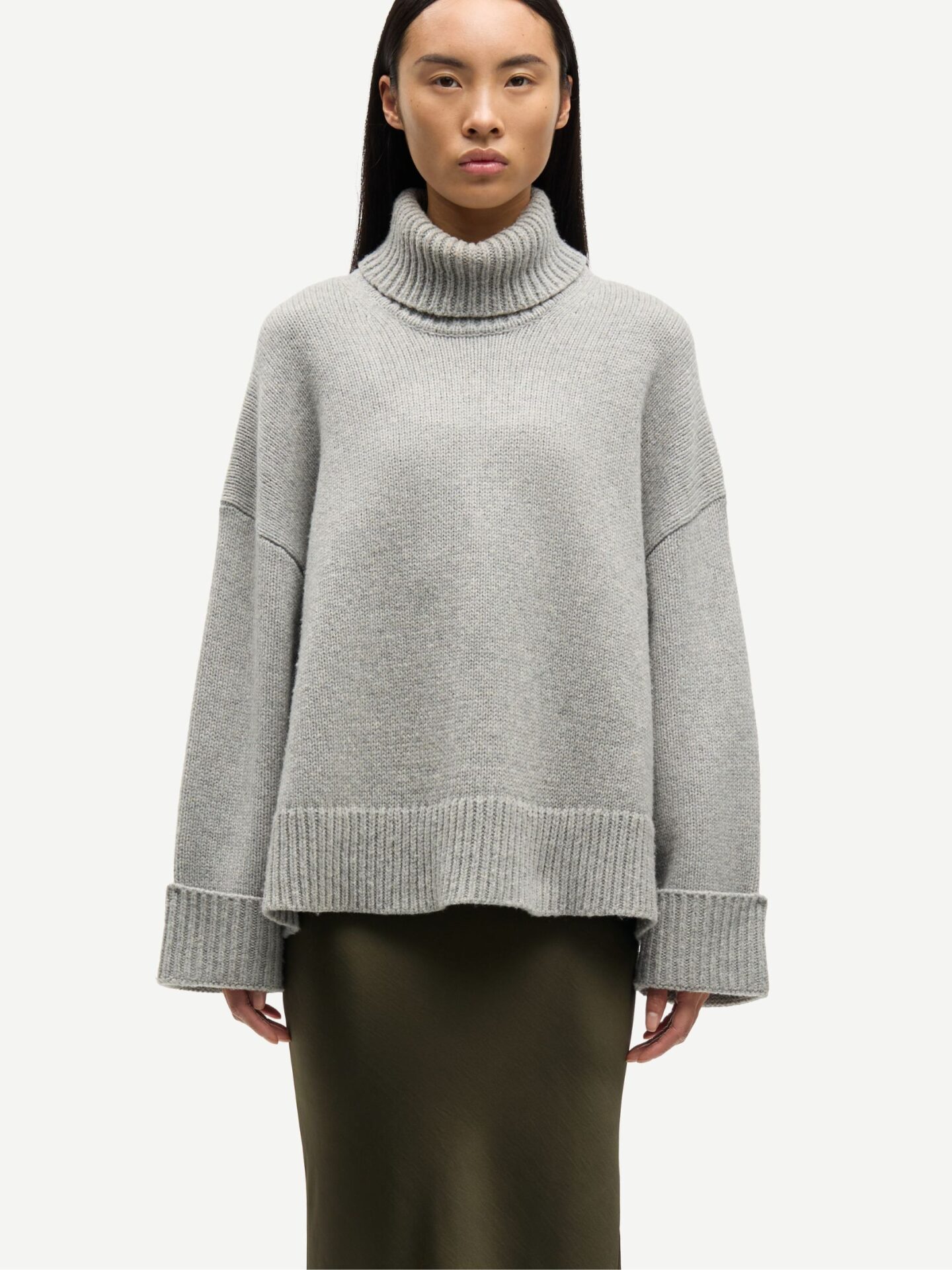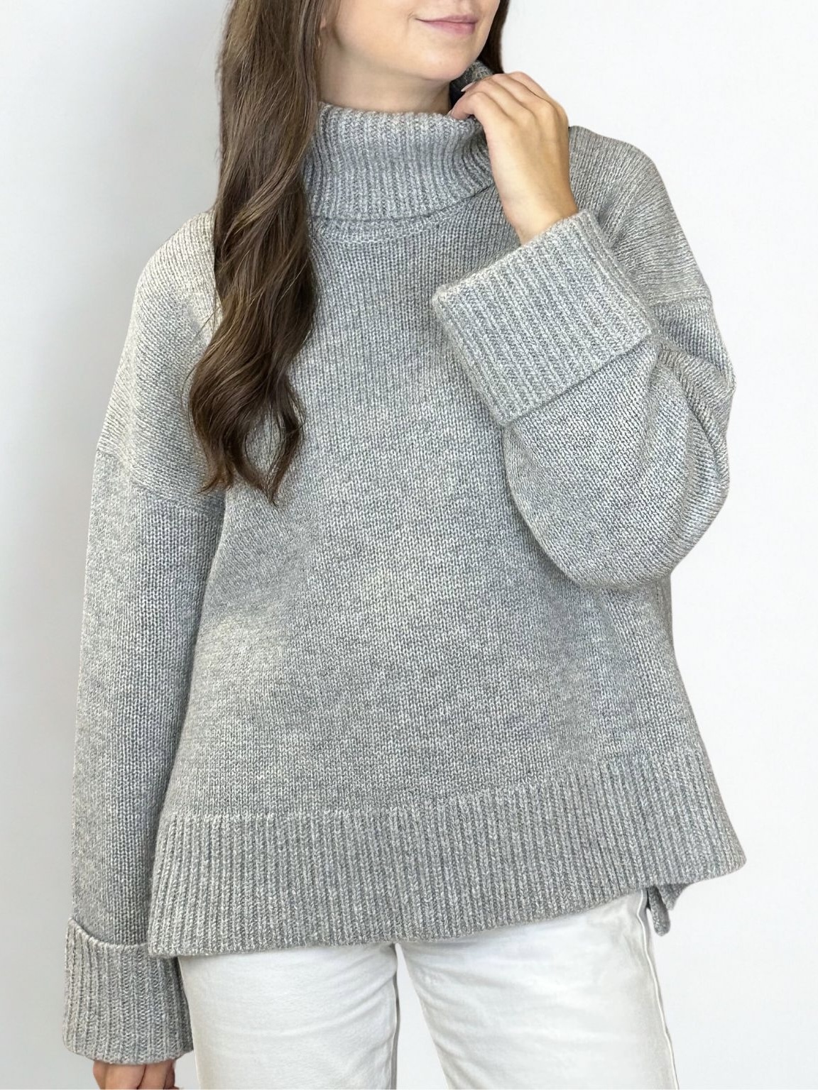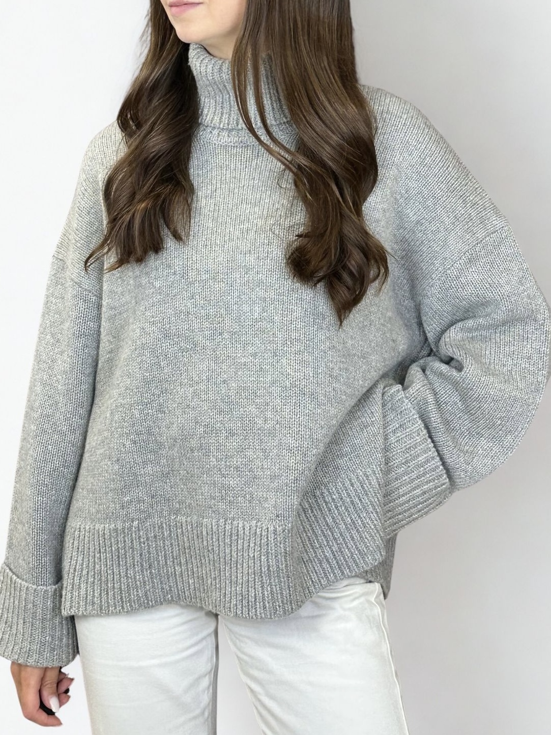 Sweter ma oversize’owy krój, dlatego zapewnia swobodę ruchów i wygodę na co dzień. Luźny fason pięknie układa się na sylwetce. Maskuje niedoskonałości i podkreśla nowoczesny styl. Z kolei charakterystyczny trapezowy kształt nadaje mu wyjątkowego charakteru. Jasnoszary kolor swetra podkreśla minimalistyczny design, dlatego idealnie wpisuje się w ponadczasowe trendy skandynawskiej mody. Model świetnie komponuje się z klasycznymi jeansami czy eleganckimi spodniami.