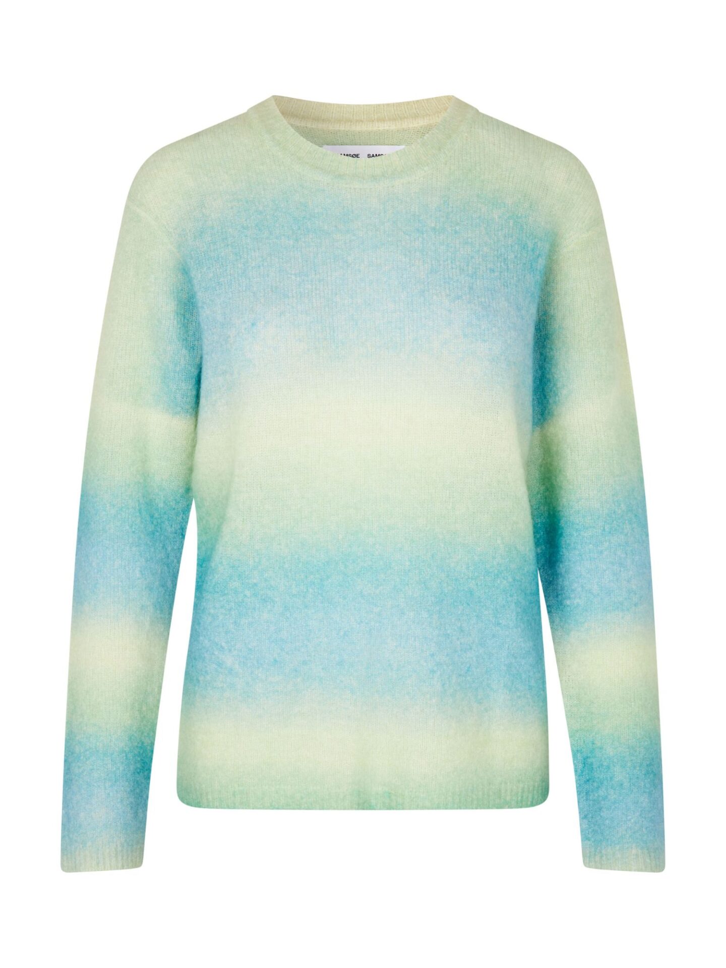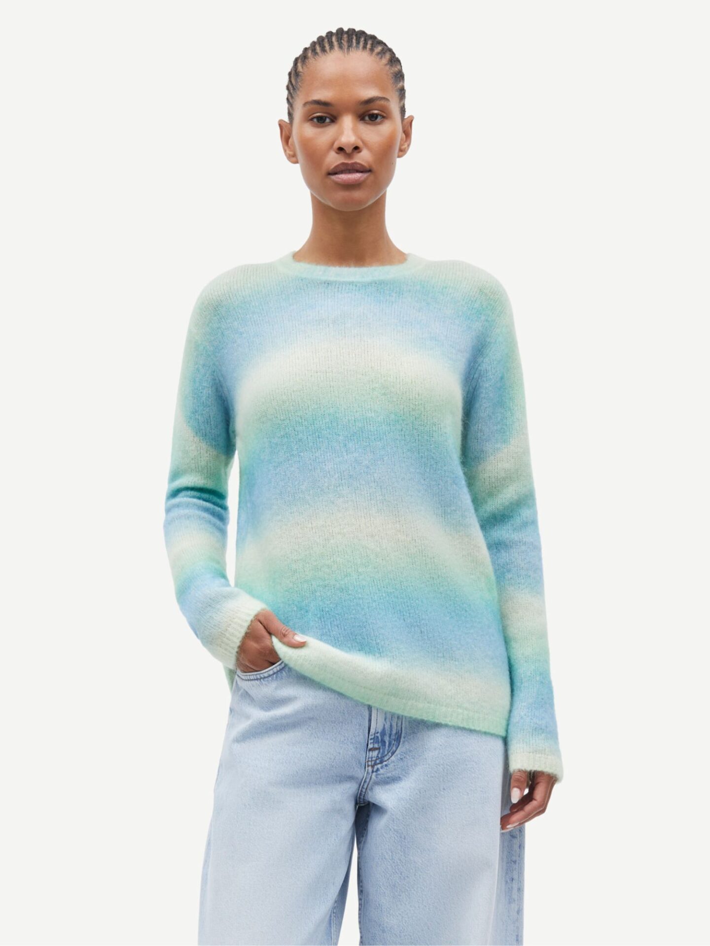 Sweter Salilou Samsøe Samsøe zachwyca unikalnym efektem ombre, który płynnie przechodzi od błękitu po delikatne odcienie beżu. Wykonany z miękkiej i lekkiej dzianiny, zapewnia komfort przez cały dzień. Klasyczny fason z długimi rękawami i okrągłym dekoltem sprawia, że model pasuje do wielu stylizacji.