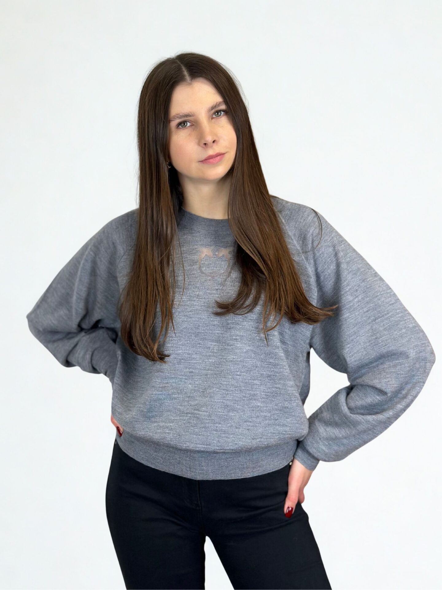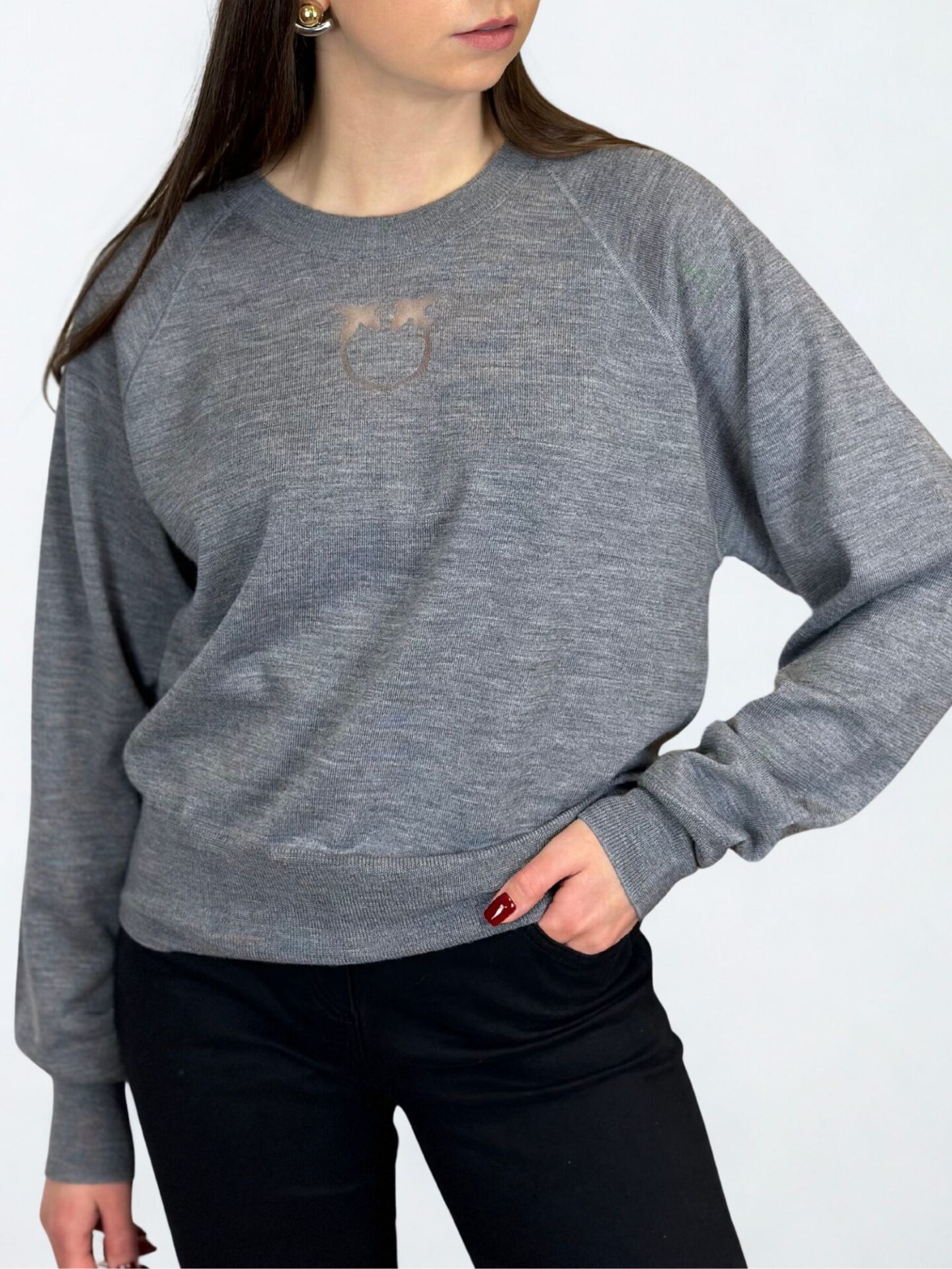 Delikatny odcień szarości podkreśla uniwersalny charakter modelu. Sweter z łatwością połączysz zarówno z klasycznymi jeansami, jak i eleganckimi spodniami czy spódnicą. Transparentne logo marki Pinko umieszczone z przodu nadaje całości nowoczesnego i rozpoznawalnego akcentu, który przyciąga uwagę, ale pozostaje subtelny.
