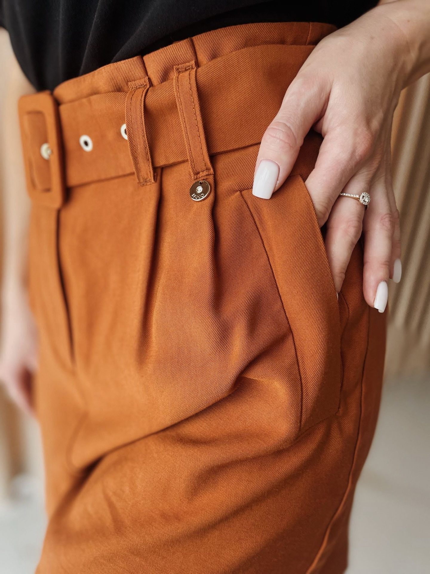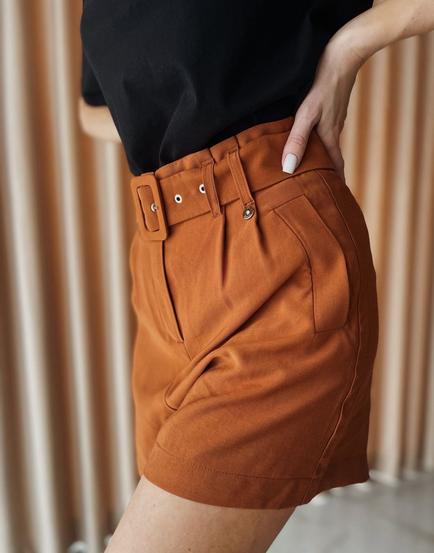 Szorty Liu Jo w kolorze rudym. Posiadają pasek, który można całkowicie wyciągnąć i nosić według preferencji. Krótkie spodenki z kieszeniami. Idealne do letnich stylizacji na sportowo oraz elegancko, ale także do stylizacji jesienno zimowych do rajstop i długich kozaków. Wykonane w 91% z wiskozy.