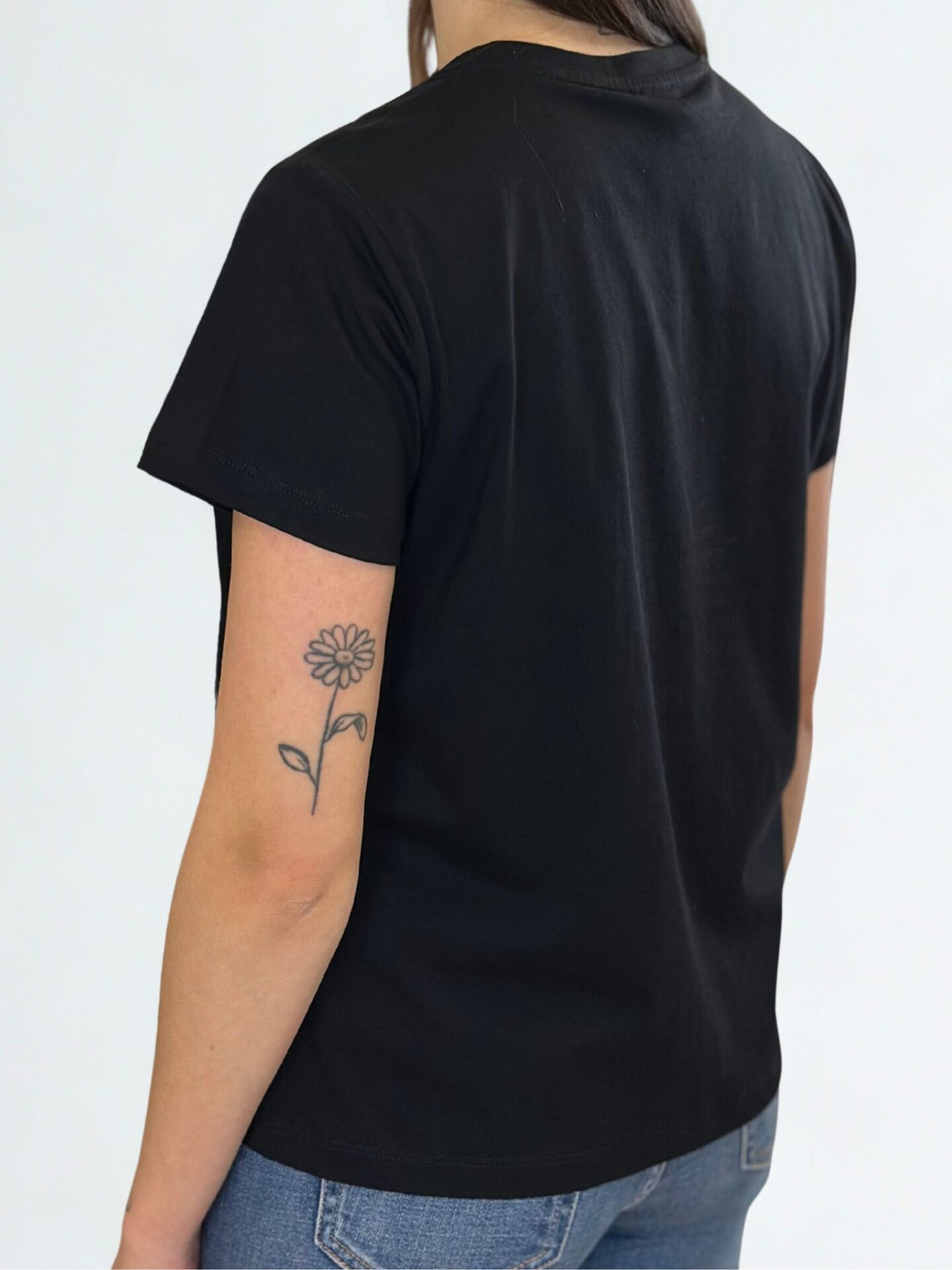Kładziemy duży nacisk na komfort noszenia. Ta czarna bluzka zaprojektowana została z myślą o maksymalnej wygodzie. Wykonana jest w 100% z wysokiej jakości bawełny. Gwarantuje to wyjątkową miękkość, a także przewiewność. Bawełna jest idealna na każdą porę roku. Materiał jest przyjemny dla skóry, a co więcej zapewnia komfort noszenia przez cały dzień. T-shirt posiada klasyczny krój. Daje on poczucie swobody, a także nie krępuje ruchów. Będzie służyć przez wiele sezonów, zachowując swój pierwotny wygląd. Wybierasz jakość oraz długotrwałość produktu.
