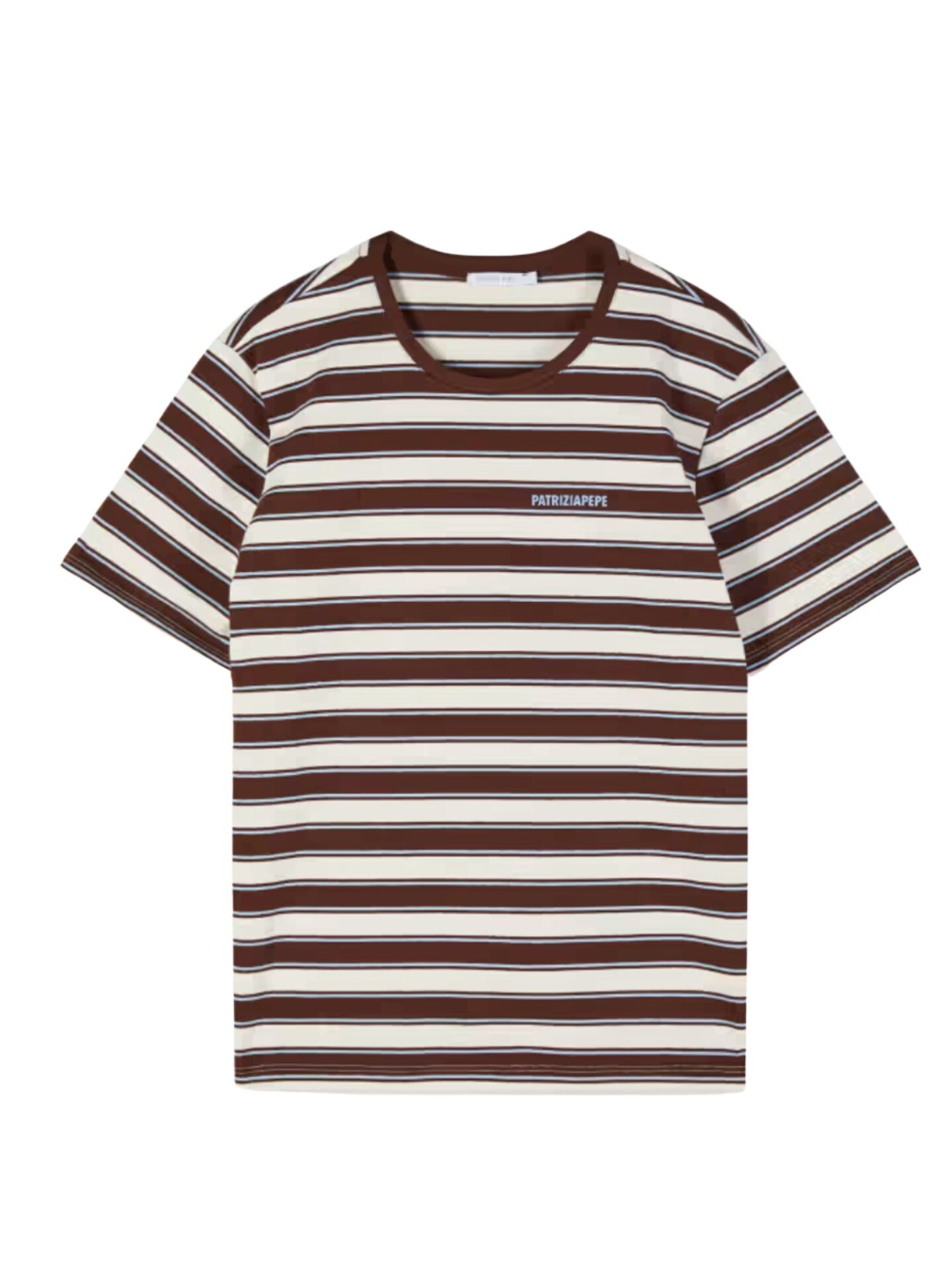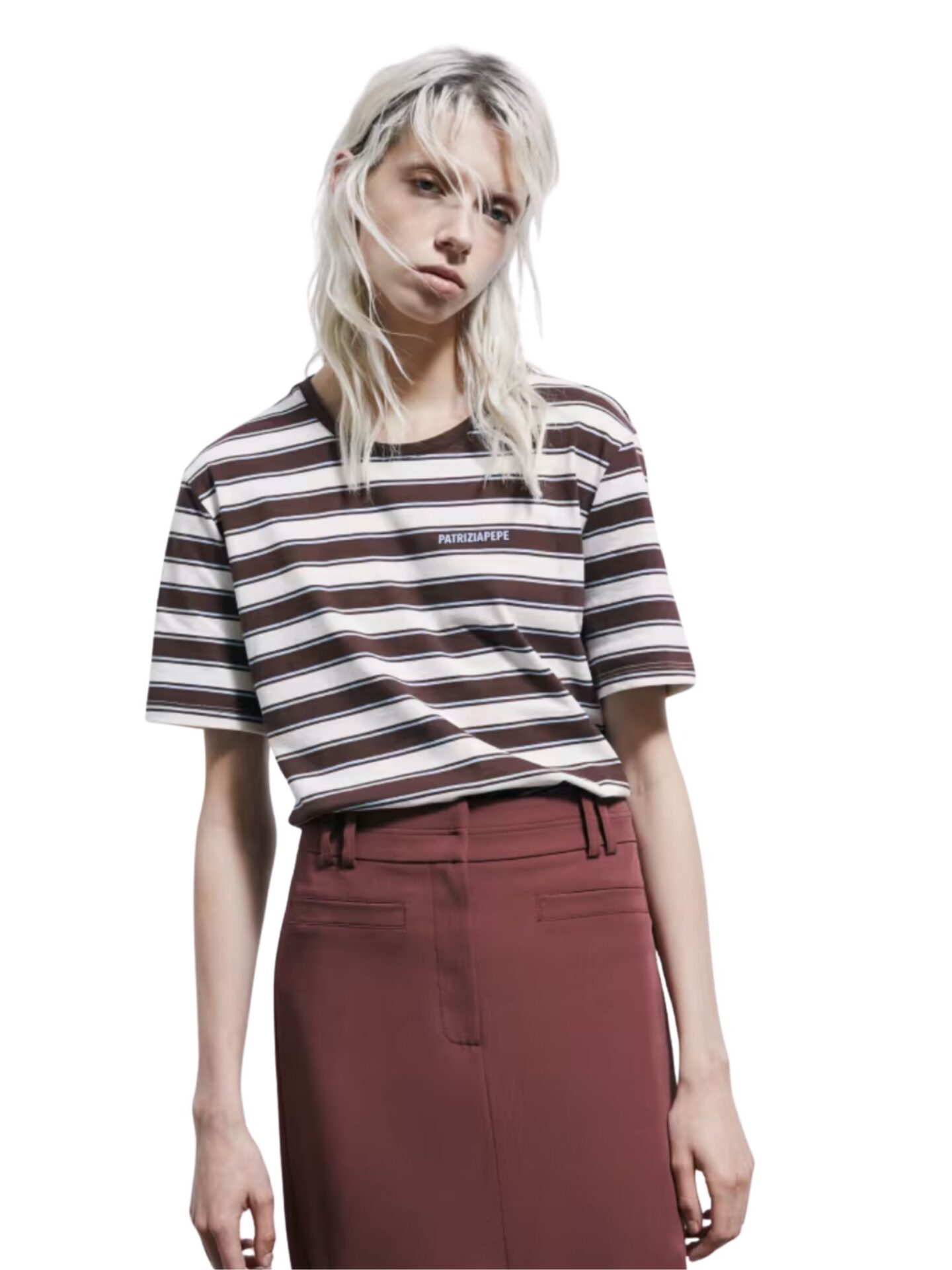 Koszulkę możesz łączyć na wiele sposobów, tworząc zarówno casualowe, jak i bardziej dopracowane zestawy. Koszulka świetnie wygląda w połączeniu z jeansami, szortami lub spódnicą midi. Możesz zestawić ją z marynarką, aby nadać stylizacji bardziej eleganckiego charakteru, albo nosić solo w luźnym, miejskim wydaniu. Kontrastowe paski przyciągają uwagę i ożywiają nawet najprostszy outfit. Subtelne logo marki umieszczone na przodzie podkreśla rozpoznawalny styl Patrizia Pepe. Bluzka Patrizia Pepe sprawdzi się zarówno w codziennych stylizacjach do pracy, jak i podczas weekendowych wyjść. To uniwersalna baza garderoby, która pozwala na swobodne eksperymentowanie z dodatkami.