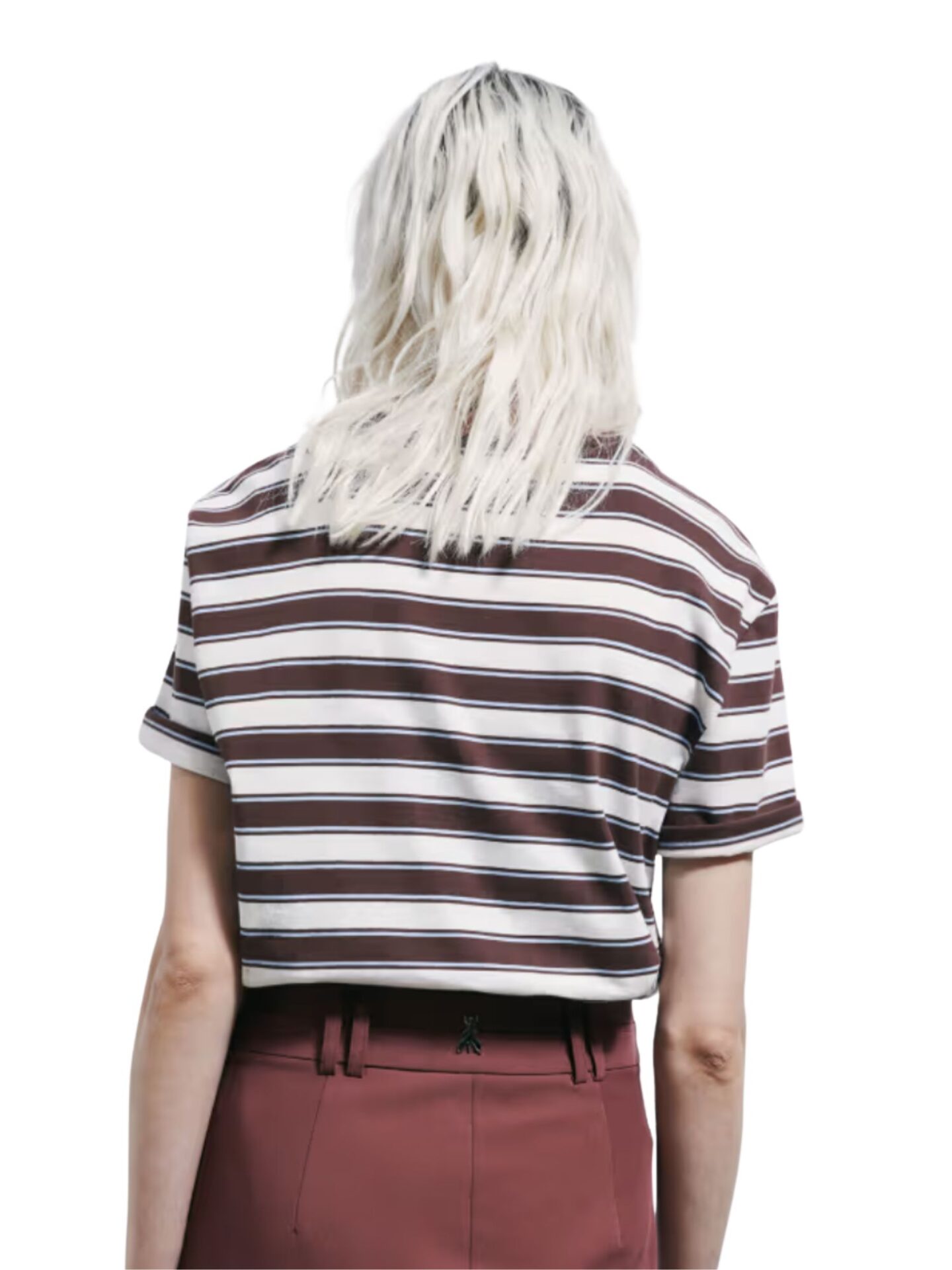 To propozycja dla kobiet, które cenią wygodę i wyrazisty detal w codziennych stylizacjach. Model został wykonany w 100% z wysokiej jakości bawełny, dzięki czemu jest miękki, przewiewny i przyjemny w kontakcie ze skórą. Naturalny skład zapewnia komfort noszenia przez cały dzień, niezależnie od pory roku. Klasyczny fason z krótkim rękawem i okrągłym dekoltem sprawia, że koszulka dobrze układa się na sylwetce i pasuje do wielu typów figury. Połączenie kolorów ecru, bordowego i błękitnego nadaje całości świeżego, nowoczesnego charakteru. Paski są jednym z najmocniejszych trendów tego sezonu, dlatego ten model świetnie wpisuje się w aktualne kierunki mody. T-shirt w paski Patrizia Pepe łączy ponadczasowy wzór z modowym wyczuciem marki.