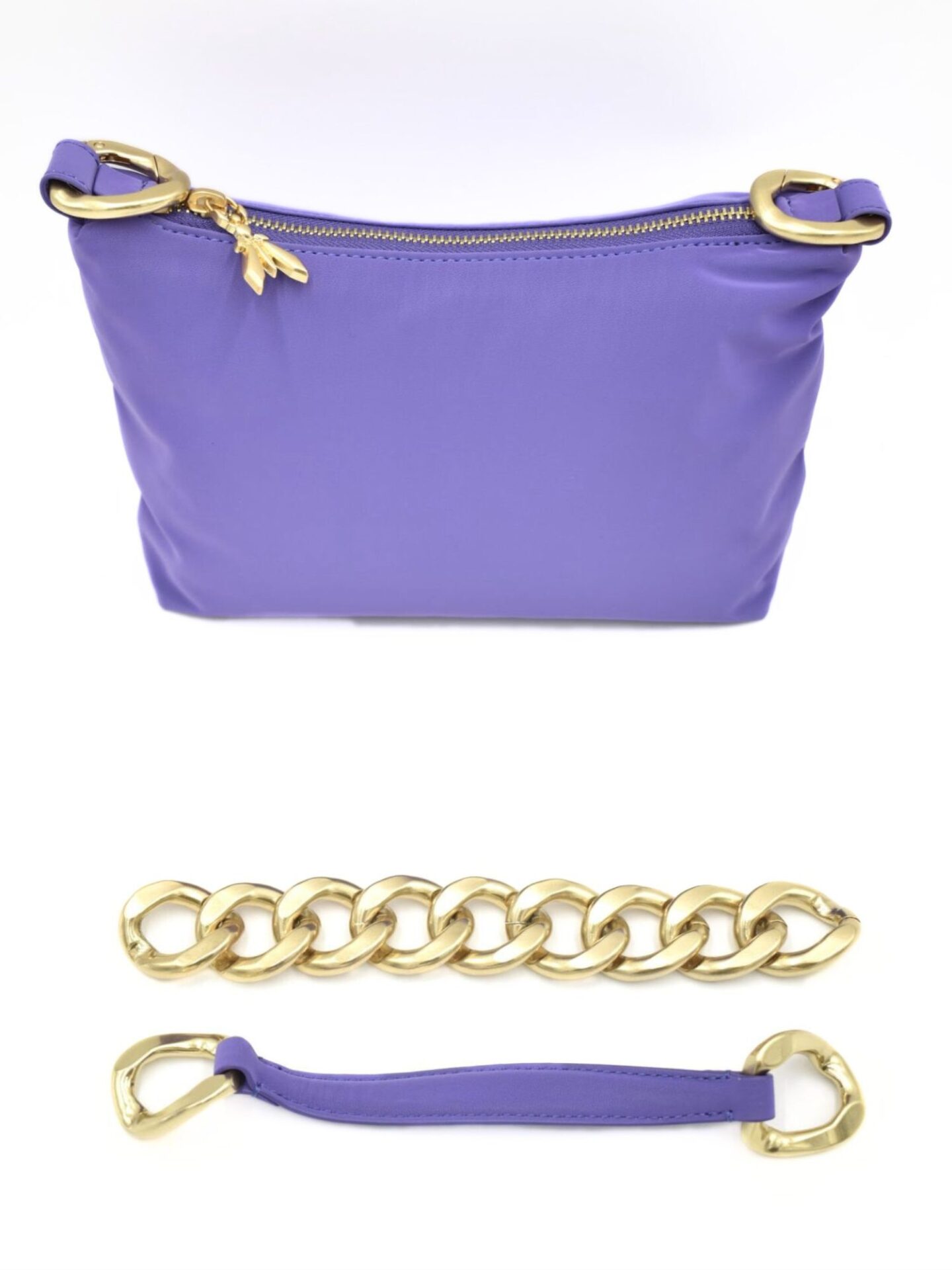 Model zachwyca nie tylko kolorem, ale też wyjątkowymi detalami. Torebka posiada dwa wymienne paski – jeden klasyczny, drugi w formie złotego łańcucha, który natychmiast przyciąga uwagę i dodaje eleganckiego charakteru. Dzięki możliwości zmiany paska z łatwością dopasujesz torebkę do okazji – nosisz ją w dłoni, na ramieniu lub jako crossbody. Zamek błyskawiczny zakończony charakterystyczną zawieszką w kształcie muchy podkreśla markowy styl Patrizia Pepe. Każdy element został starannie dopracowany, aby nadać całości luksusowy wygląd.