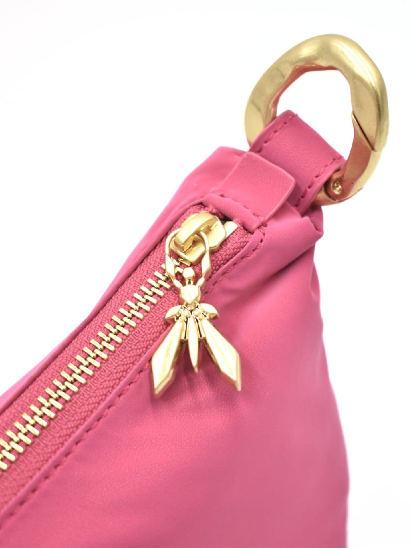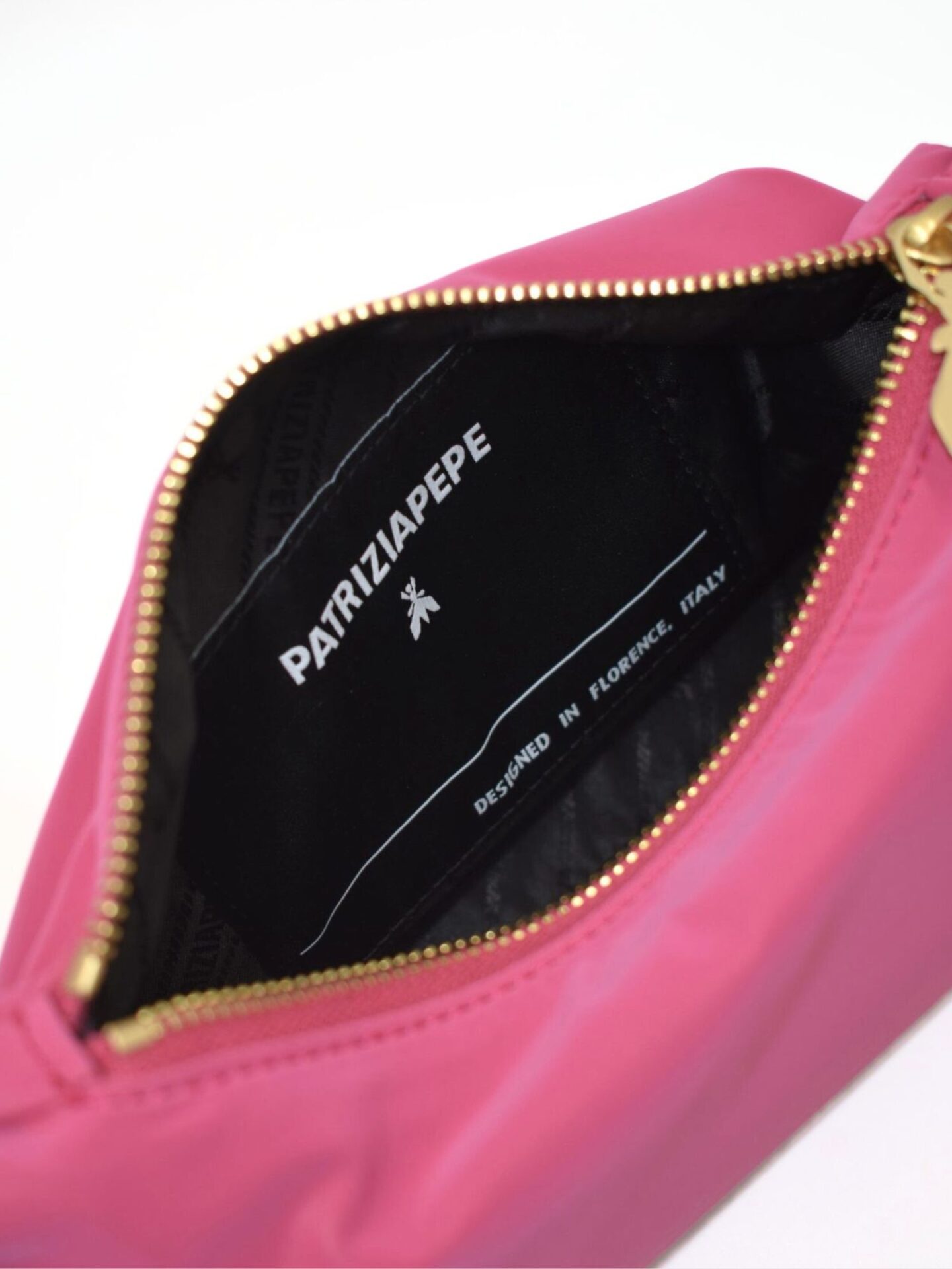 Model wyróżnia się dbałością o detale, które są znakiem rozpoznawczym marki Patrizia Pepe. Zamek błyskawiczny wieńczy zawieszka w kształcie charakterystycznej muchy – symbolu marki. Dwa wymienne paski pozwalają dopasować torebkę do stylizacji i nastroju. Jeden z nich to szeroki, złoty łańcuch, który nadaje całości wyrazistości i luksusowego charakteru. Drugi to prosty, nylonowy pasek w kolorze torebki, który doskonale sprawdza się w codziennym użytkowaniu.