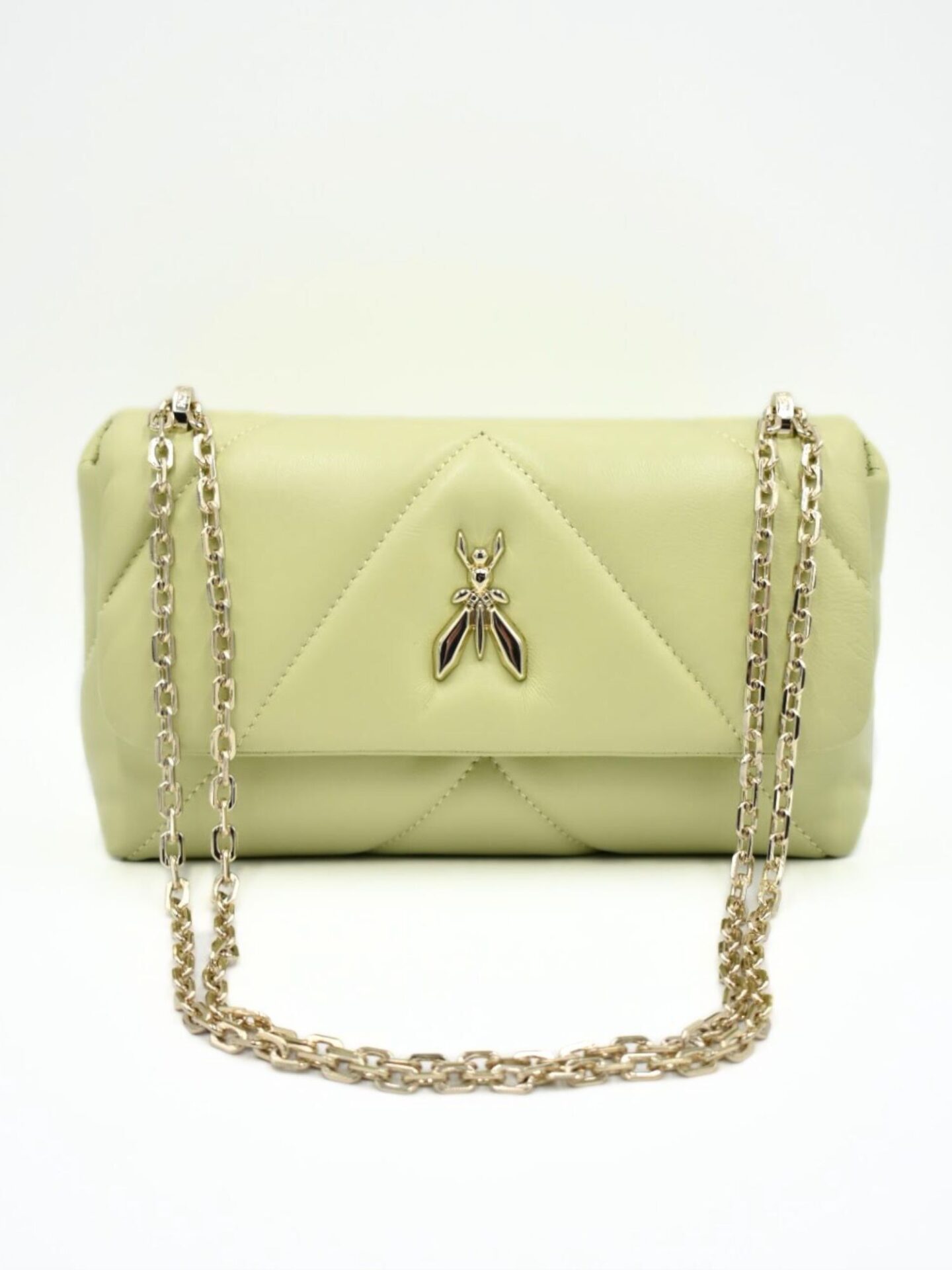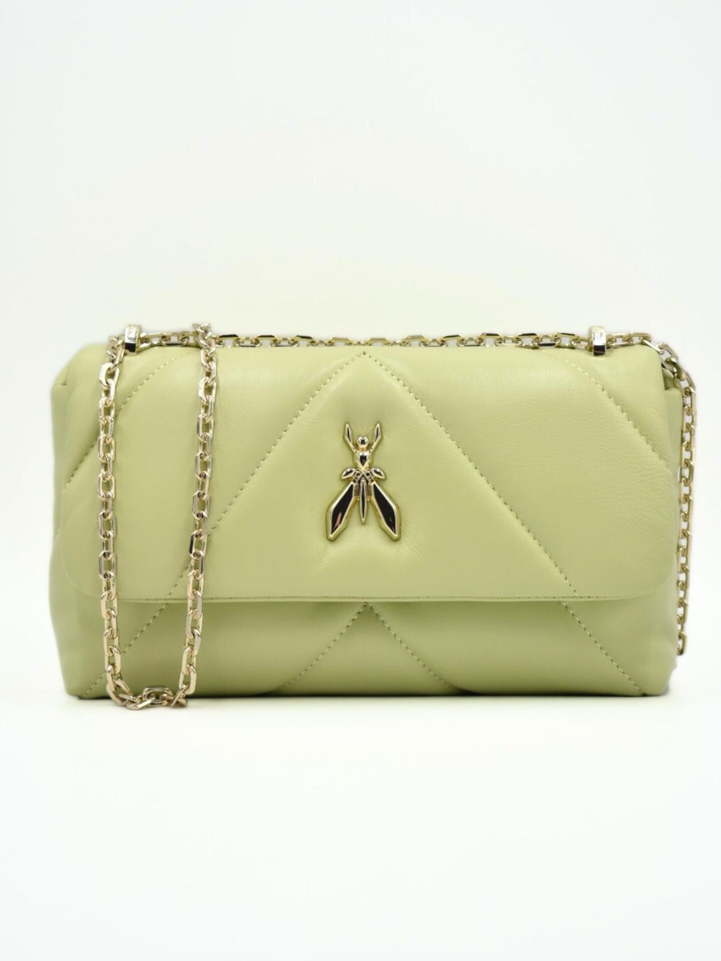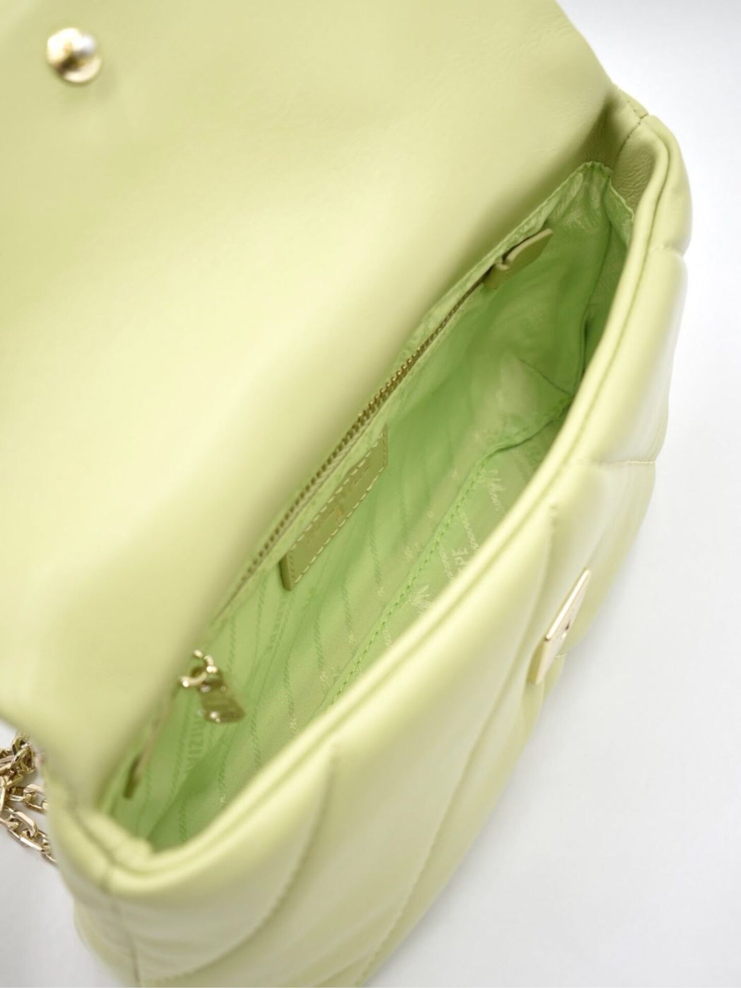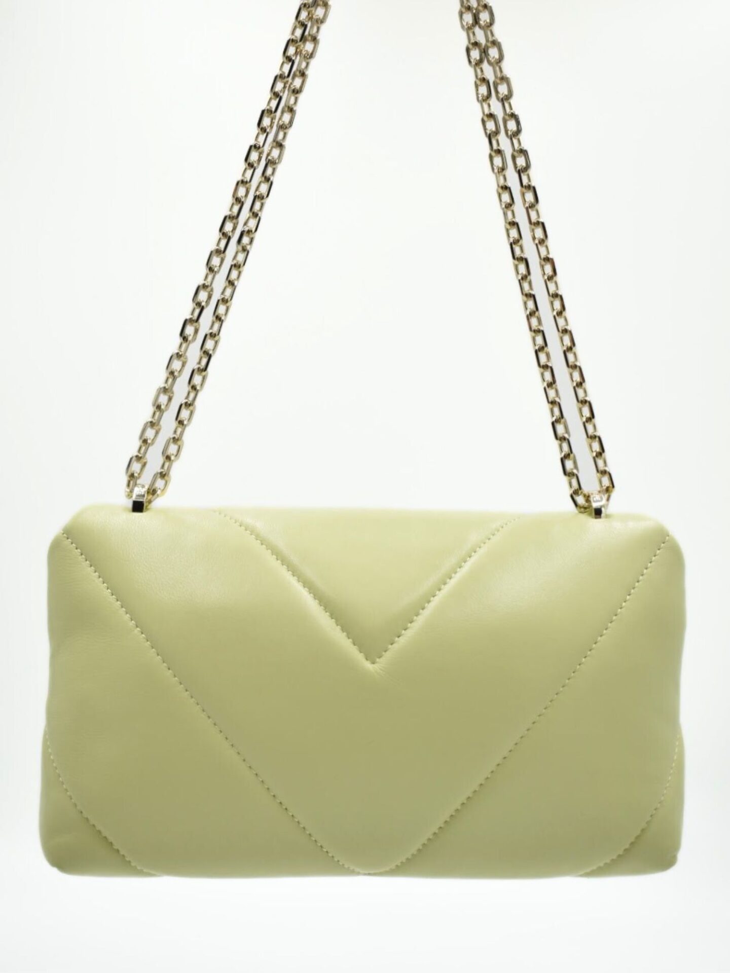 Torebkę wykonano z miękkiej, wysokiej jakości skóry naturalnej, która prezentuje się niezwykle szlachetnie. Jej limonkowy kolor świetnie współgra ze złotymi elementami – eleganckim łańcuszkiem, logo marki w formie charakterystycznej muchy oraz subtelnymi detalami wykończenia. Pikowanie w geometryczny wzór nie tylko zdobi, lecz także nadaje całości nowoczesnego charakteru. W zestawie znajduje się bawełniany worek przeciwkurzowy, który doskonale sprawdzi się zarówno do przechowywania torebki w domu, jak i podczas podróży.
