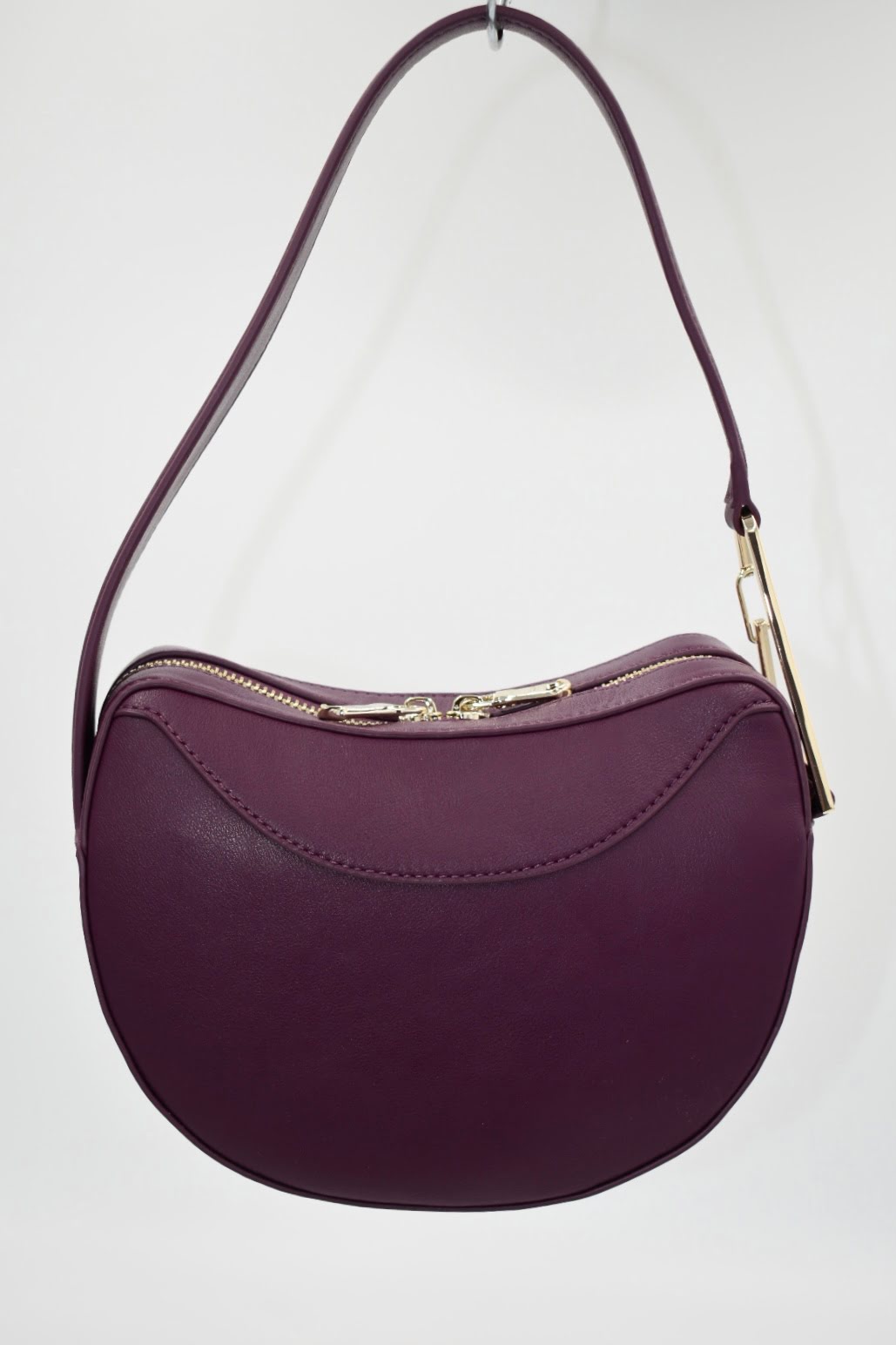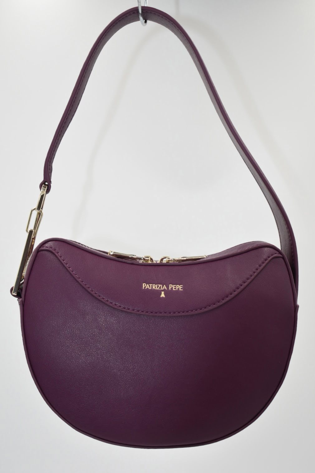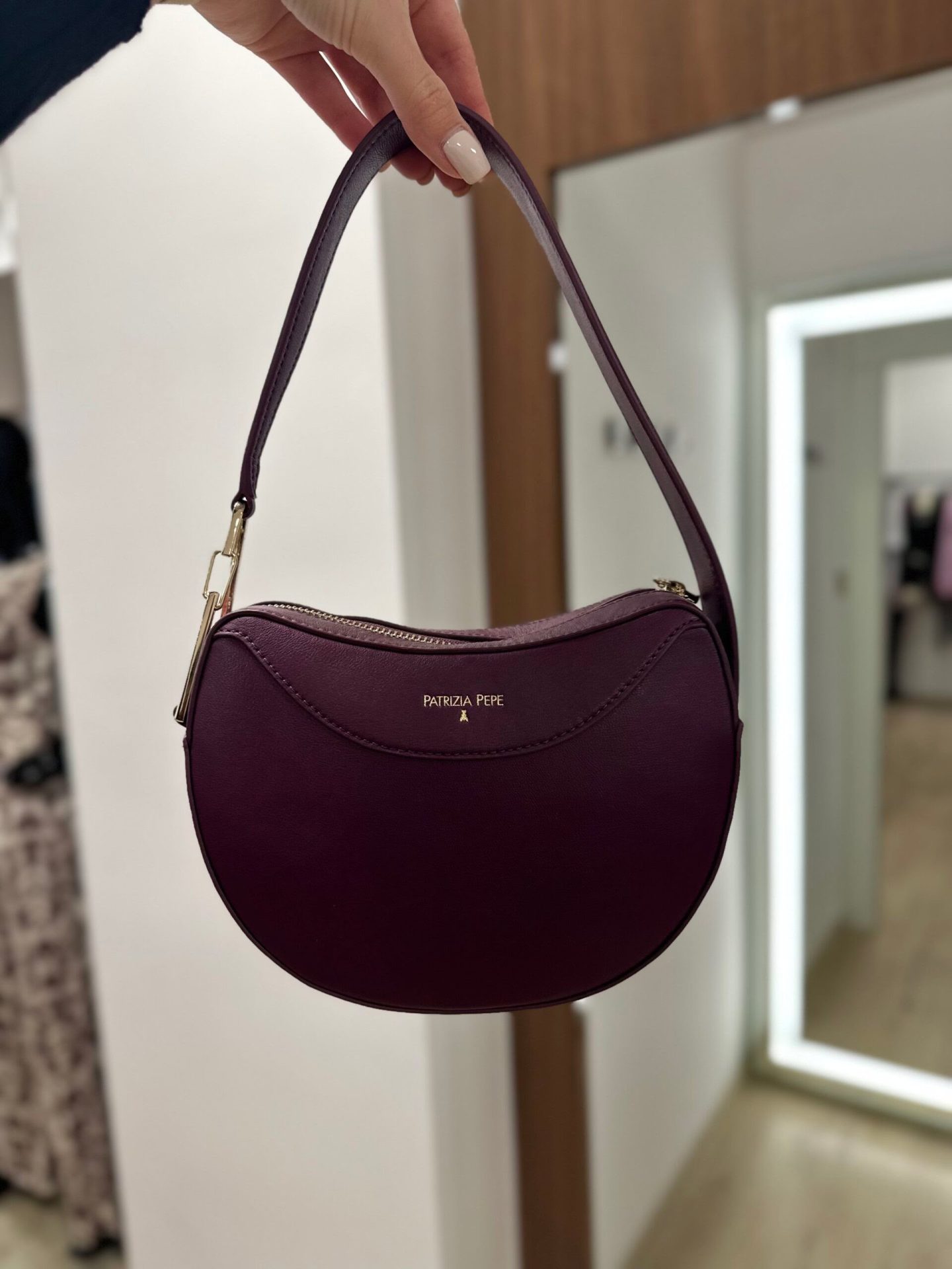 Torebka ze skóry naturalnej włoskiej marki Patrizia Pepe w kolorze śliwkowym. Wykonana z gładkiej skóry. Torebka na ramię lub do ręki. Z przodu torebki delikatny, nierzucający się w oczy napis Patrizia Pepe oraz logo marki. Wnętrze torebki to jedna duża komora oraz jedna mniejsza. Zamek działający w dwie strony. Dodatki w kolorze jasnego złota. Torebka idealnie sprawdzi się zarówno do codziennych stylizacji jak i na większe bardziej eleganckie wyjścia. W zestawie bawełniany worek przeciwkurzowy do przechowywania.