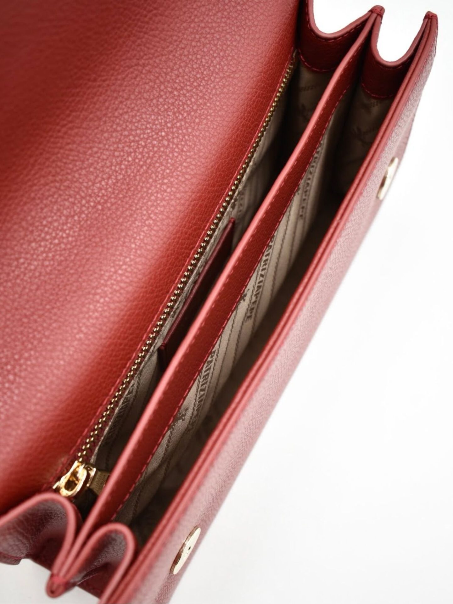 Wnętrze torebki zaskakuje funkcjonalnością. Producent podzielił je na trzy przegrody, w tym jedną zapinaną na zamek, co umożliwia bezpieczne przechowywanie najważniejszych drobiazgów. Bez trudu zmieścisz w niej portfel, telefon, klucze czy etui na karty. Każda rzecz znajdzie swoje miejsce, a dostęp do nich pozostaje szybki i wygodny. Środek wykończono podszewką z subtelnym wzorem, co dodatkowo podnosi walory estetyczne modelu. Starannie przemyślana organizacja wnętrza sprawia, że torebka świetnie sprawdza się w dynamicznym rytmie dnia.