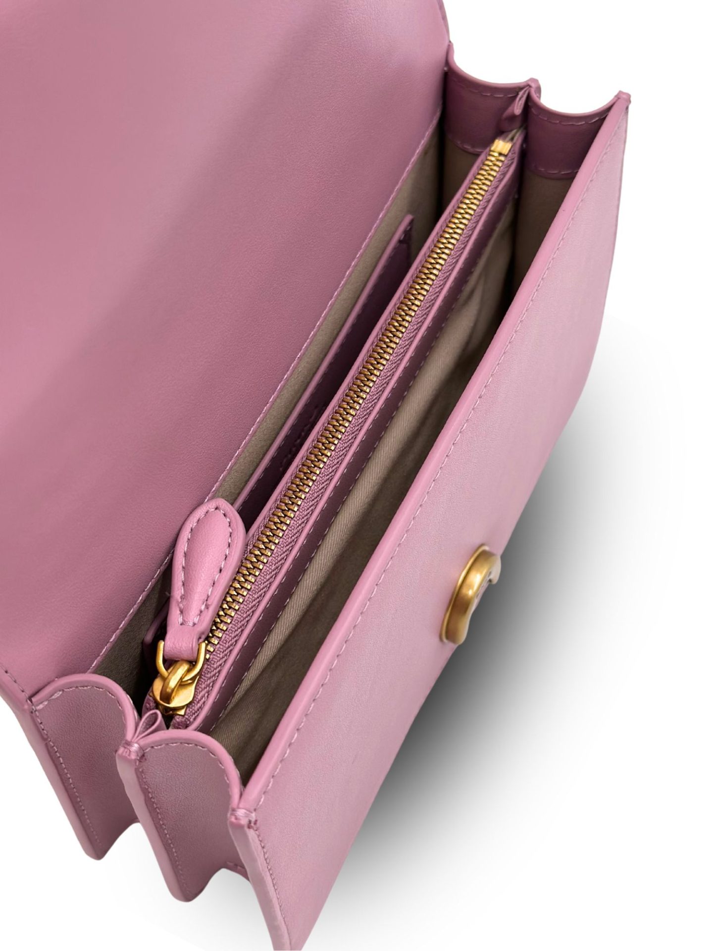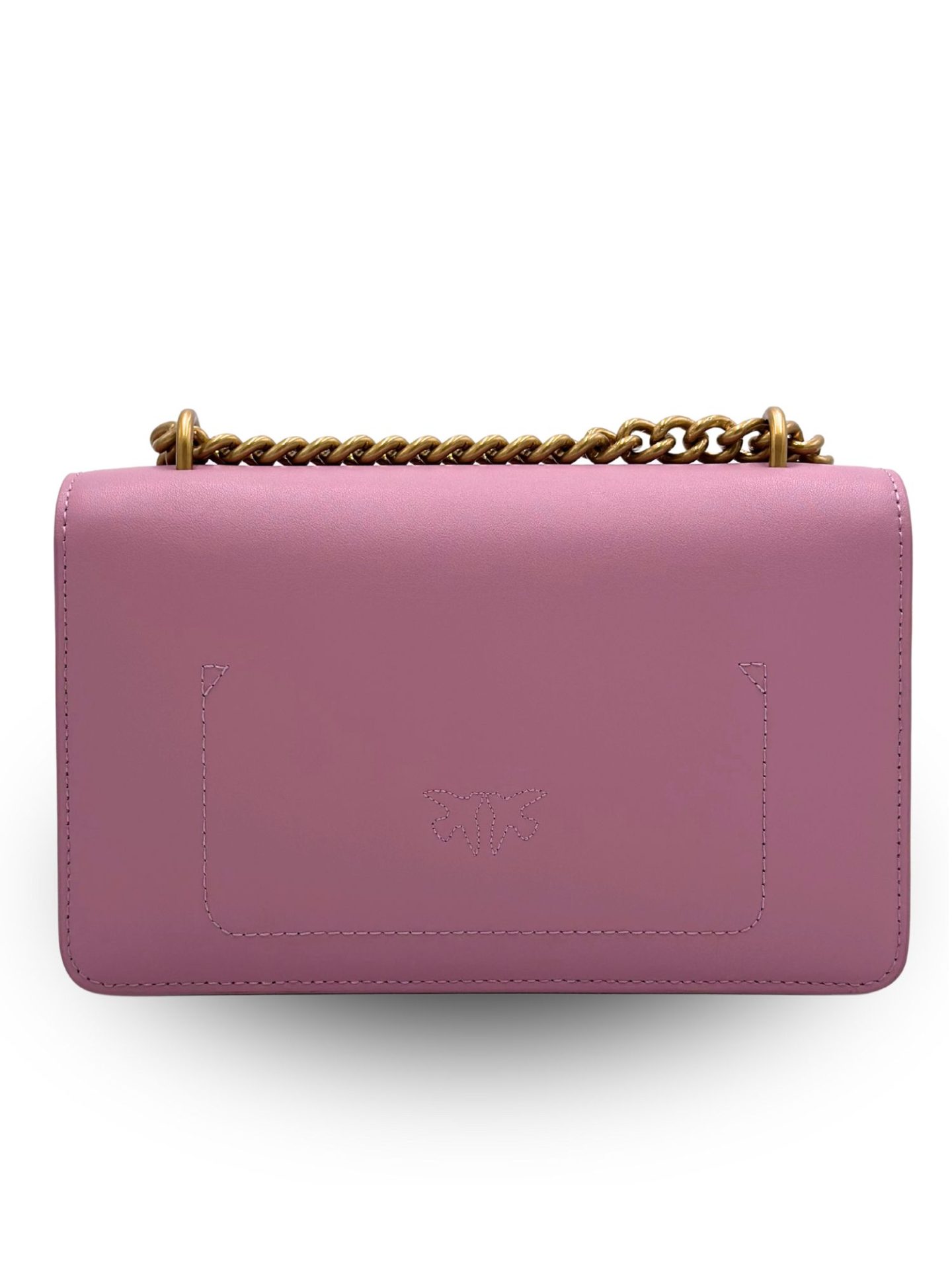 Torebka zachwyca starannością wykonania i dbałością o detale, co widać zarówno na zewnątrz, jak i wewnątrz. Na froncie znajduje się kultowa klamra Pinko Love Birds, będąca symbolem miłości i swobody. Została wykonana w złotym kolorze, który doskonale kontrastuje z pastelowym odcieniem różu. Z tyłu torebka pozostaje gładka, dzięki czemu całość prezentuje się spójnie i minimalistycznie. Dodatkowo złoty łańcuszek z miękką skórzaną wstawką nie tylko podnosi walory estetyczne, lecz także zapewnia komfort noszenia. Wysoka jakość wykonania gwarantuje trwałość, dlatego torebka posłuży Ci przez wiele sezonów.