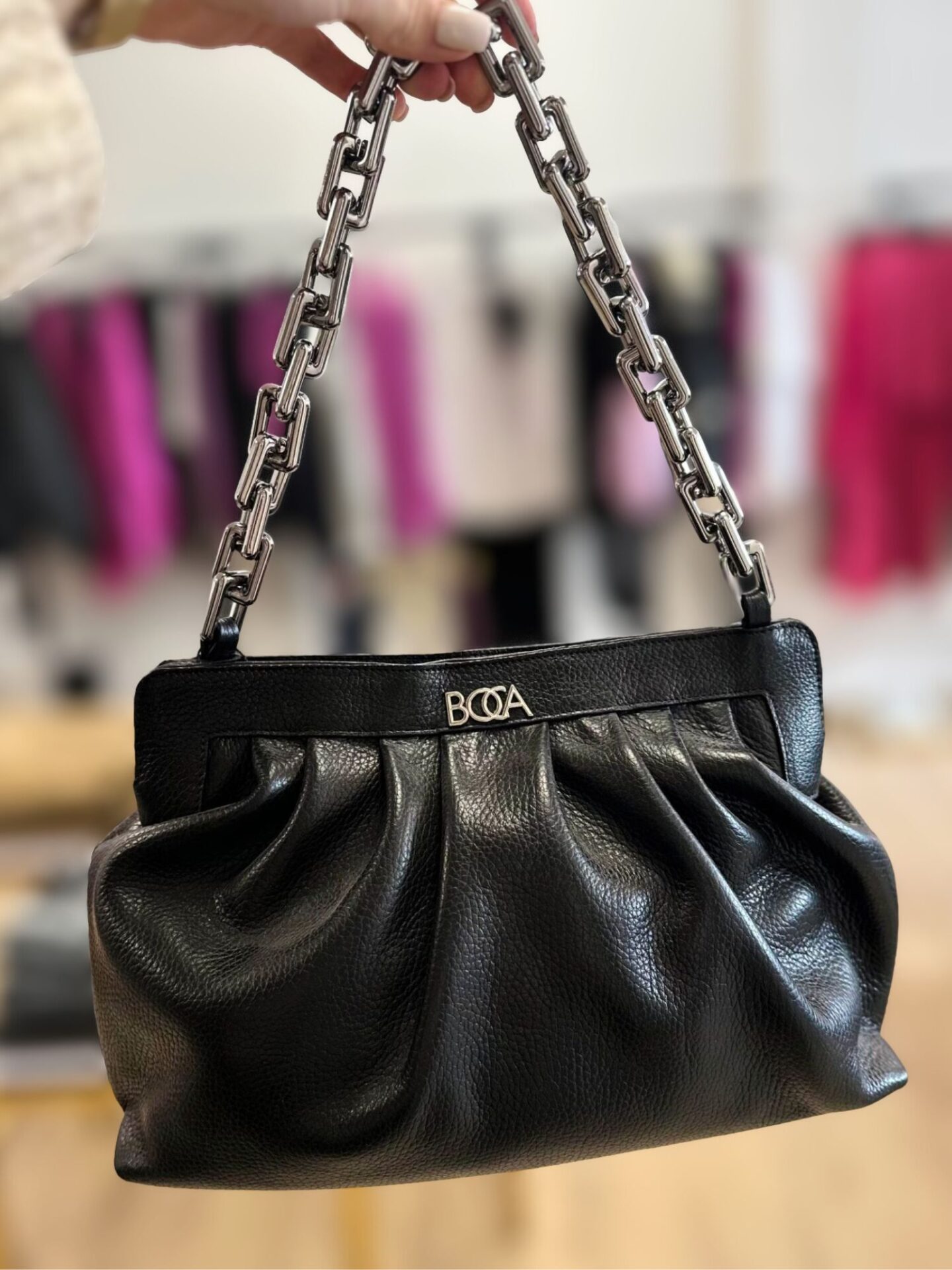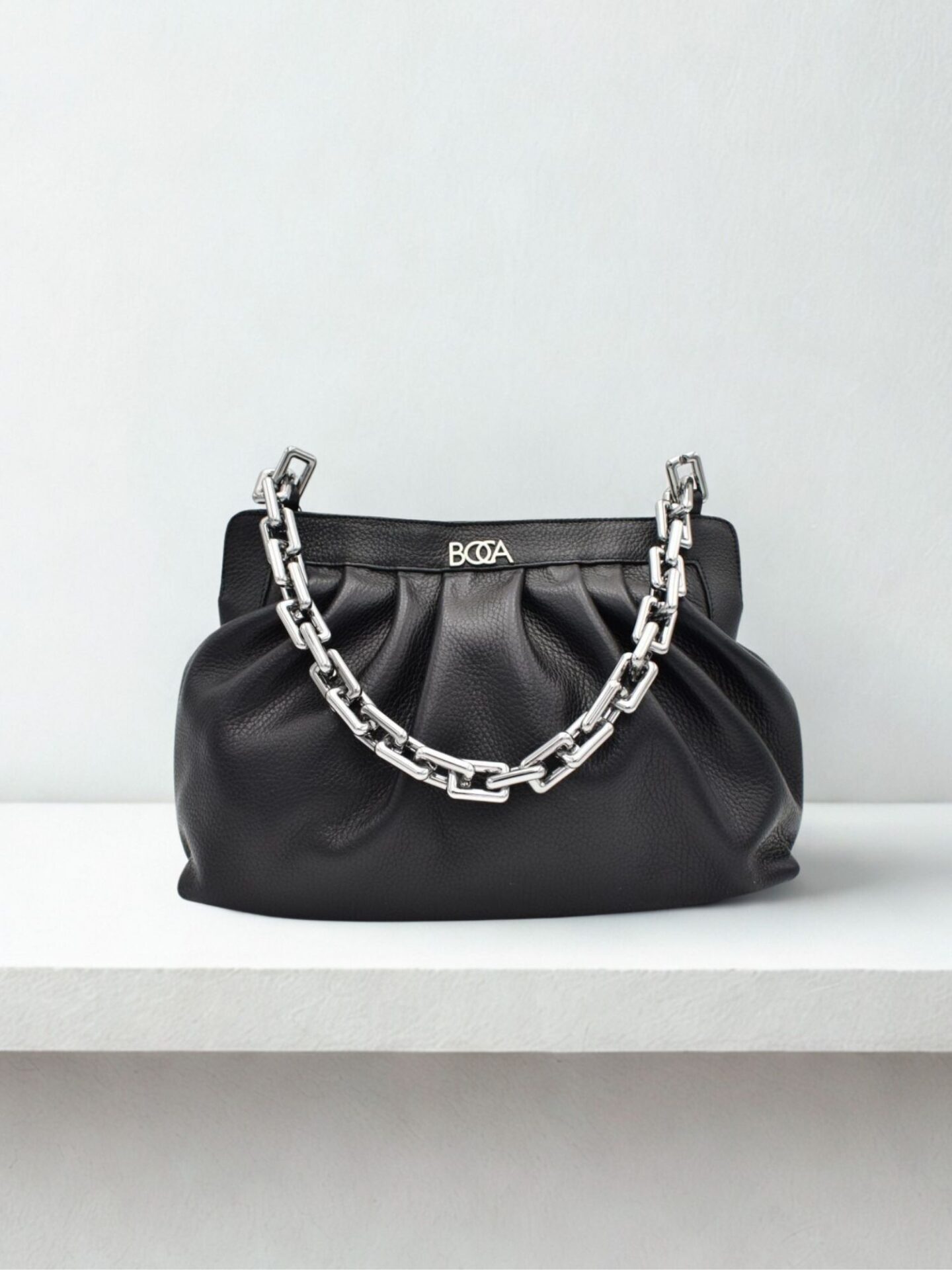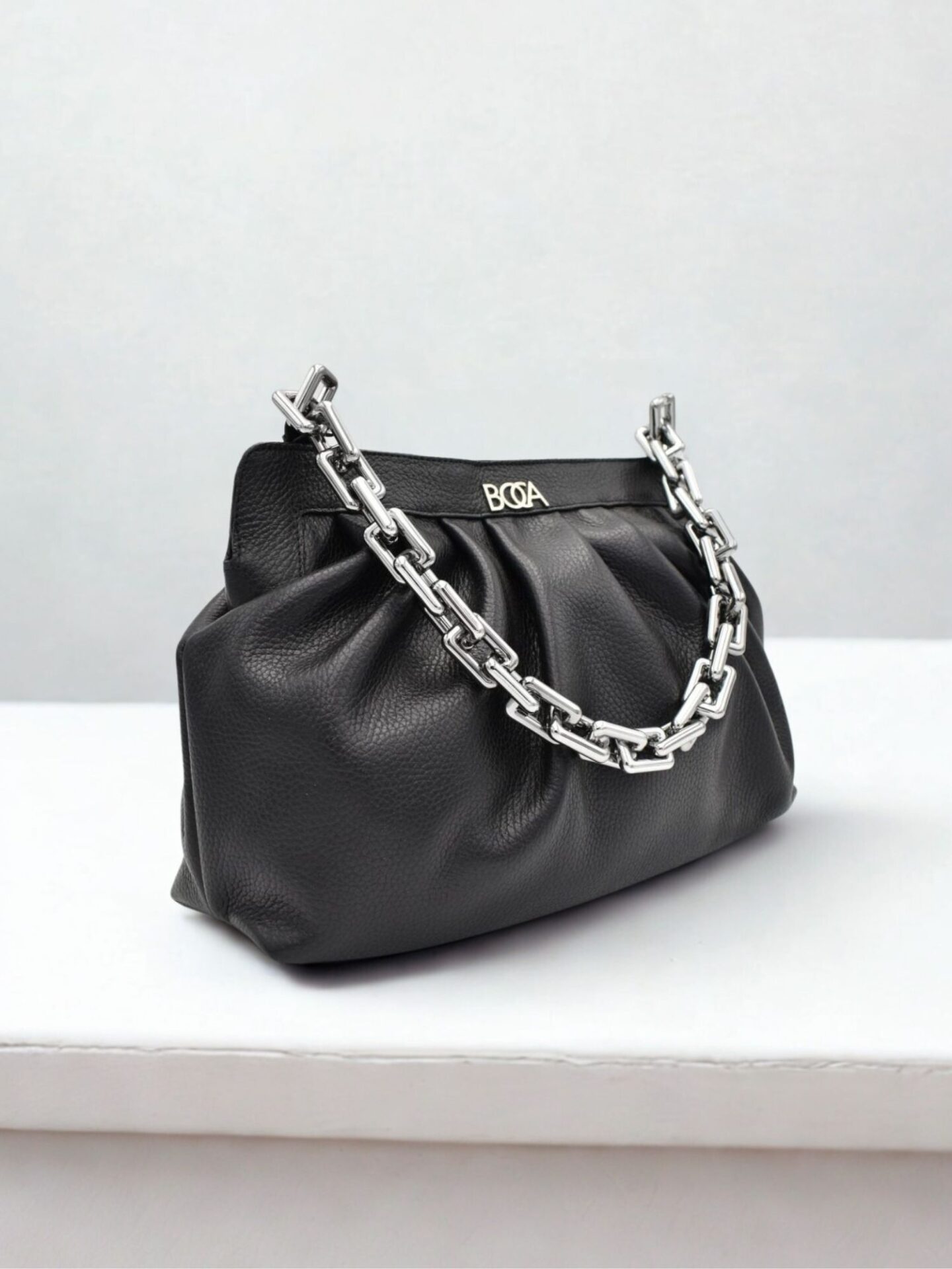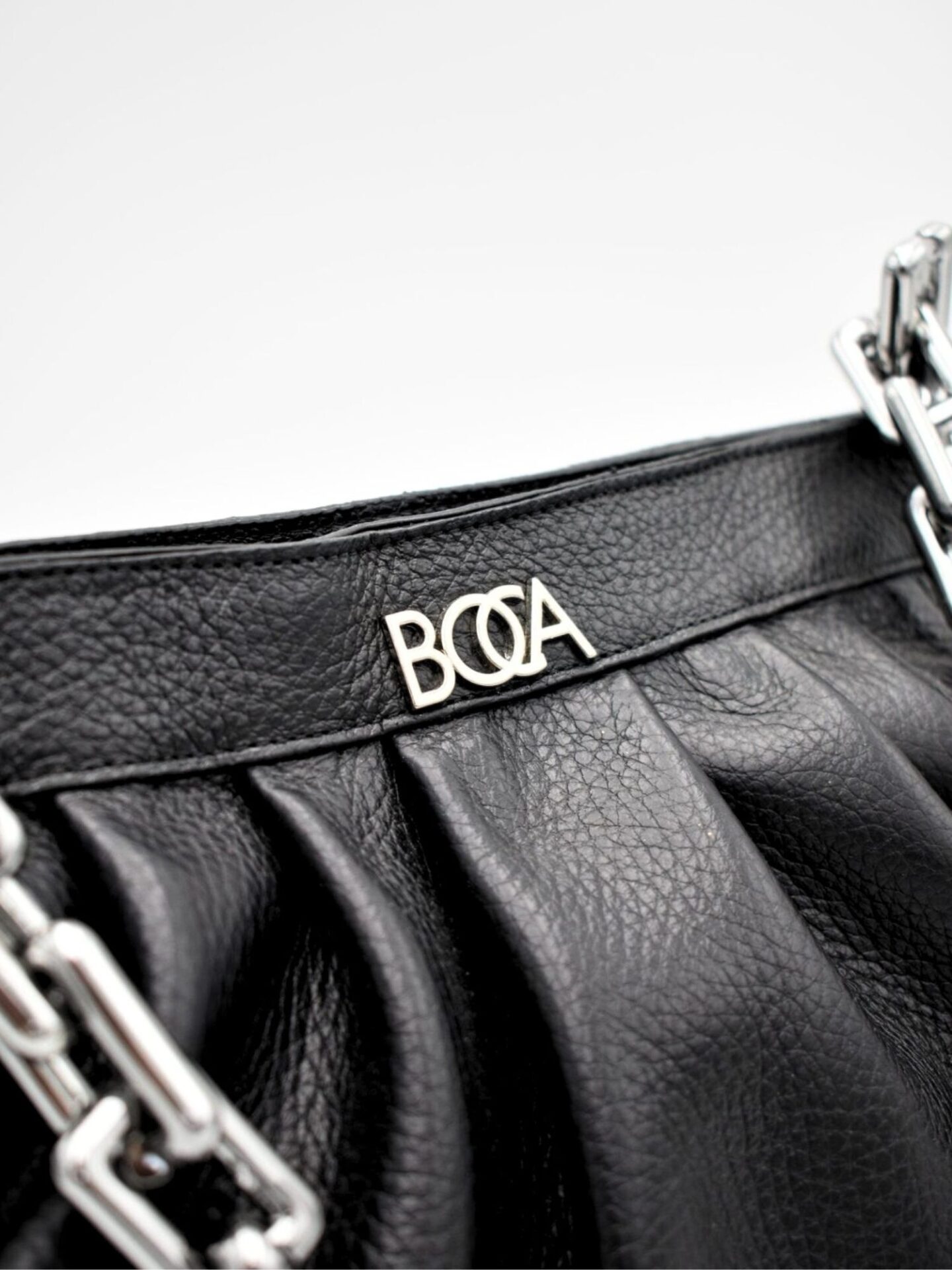 Czarna skórzana torebka Boca wyróżnia się eleganckimi, metalowymi akcentami. Posiada masywny łańcuch, który stanowi zarówno uchwyt, jak i ozdobę. Jego chromowane wykończenie dodaje torebce nowoczesnego charakteru. Tworzy harmonijne połączenie z głęboką czernią skóry. Dodatkowo, na przodzie torebki widnieje dyskretne, ale widoczne logo marki. Ten element podkreśla jej prestiżowy charakter. Należy zauważyć, że łańcuch jest jednocześnie lekki i wygodny. Sprawia to, że noszenie torebki jest prawdziwą przyjemnością.