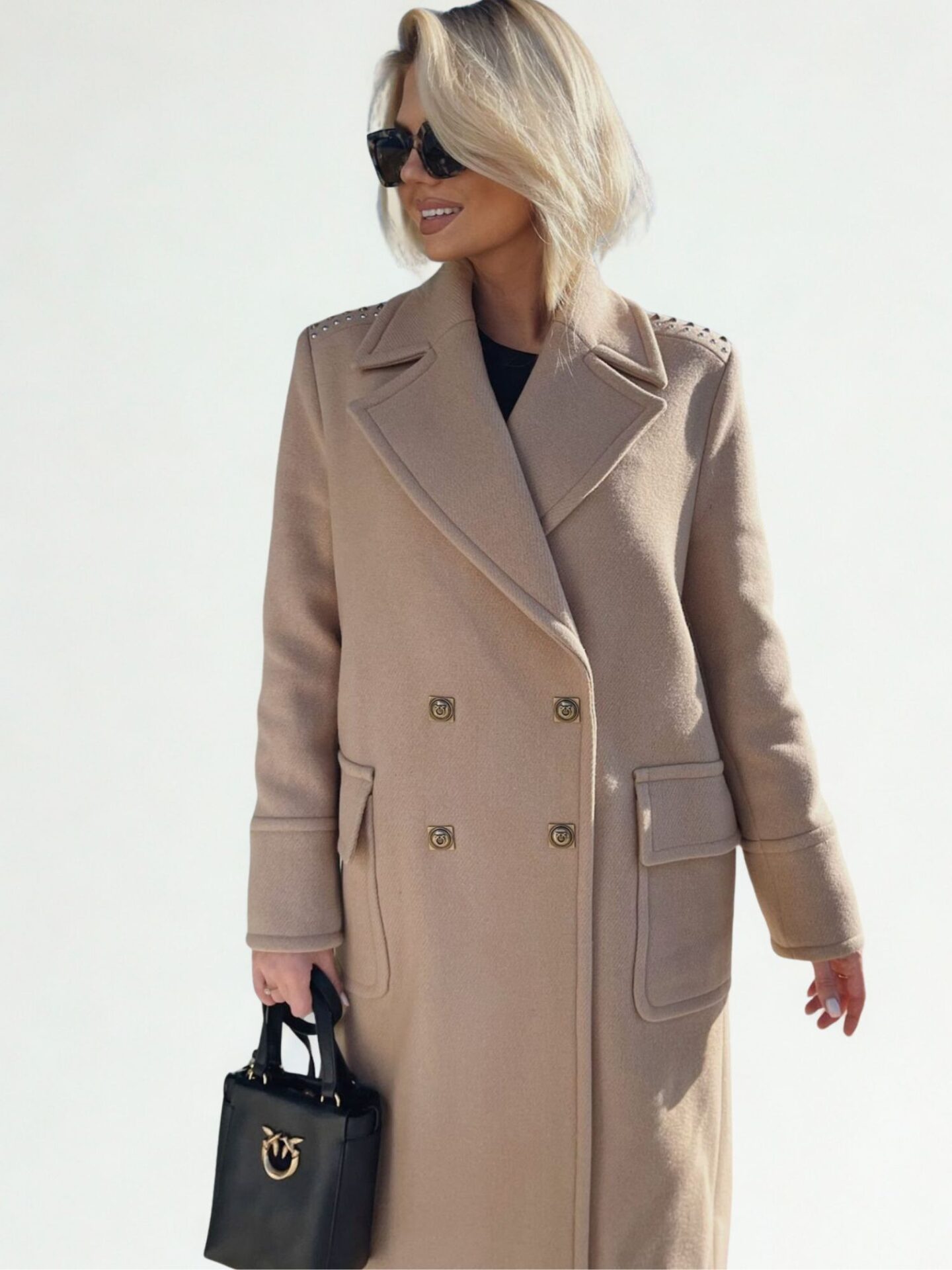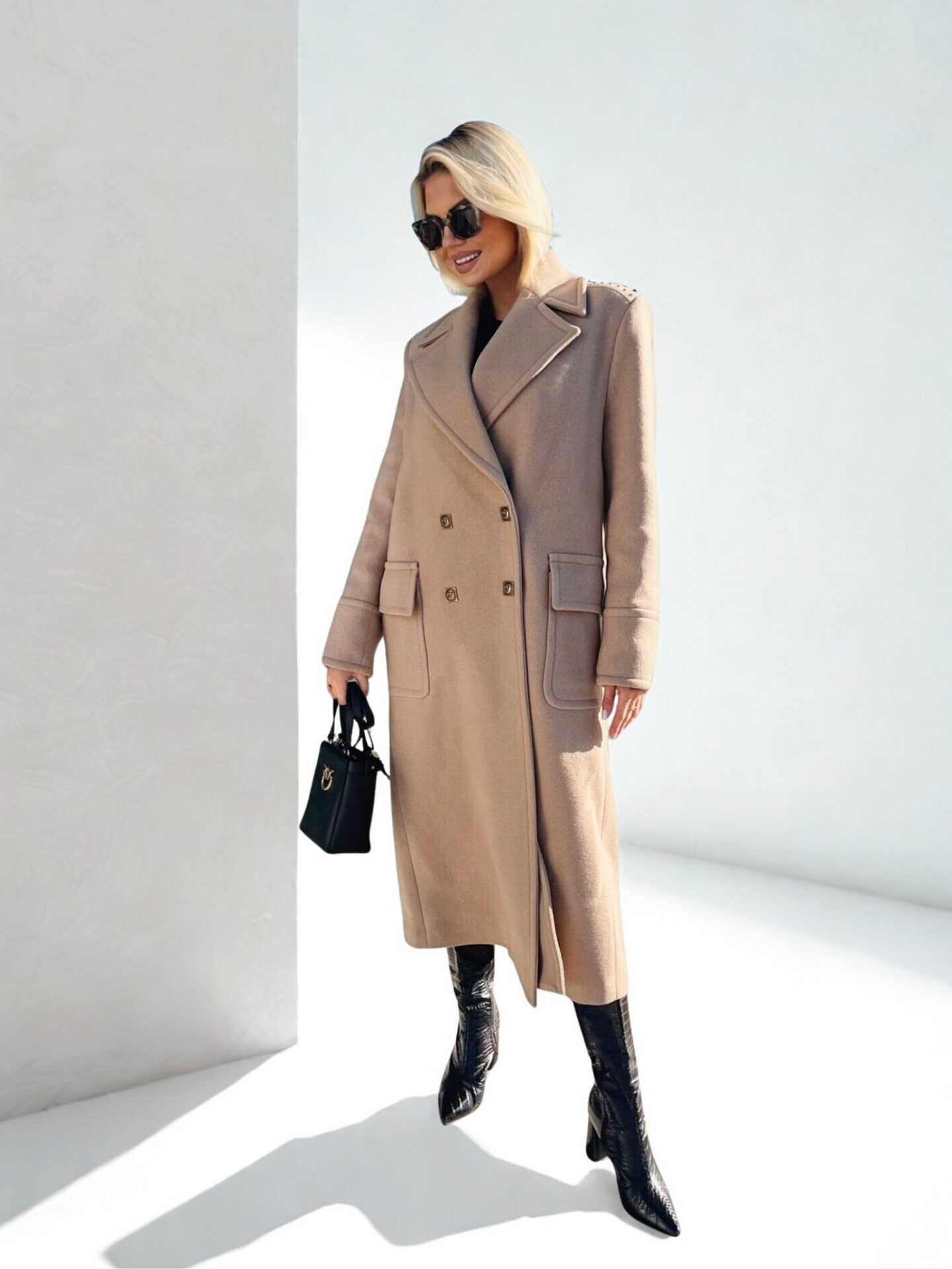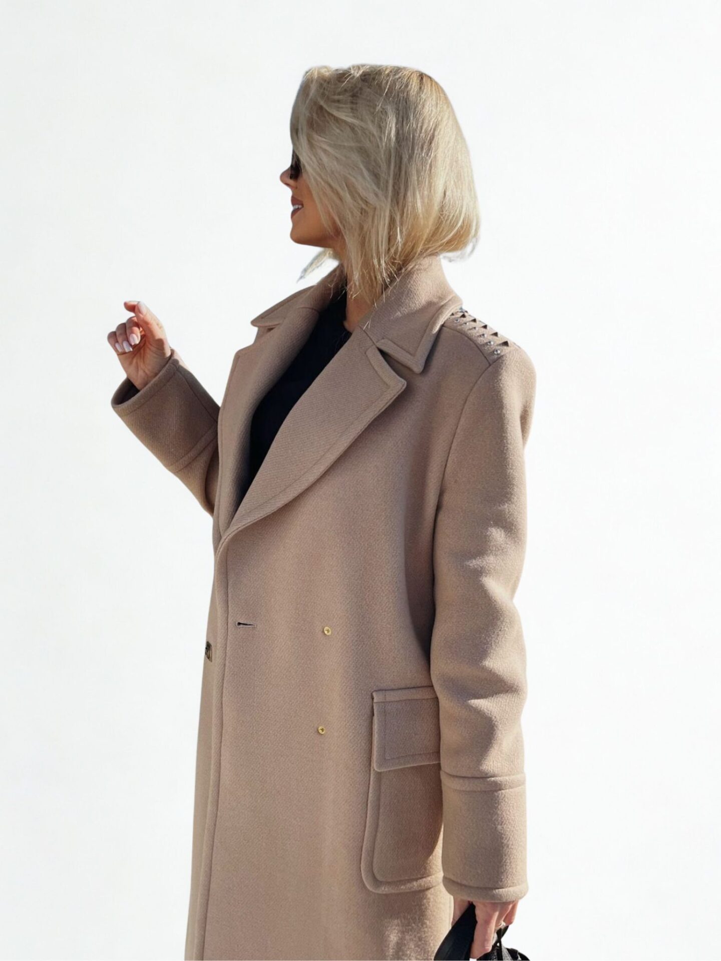 Ten model przyciąga uwagę nie tylko fasonem, ale również detalami, które nadają mu niepowtarzalnego charakteru. Dwurzędowe zapięcie na złote guziki to element klasyczny, ale dzięki ozdobnym ćwiekom na ramionach płaszcz zyskuje nowoczesny akcent. Subtelne przeszycia podkreślają konstrukcję ramion, dodając całej sylwetce wyrazistości i lekko militarny sznyt. Dzięki temu płaszcz świetnie sprawdza się zarówno w eleganckim wydaniu, jak i w bardziej odważnych stylizacjach. Co więcej, obecność dużych, praktycznych kieszeni zapewnia wygodę na co dzień.