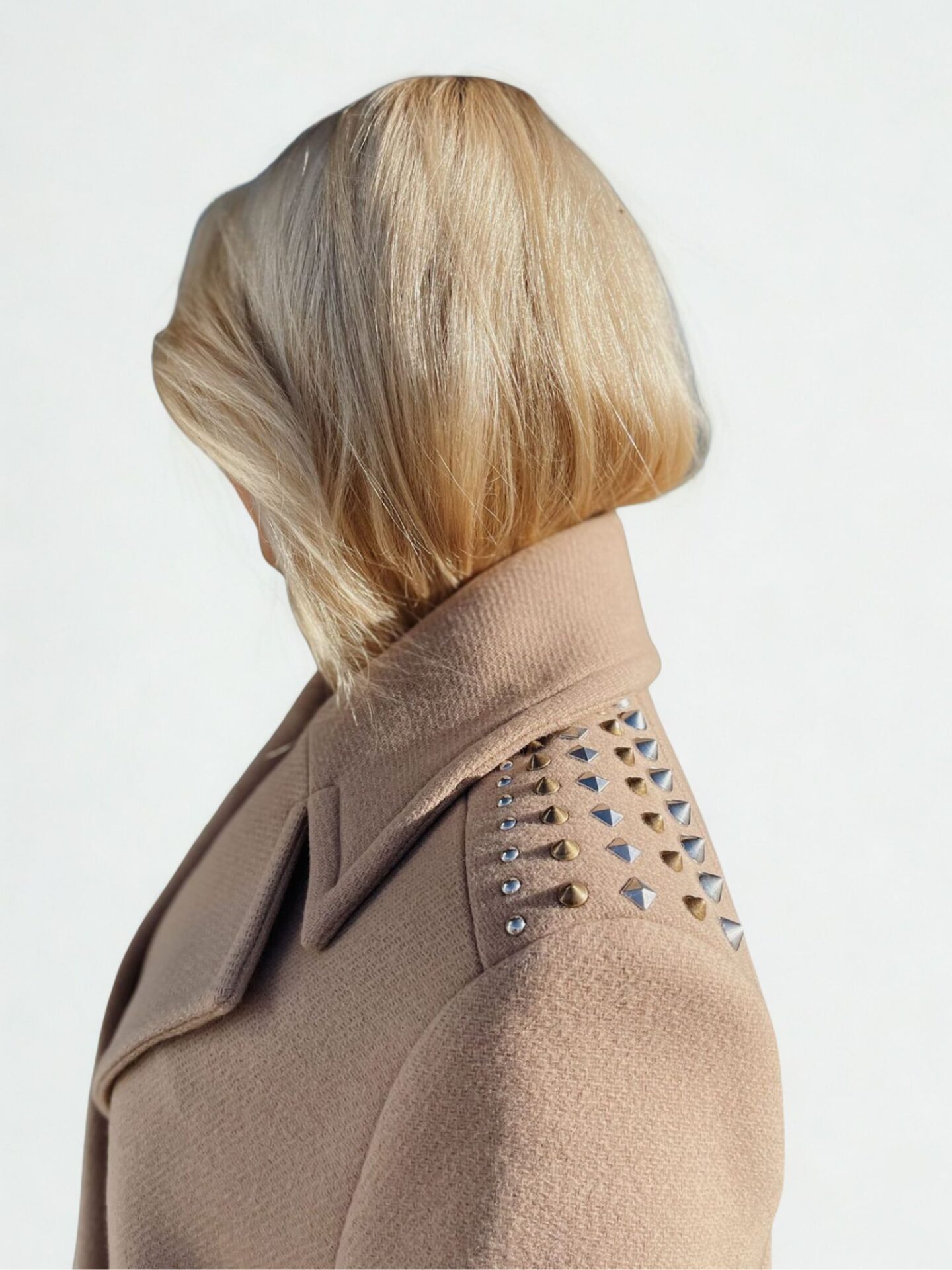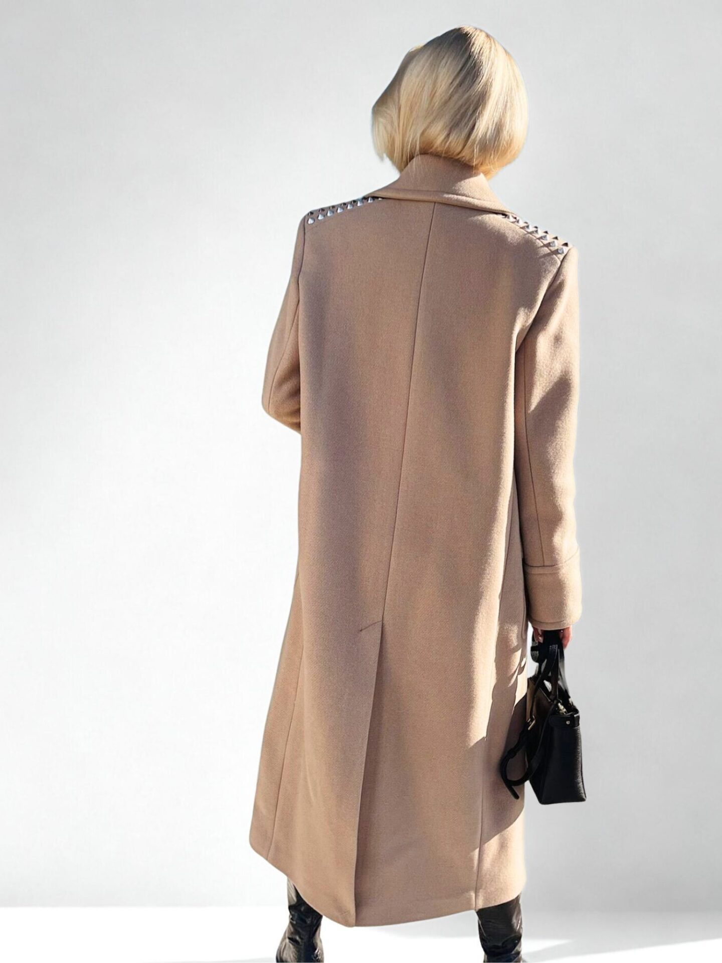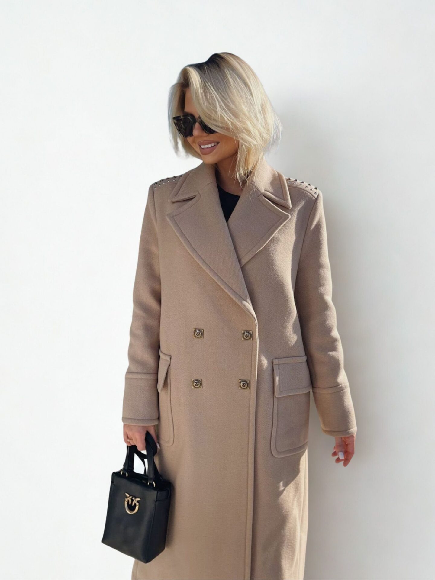 Ten model przyciąga uwagę nie tylko fasonem, ale również detalami, które nadają mu niepowtarzalnego charakteru. Dwurzędowe zapięcie na złote guziki to element klasyczny, ale dzięki ozdobnym ćwiekom na ramionach płaszcz zyskuje nowoczesny akcent. Subtelne przeszycia podkreślają konstrukcję ramion, dodając całej sylwetce wyrazistości i lekko militarny sznyt. Dzięki temu płaszcz świetnie sprawdza się zarówno w eleganckim wydaniu, jak i w bardziej odważnych stylizacjach. Co więcej, obecność dużych, praktycznych kieszeni zapewnia wygodę na co dzień.