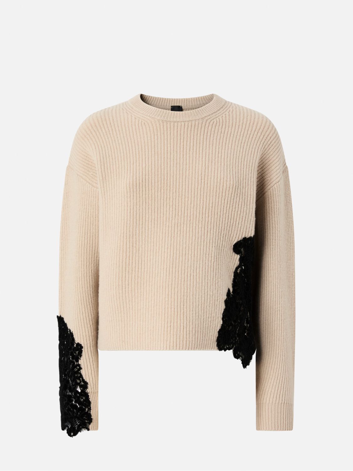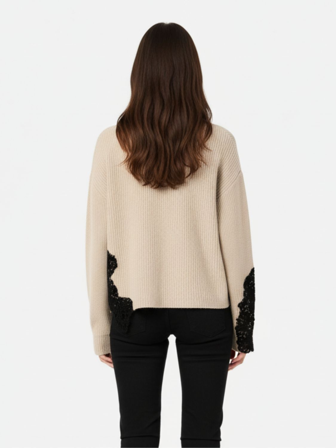 Największym atutem modelu jest kontrastowa, czarna koronka – umieszczona asymetrycznie po bokach oraz na rękawach. To właśnie te dodatki nadają swetrowi kobiecego charakteru i sprawiają, że klasyczna forma staje się bardziej nowoczesna. Takie rozwiązanie dodaje lekkości całej stylizacji, a jednocześnie przyciąga wzrok, wyróżniając sweter na tle innych modeli. Koronka została wykonana z wysokiej jakości materiału, co zapewnia trwałość i estetykę nawet przy częstym użytkowaniu.