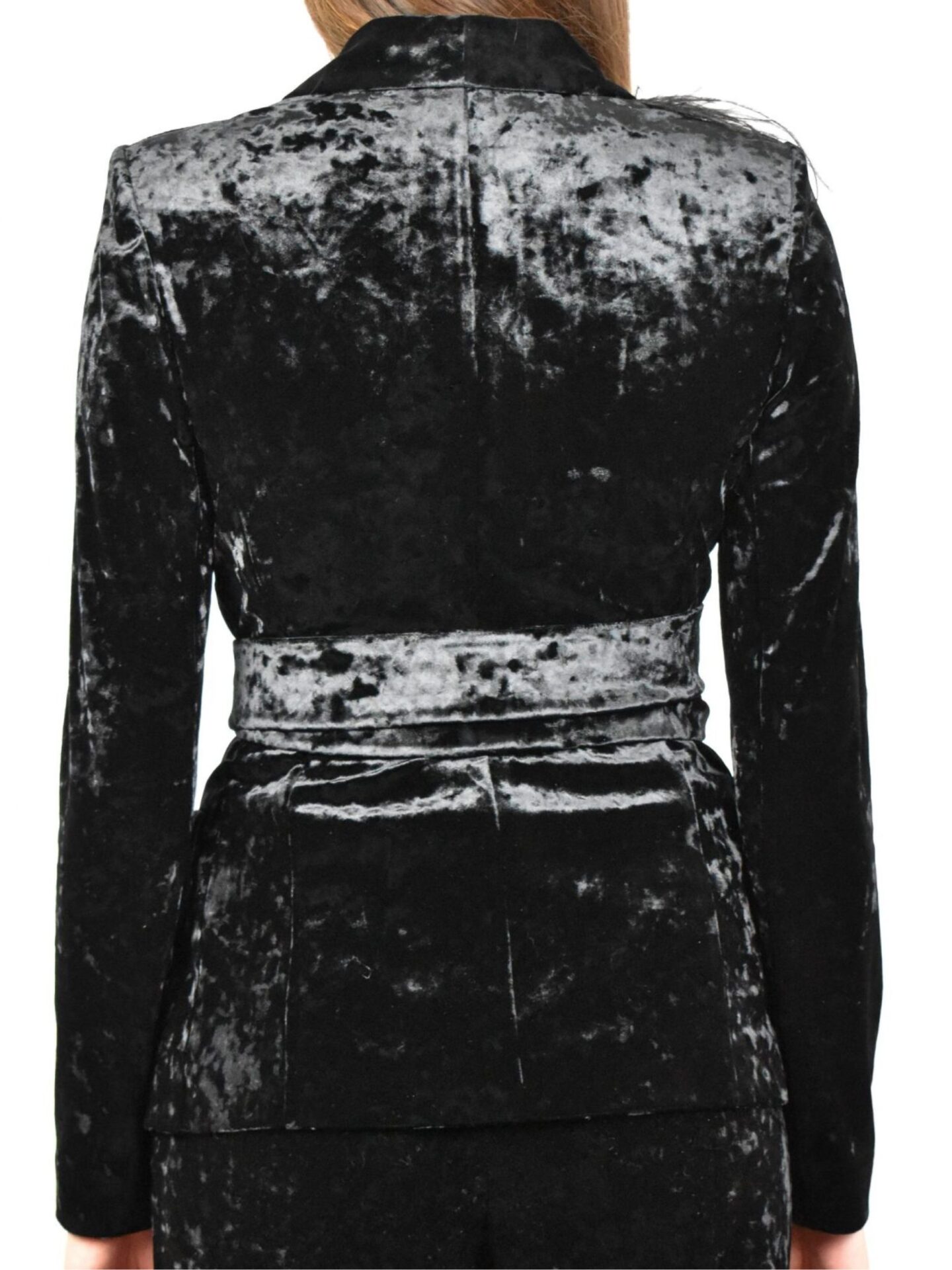 Żakiet marki Patrizia Pepe, który podkreśla elegancję w każdym calu, łącząc w sobie luksus weluru z wyjątkowymi detalami. To ubranie, które wyróżnia się nie tylko klasycznym designem, ale także nietypowymi akcentami, nadającymi mu niepowtarzalnego charakteru. Czarny żakiet oferuje nie tylko wyjątkowy wygląd, ale również niesamowite uczucie miękkości i komfortu podczas noszenia. Jego luksusowa struktura zapewnia niezrównaną estetykę. Żakiet ozdobiony jest odpinanymi piórami, które dodają mu wyjątkowego uroku. Te eleganckie, czarne strusie pióra umieszczone po prawej stronie nadają mu niezwykłej finezji i ekskluzywnego wyglądu. W komplecie z żakietem znajduje się subtelny pasek, który można wiązać w talii, dodając wyjątkowy akcent i podkreślając sylwetkę. To doskonałe dopełnienie elegancji i stylu, umożliwiające idealne dopasowanie do figury.